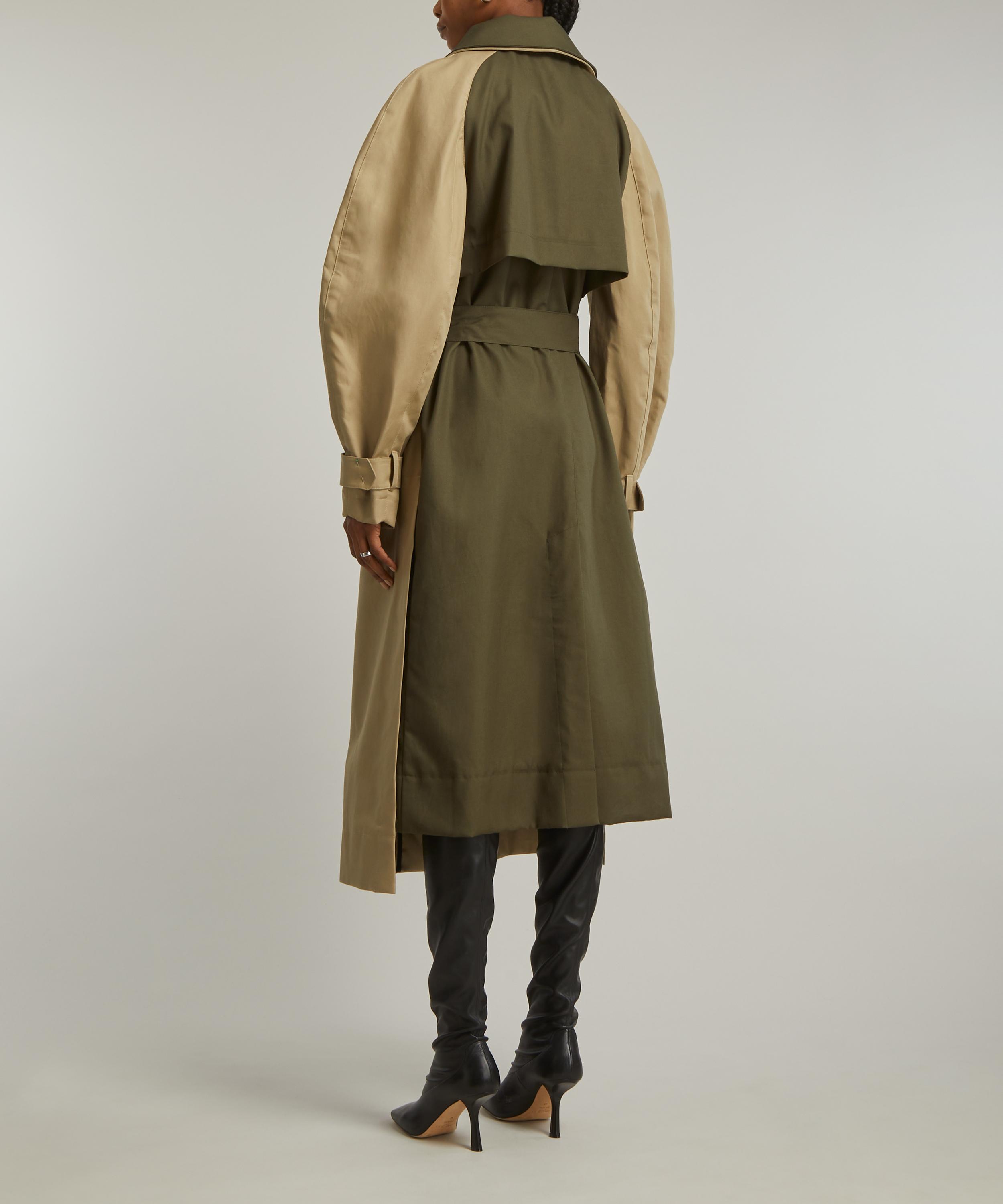 An elevated take on a classic design, this deconstructed trench coat is designed with a double-layered front which consists of contrasting khaki and beige panels. Crafted from a firm and luxurious cotton twill fabric, this water-repellent coat is structured with rounded raglan sleeves, and a double-breasted front closure, which is secured with buttons and a cinchable waist belt.