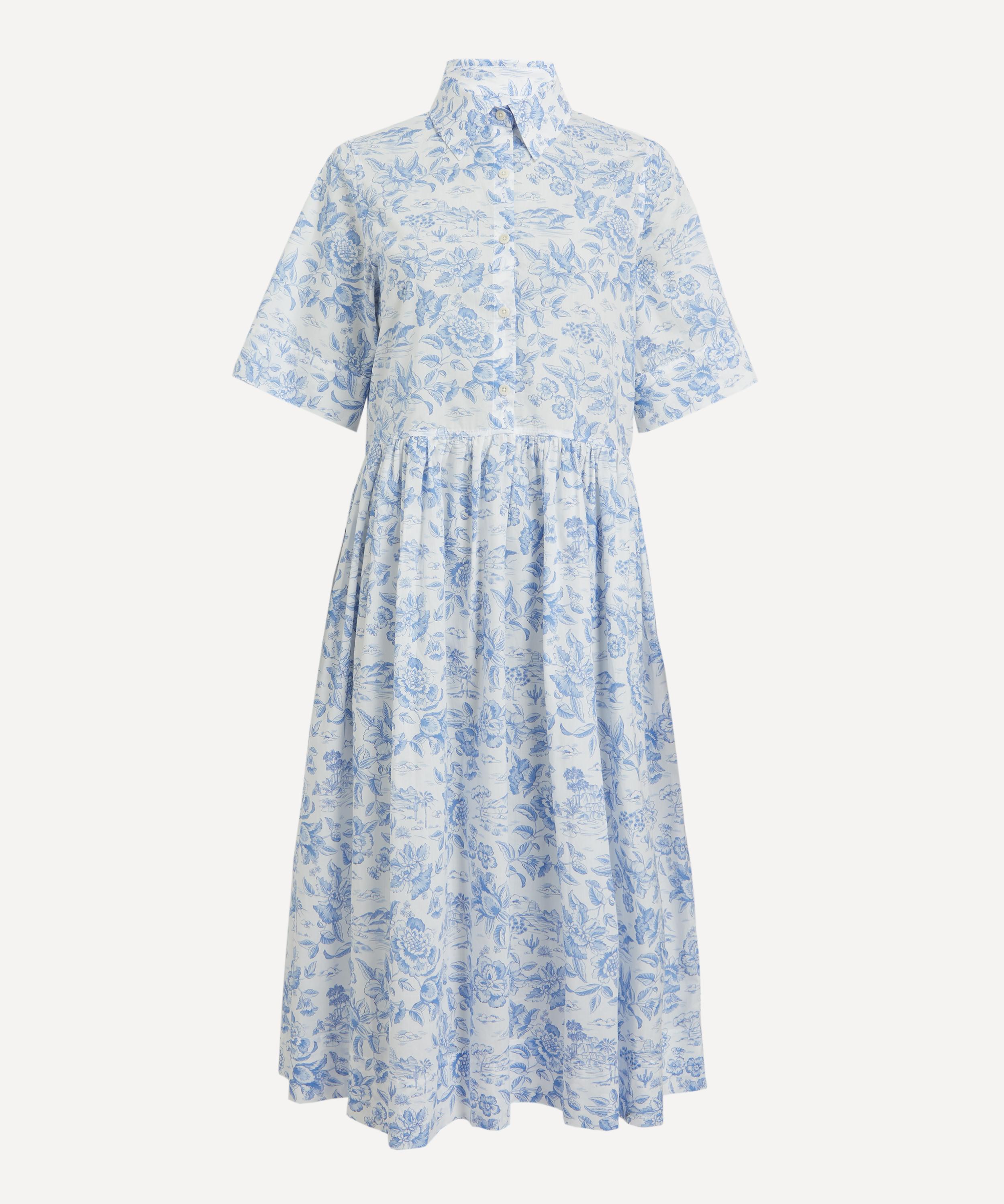Effortlessly elegant and easy-to-wear with its long and loose silhouette, this short sleeve shirt dress is gathered at the waist, and secured with a button closure. Crafted from Tana Lawn™ cotton, which is favoured for its colour-rich surface and smooth, soft hand-feel, it showcases our delightfully charming Delft Lagoon print: Taking its cues from traditional blue and white Delftware pottery, this design depicts detailed landscape scenes within a trail of stylised flowers.