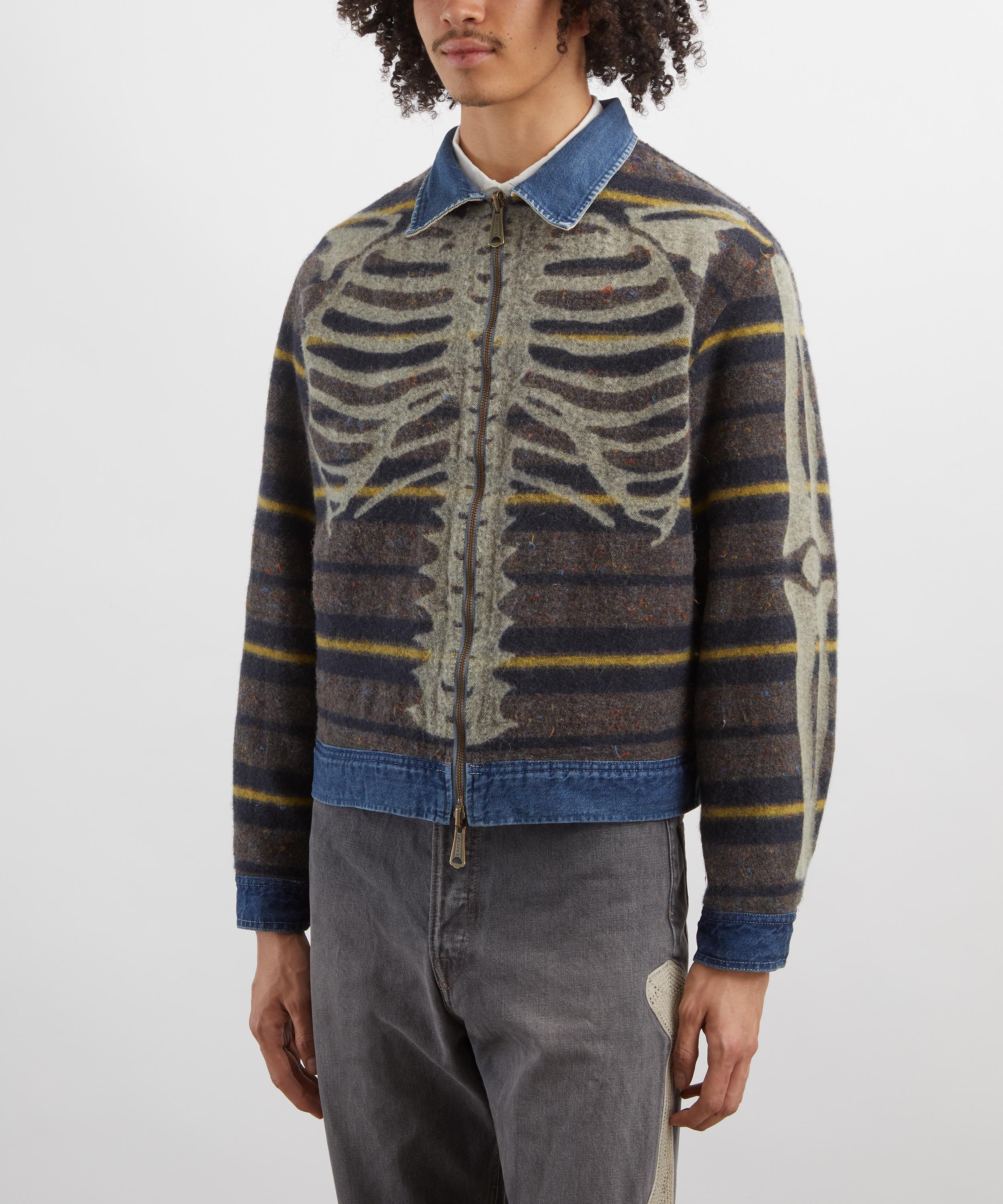 Crafted in Japan, this reversible workwear jacket pairs a 12oz denim exterior with a corduroy collar, zip fastening, and multiple pockets, with a blanket-lined interior detailed with a signature bone motif, offering a versatile and functional outerwear option.