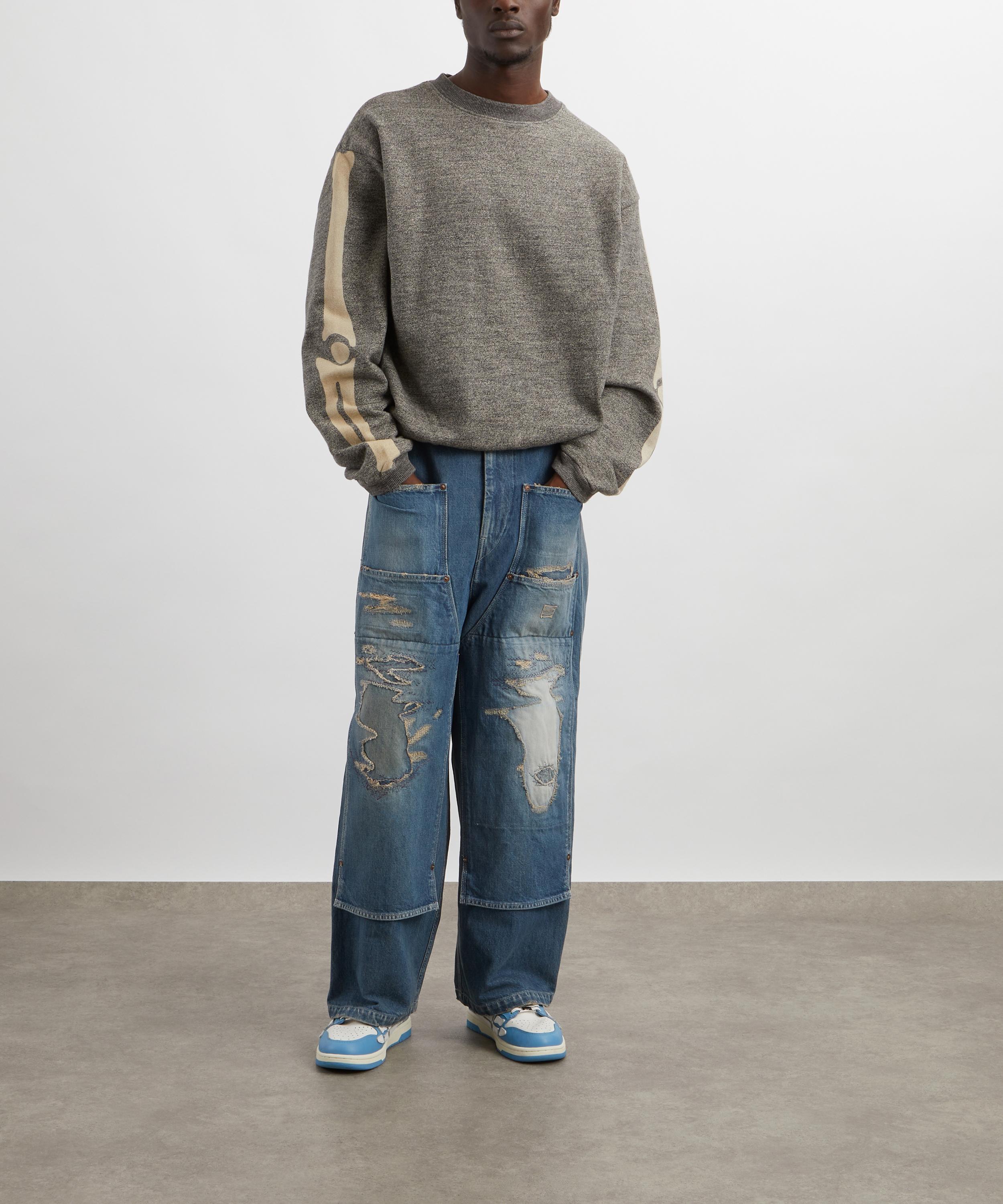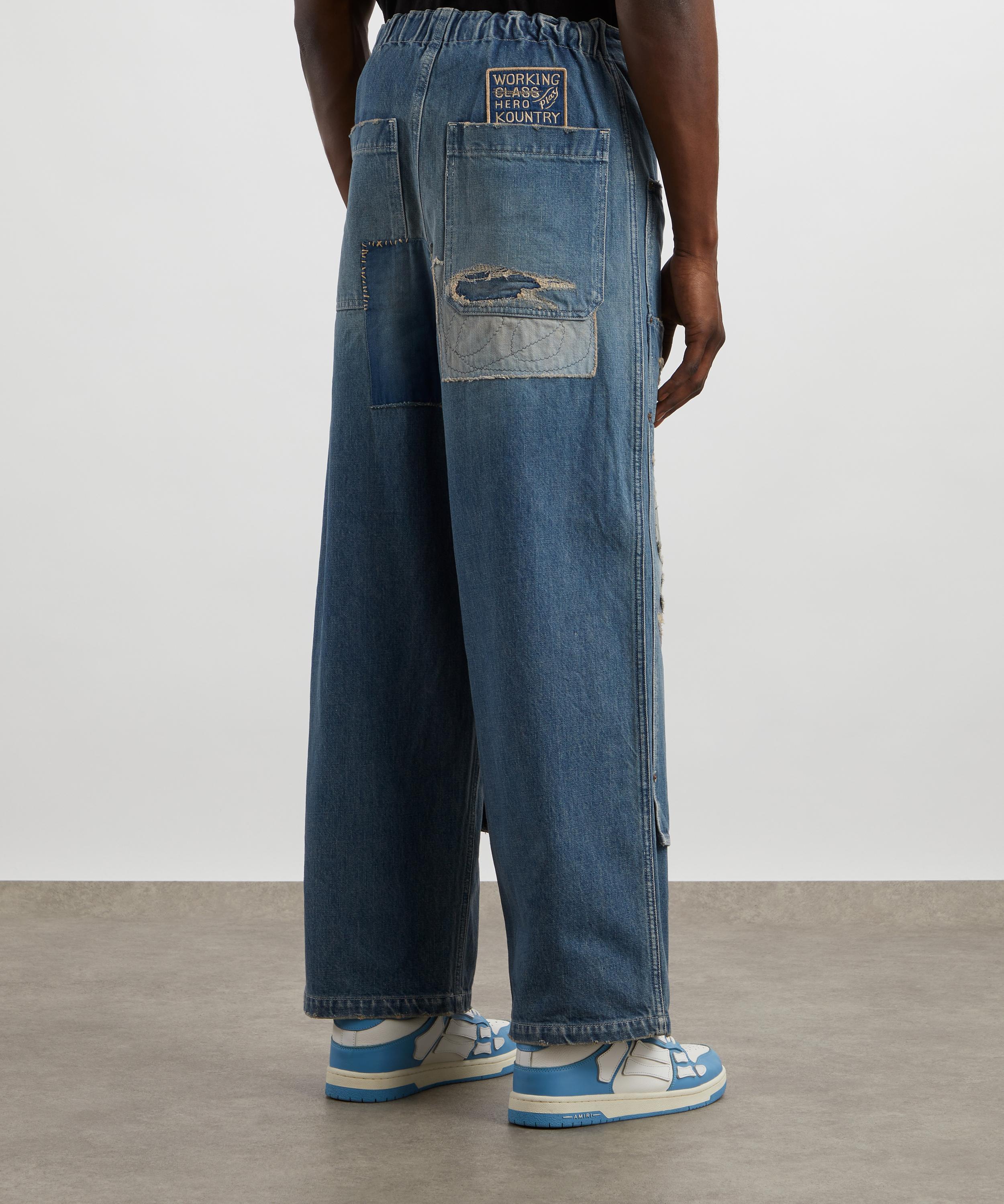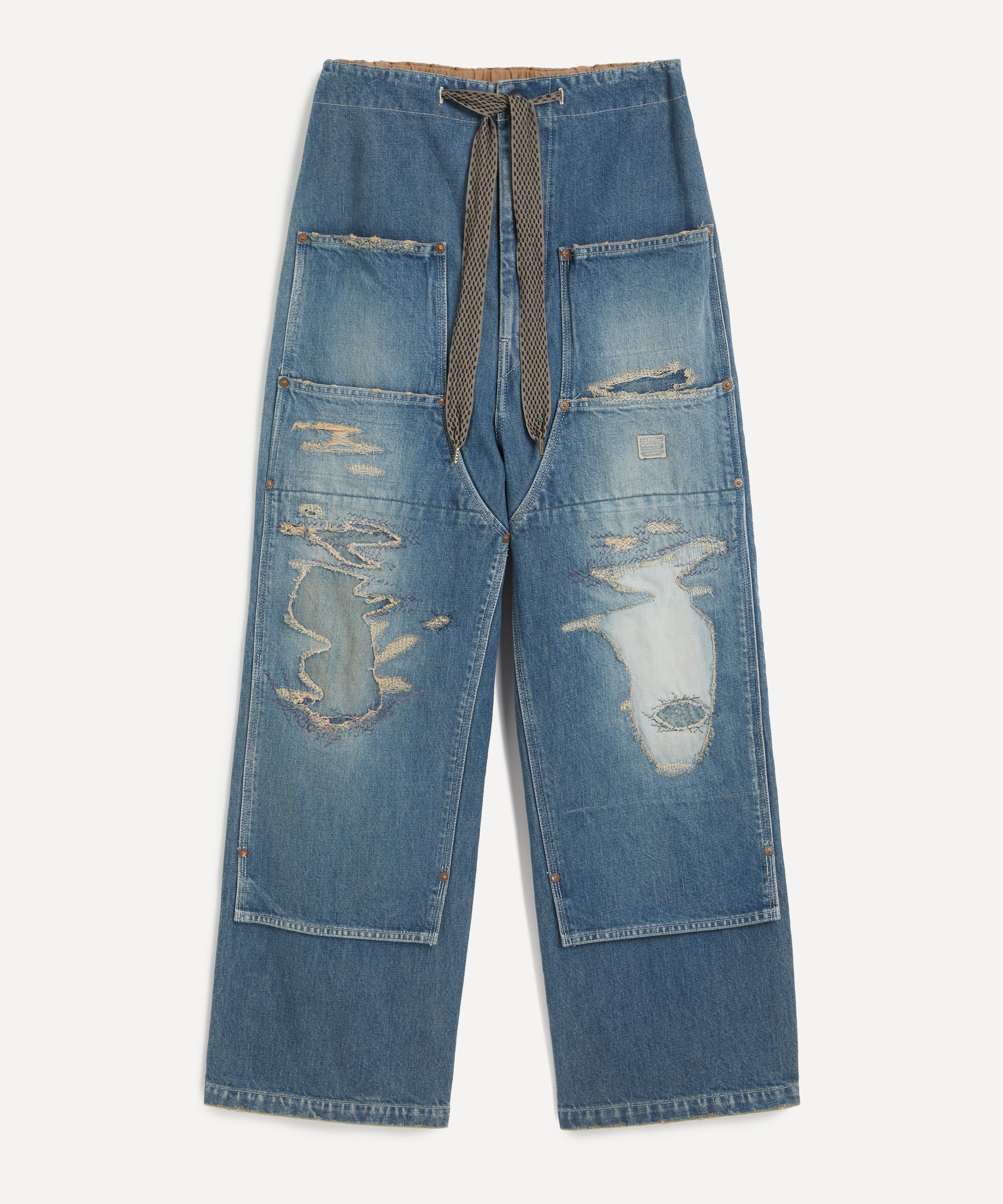 Made in Japan from indigo-dyed cotton denim, these jeans feature signature Kountry factory repair detailing, creating a distressed, lived-in finish. Fitted at the waist with an elasticated drawstring for added comfort, the double-knee reinforcements further enhance their utilitarian aesthetic.