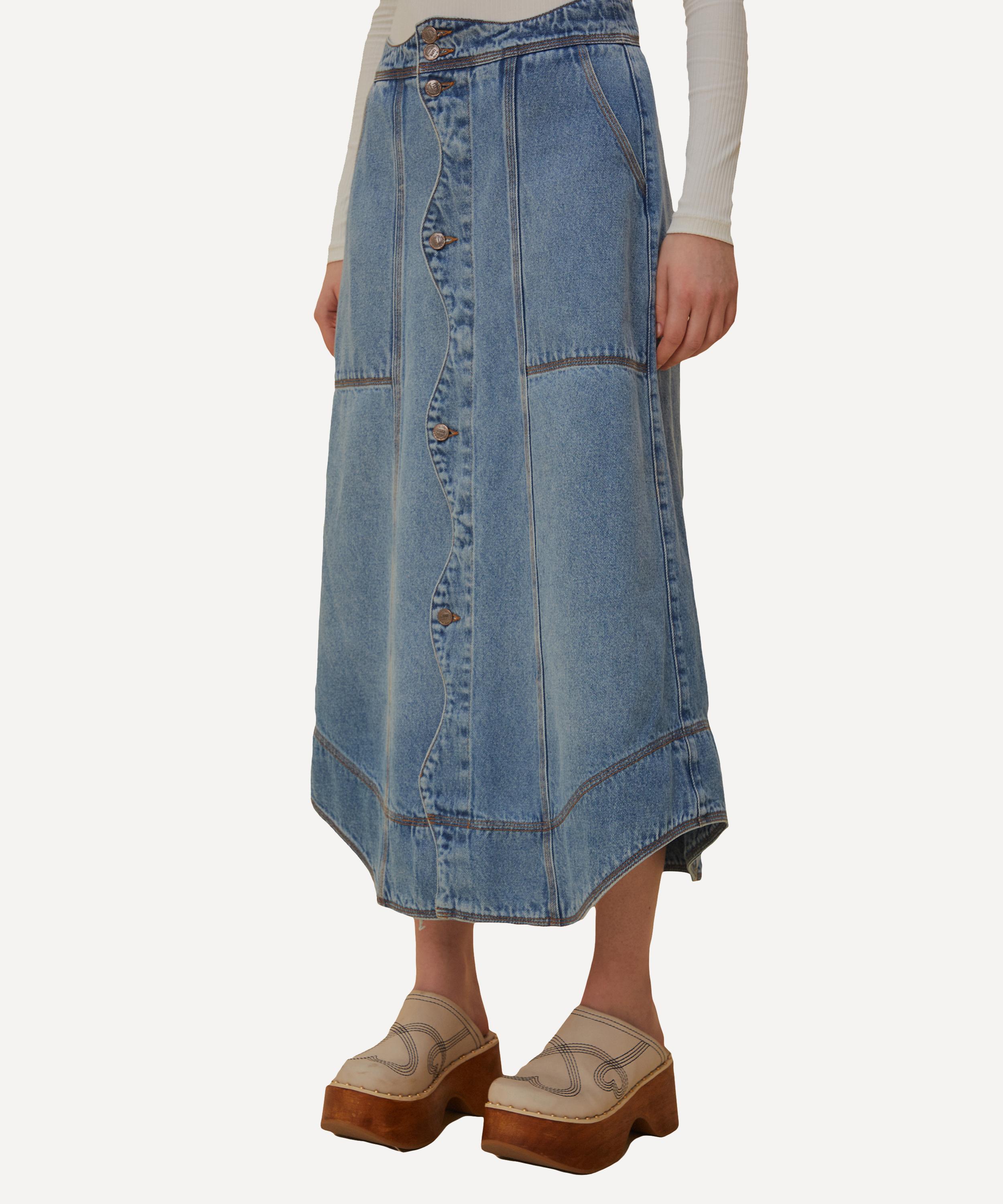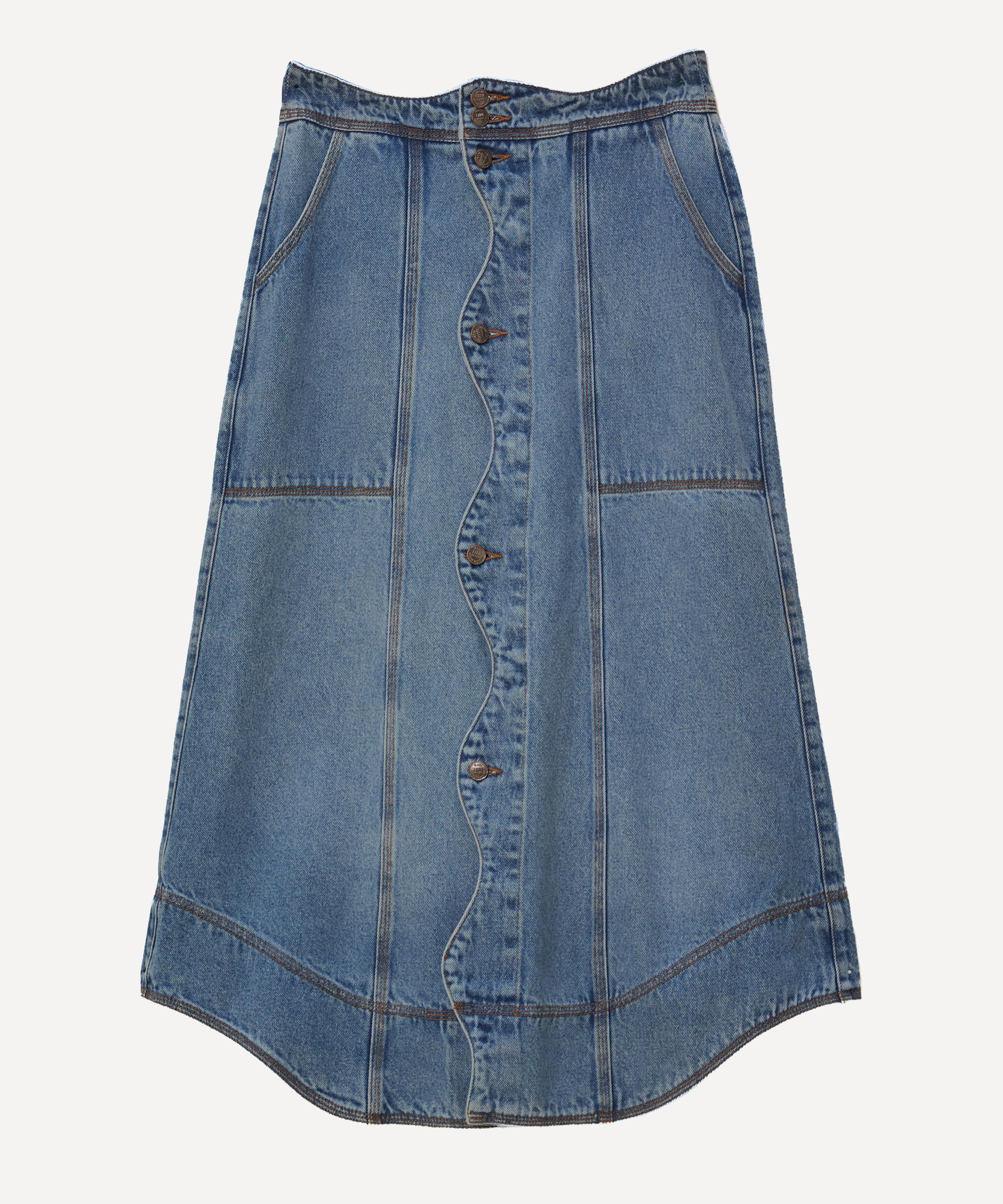 Effortlessly fun with its wavey waistband and placket, this playful denim skirt boasts a flattering A-line silhouette with a rounded hem. Versatile and comfortable, it’s a must-have for your wardrobe.
