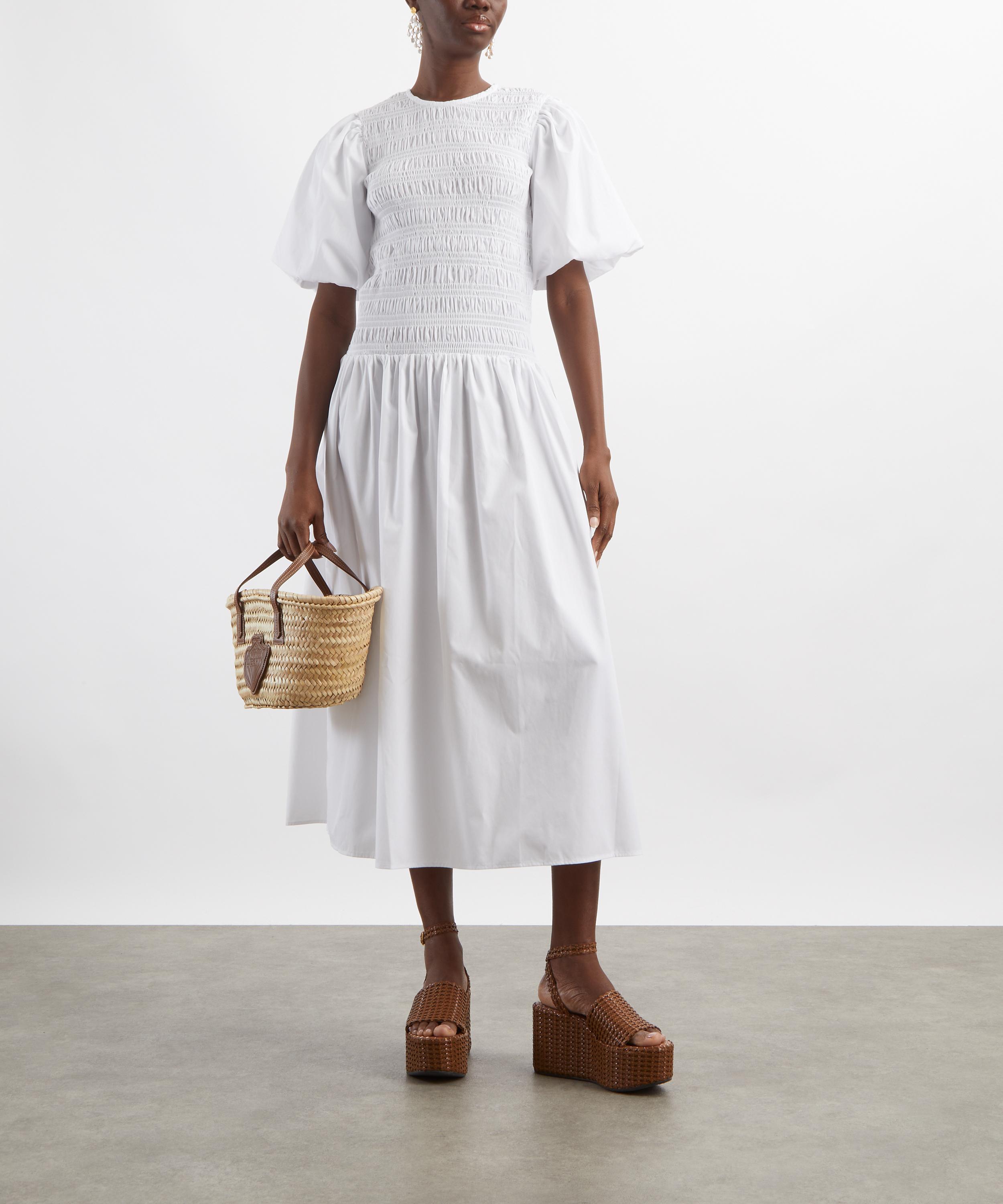 This signature Maria de la Orden style returns for the new season in versatile white - perfect for balmy summer days. Featuring voluminous puff sleeves and a smocked bodice, the fitted top flows into a breezy A-line skirt, creating a beautifully flattering silhouette.