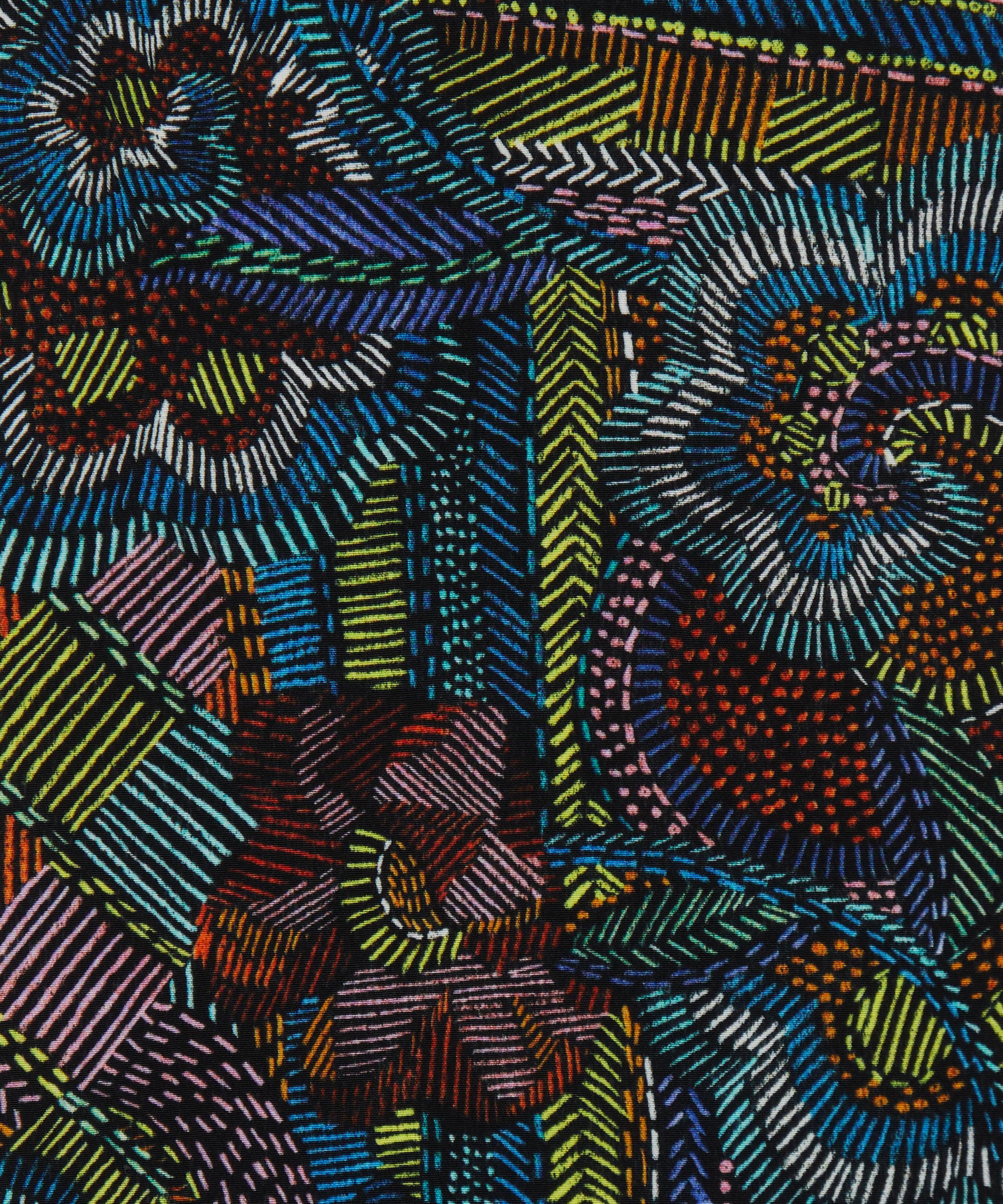 Created in the Liberty design studio using pencil crayon on dark coloured paper, Disco Fever explores the colourful embroideries used to embellish outfits worn during 1970s disco nights. The result is a textural, hand-stitched effect, that showcases a captivating array of overlapping geometric and floral motifs.