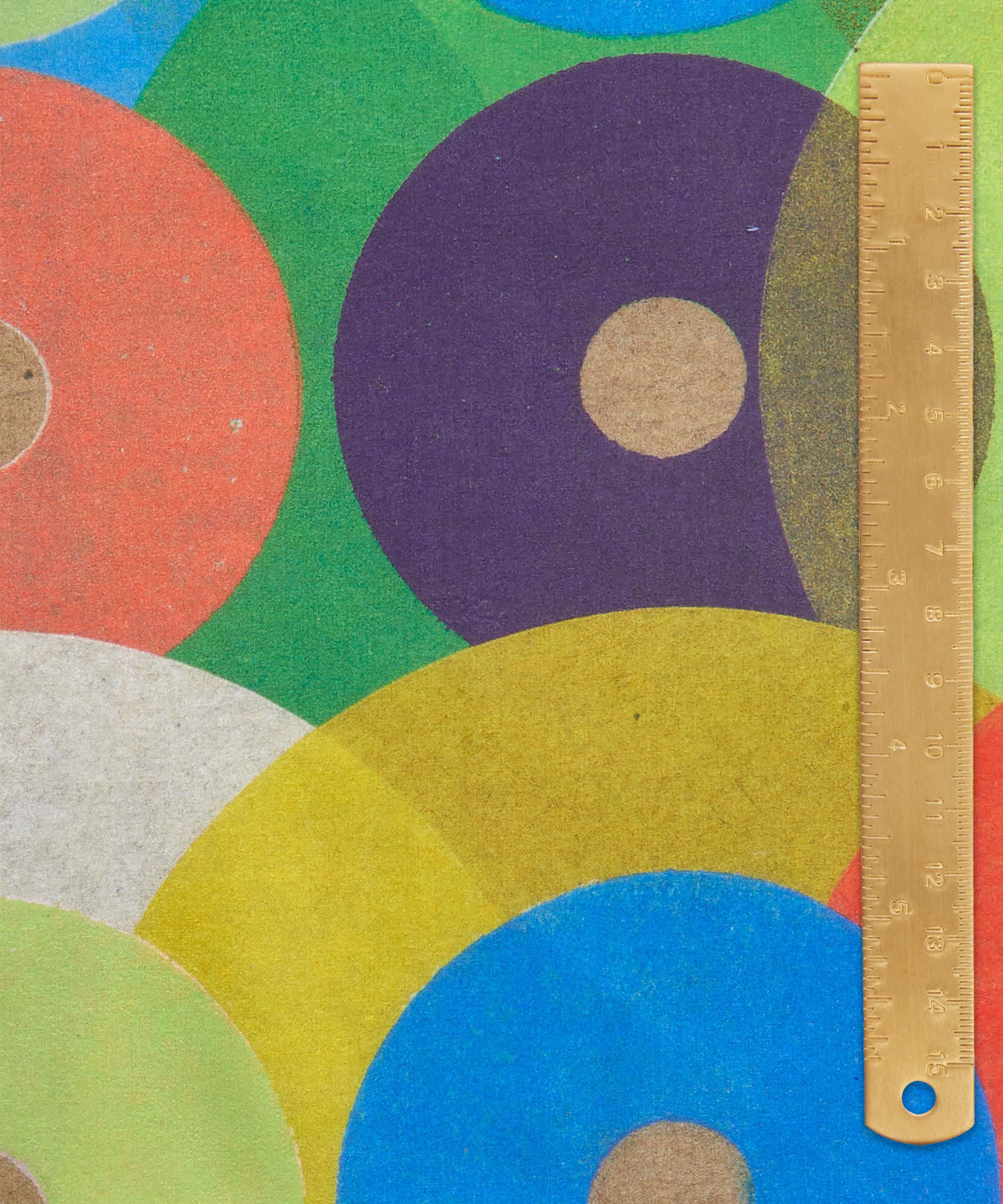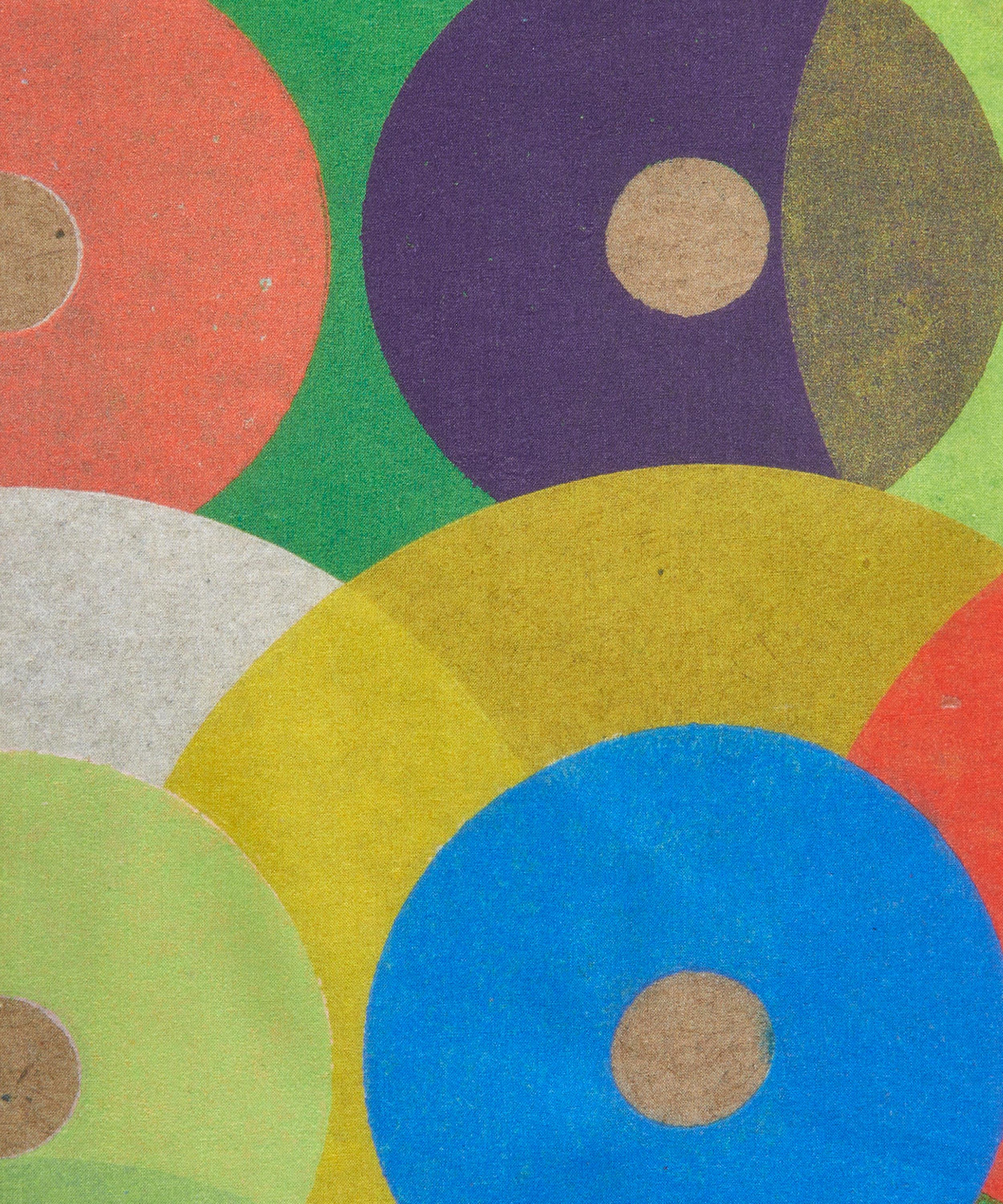 A synthesis of connected rotating discs create a fluid yet grounded structure of circular weaving. Superimposed onto textured paper by the method of letterpress printing, colours shift from opaque to translucent, as if filtered through tessellating light.