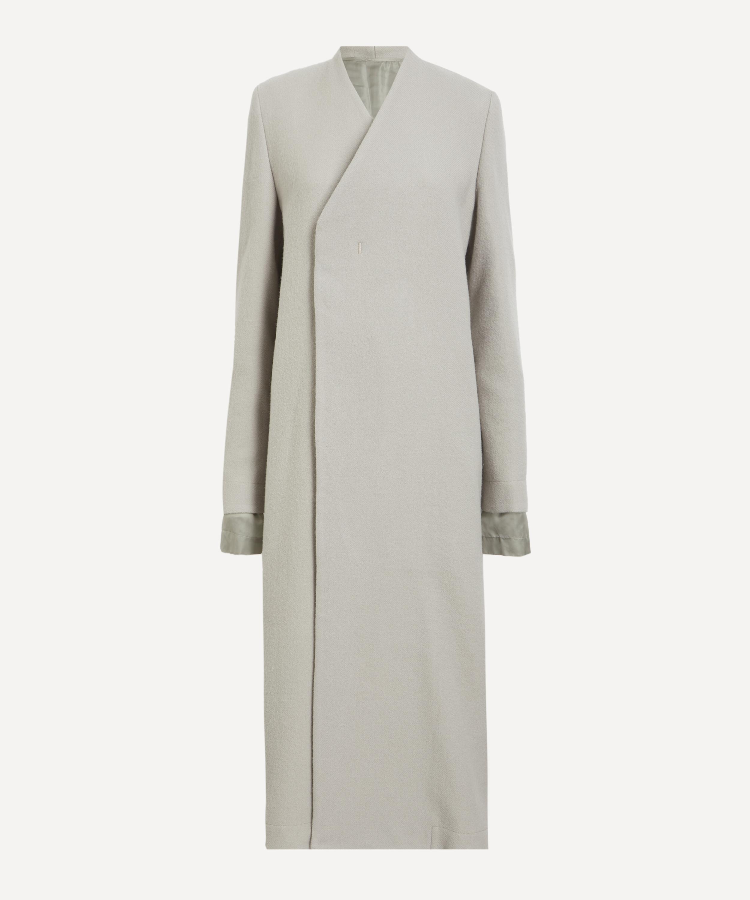 Crafted from wool, this double-breasted coat features a clean V-neckline, concealed button fastening, and contrast satin cuffs—offering a minimalist silhouette with a refined finish.