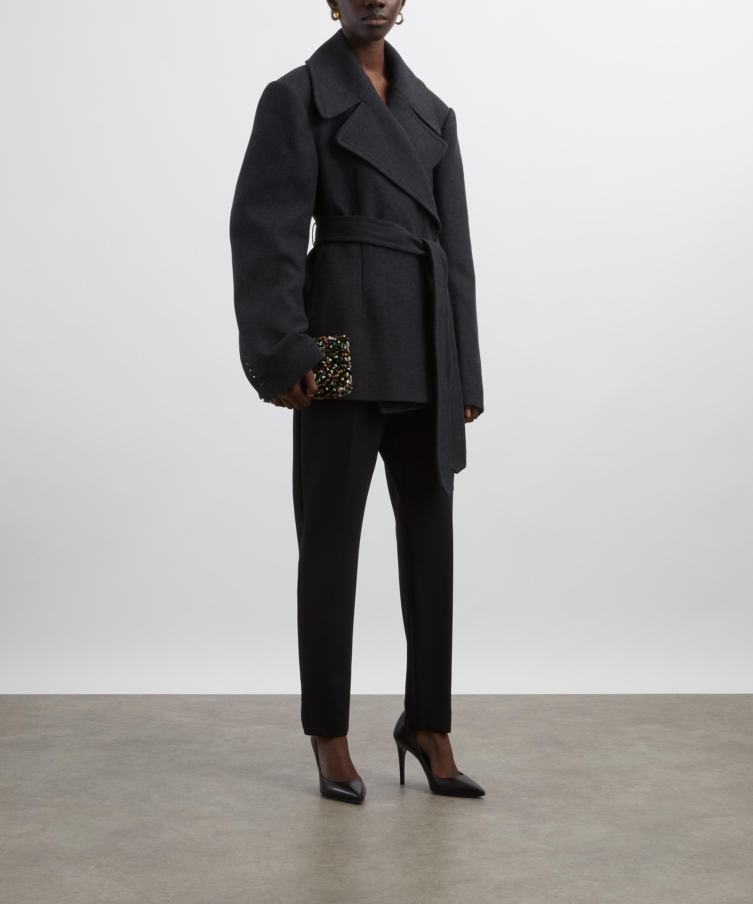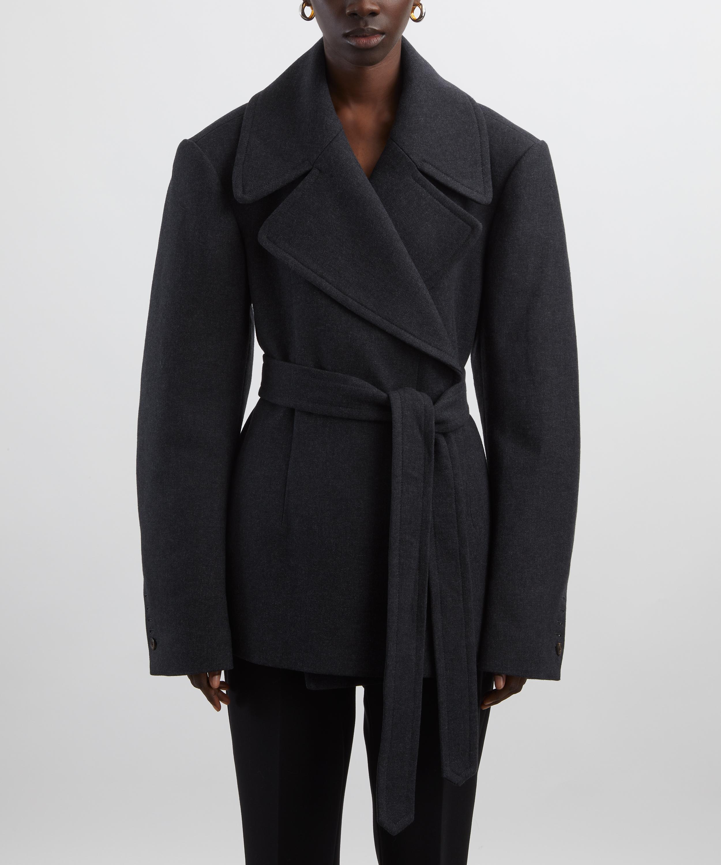 Crafted from a wool blend, this double-breasted jacket features oversized lapels, dropped shoulders, voluminous long sleeves, and a matching self-tie belt to cinch the waist and define the silhouette.