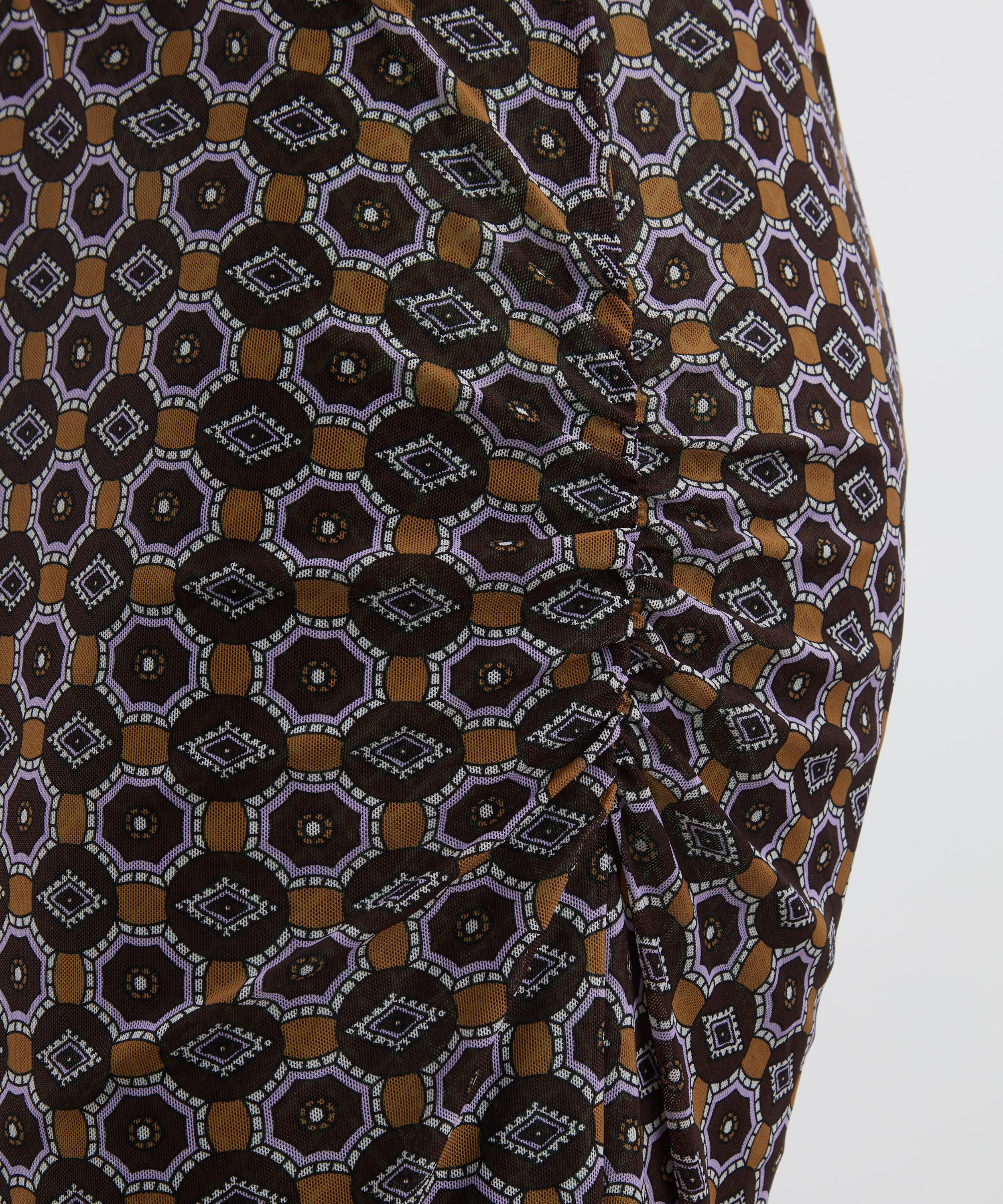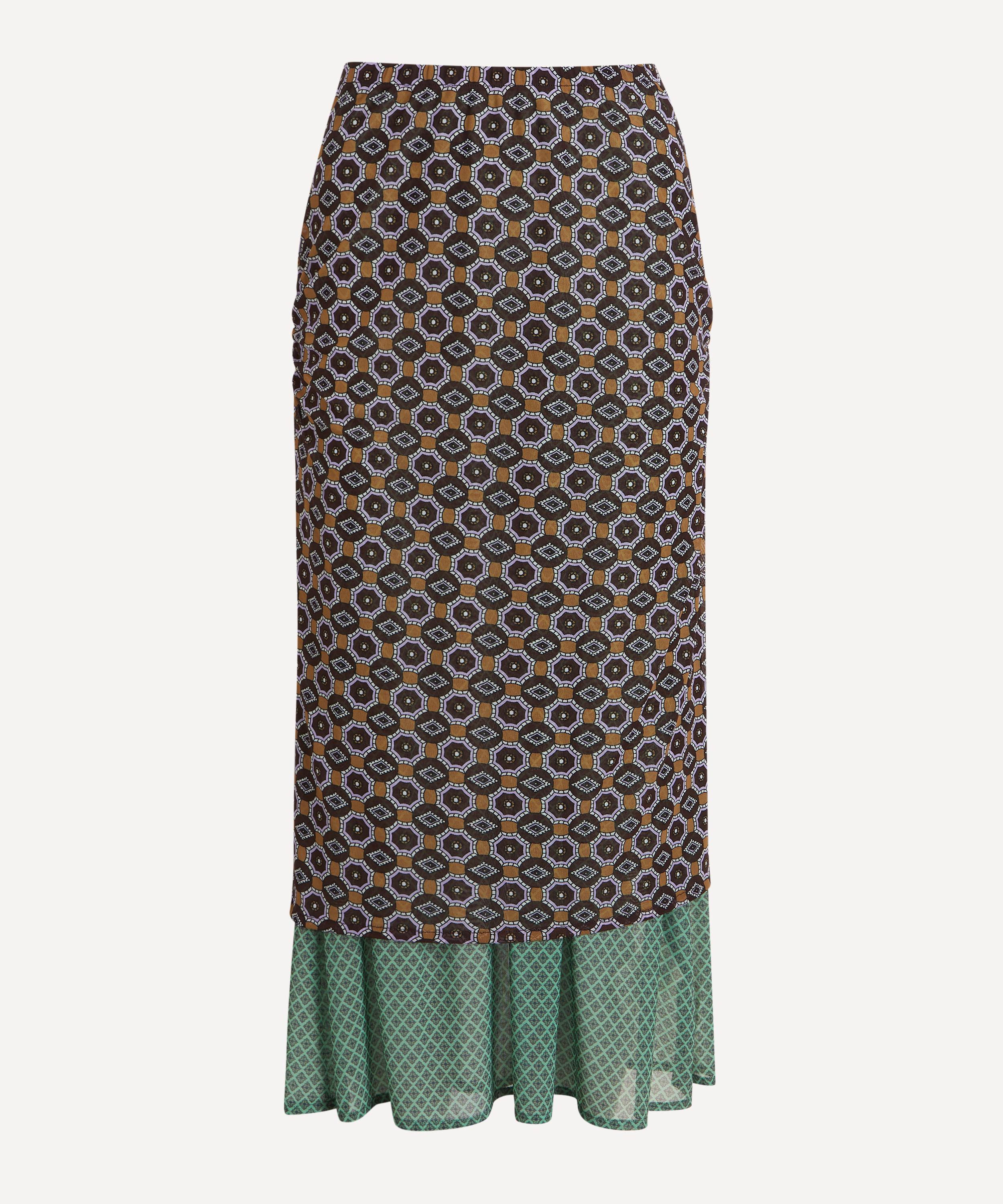 In a form-fitting, double-layered design, this mesh midi skirt showcases contrasting tie-inspired prints for a bold, graphic effect. Finished with a pop of green at the hem for a striking touch.