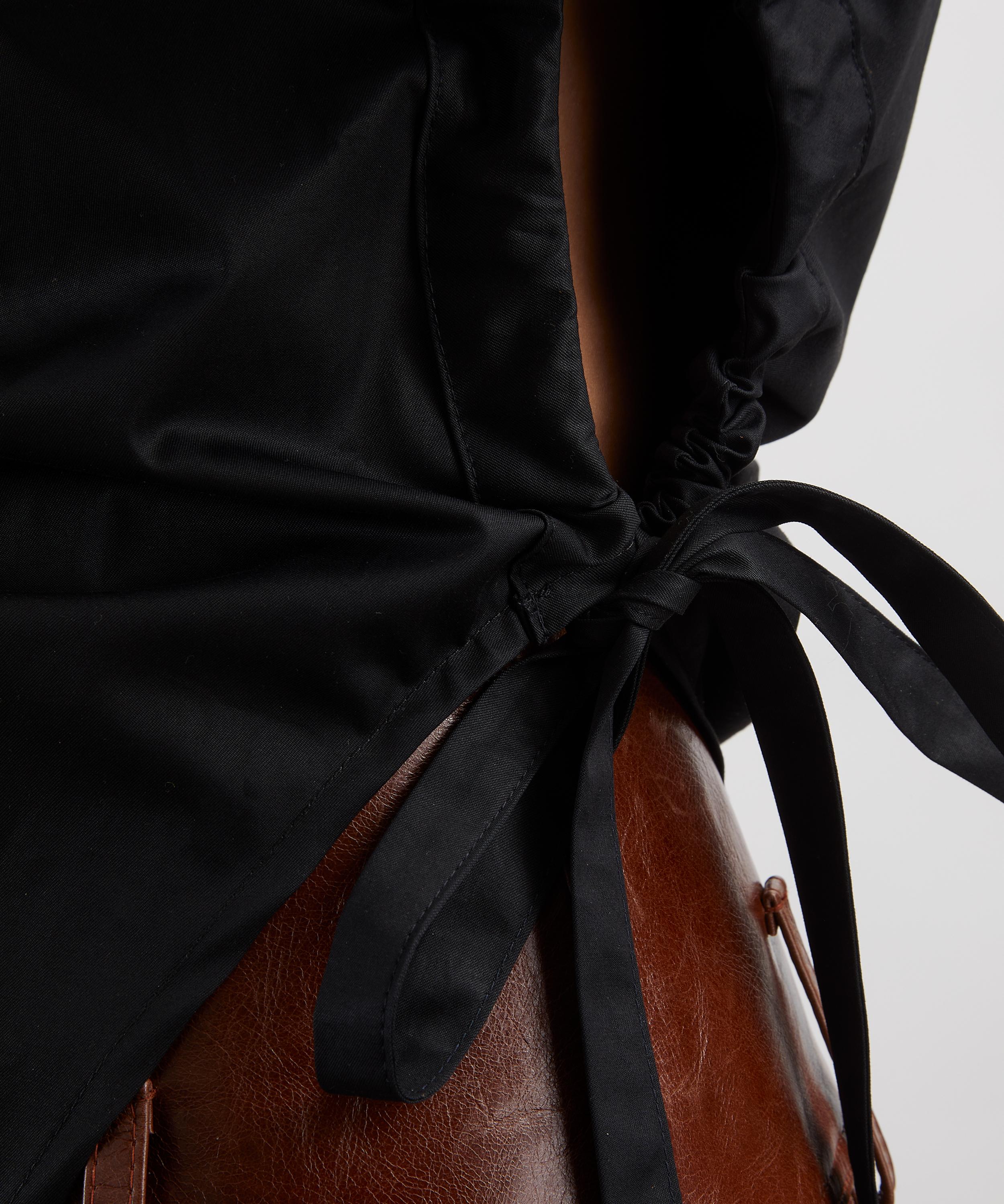 It’s expertly cut from panels of crisp, black cotton and defined by a draped neckline that’s accentuated by gathers under the arm and volume in the sleeve, back then falls to an asymmetric hem. It’s finished with back ties – completing a flawlessly modern twist on traditional shirting.