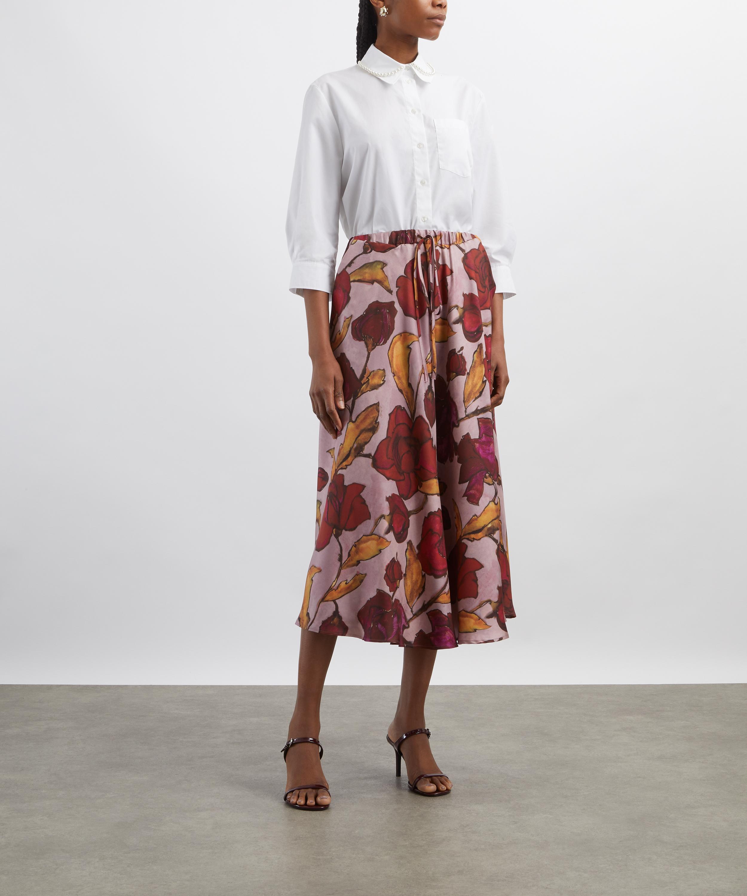 Made in Italy from drapey silk printed with the hand-placed Floral French Kiss motif, this drawstring skirt features a flowing A-line silhouette that flares to a mid-calf length and cinches at the waist with an adjustable drawstring.
