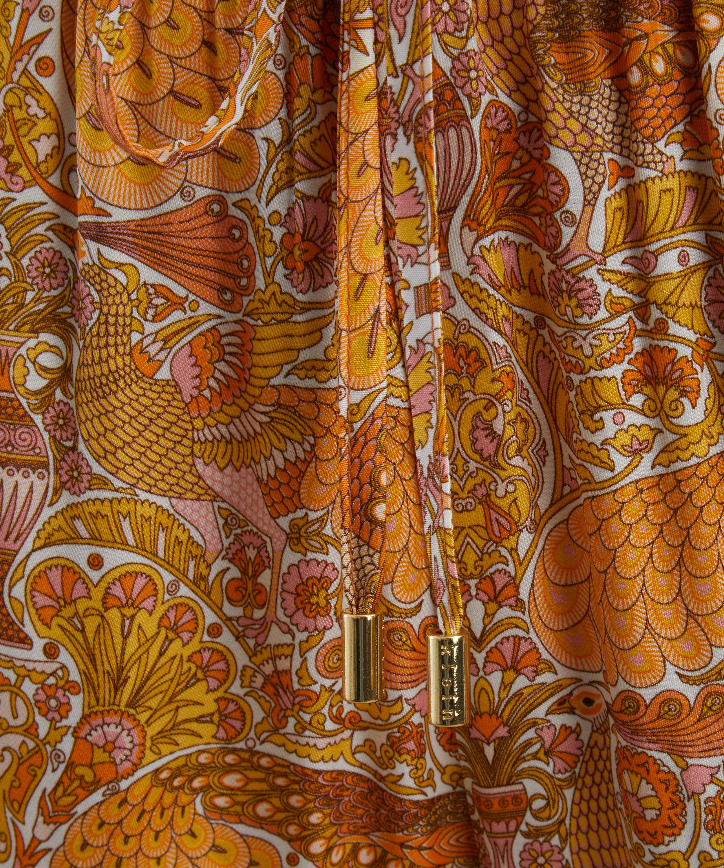 Crafted from luxurious viscose satin and Adorned with Liberty Fabrics’ vibrant Oscar’s Palace print, these chic trousers feature a relaxed, wide-leg silhouette and an elasticated drawstring waistband for effortless comfort and style.