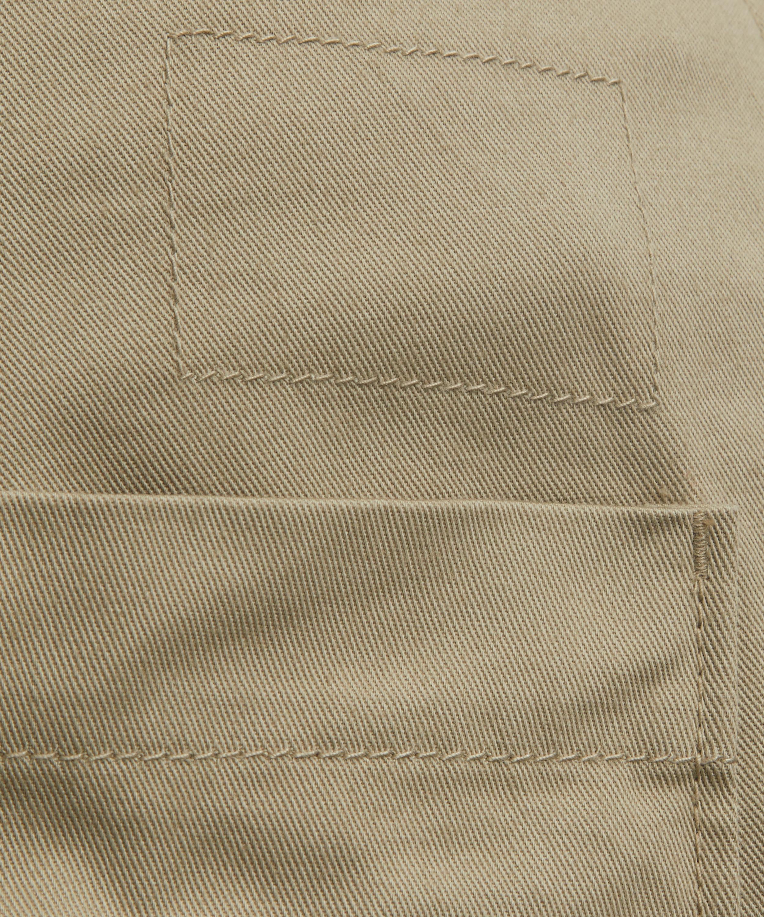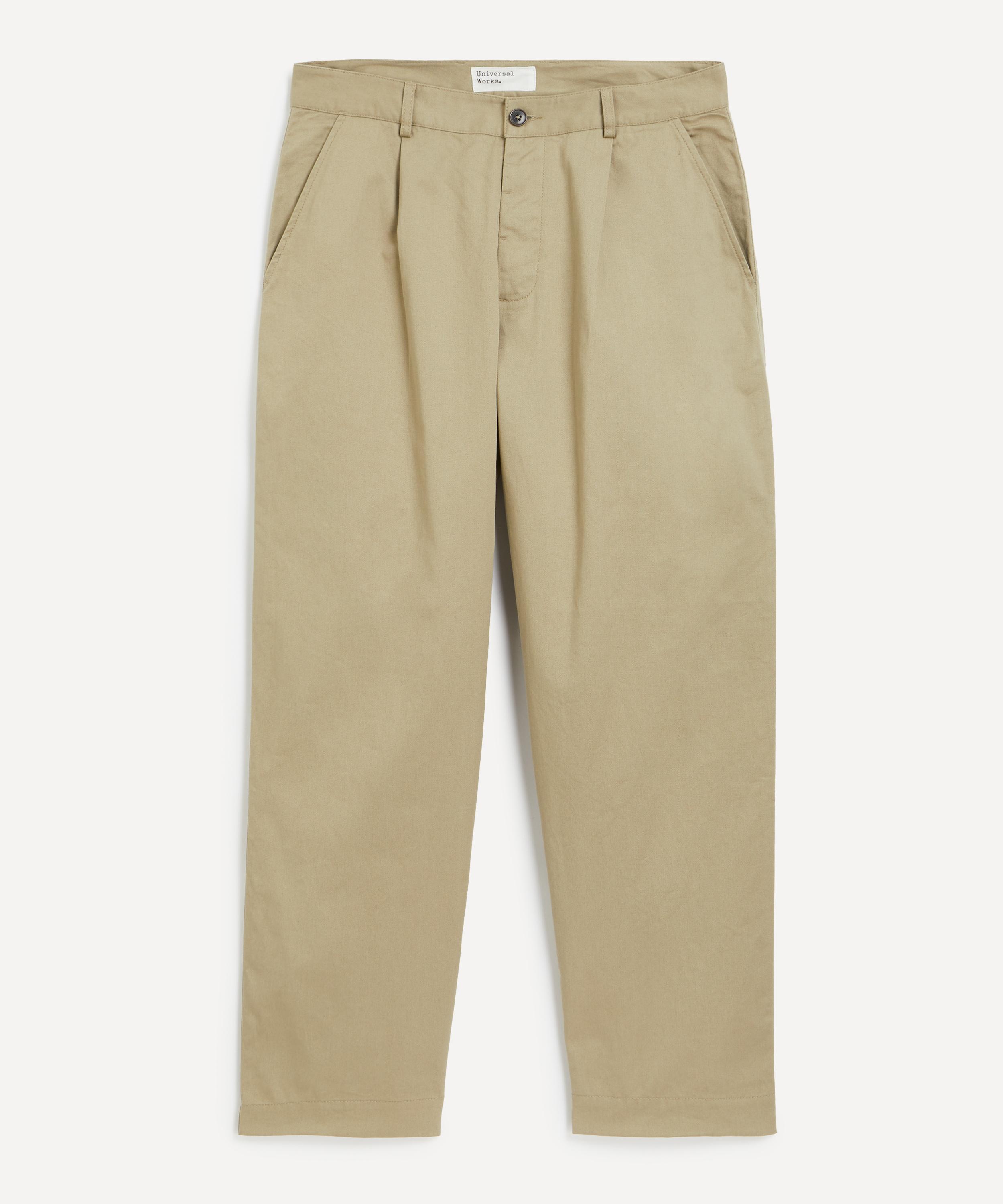 Crafted from durable cotton twill in classic beige, these wide-leg trousers blend utilitarian ease with subtle sophistication. The slightly tapered silhouette features a single pleat at the front, introducing just the right hint of structure for a polished yet laid-back aesthetic.