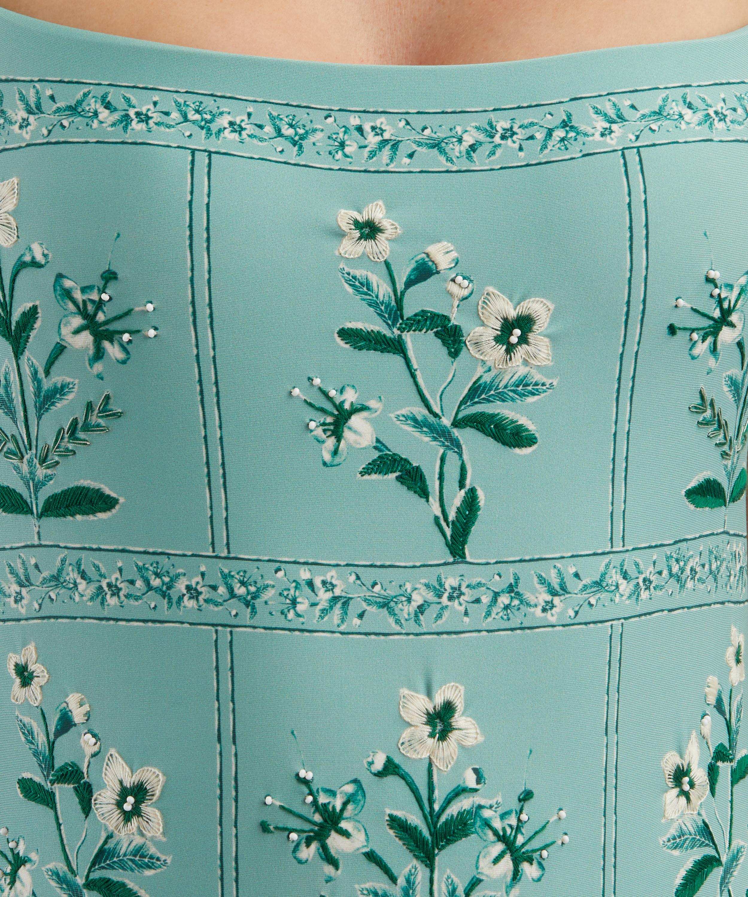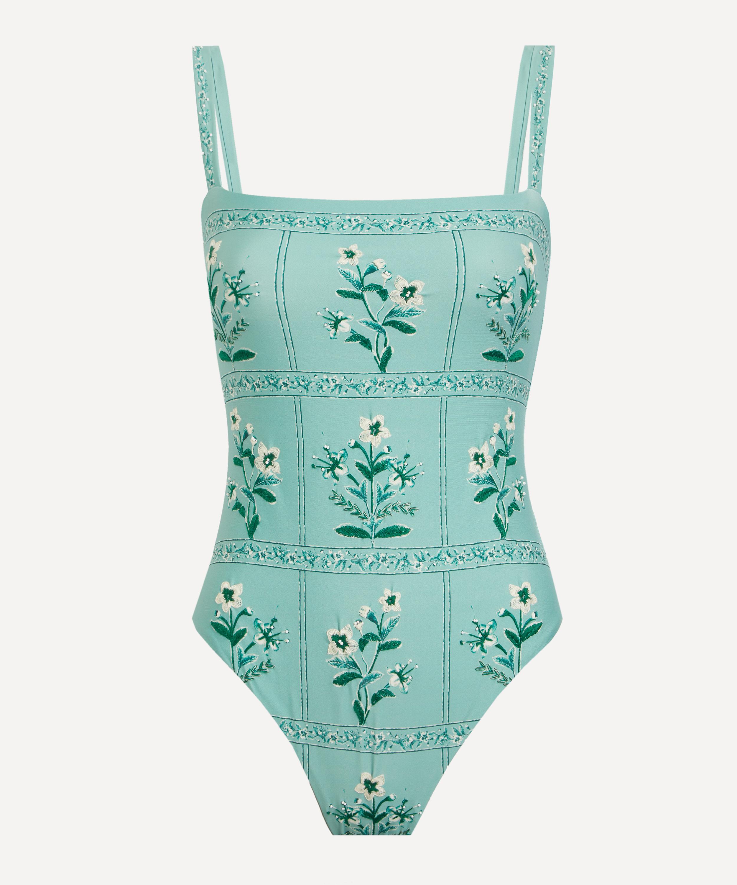 Adorned with a verdant green florals, the Durazno Ceiba swimsuit offers UPF 50+ sun protection and features a square neckline and form-fitting design accented with hand-embroidered shoulder straps for an artisanal finish.