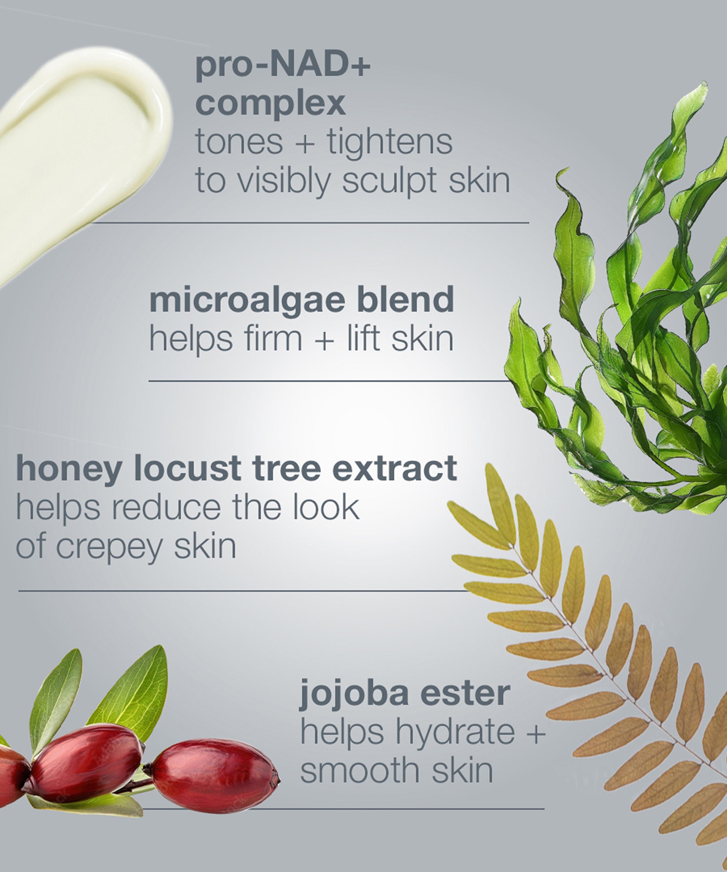 Powered by a firming Pro-NAD+ Complex, with support from microalgae, rice protein and honey locust tree extract, this luxuriously lightweight formula immediately smooths the skin for a soft-focus appearance, while protecting against free radicals – revealing skin that is visibly tighter and lifted.