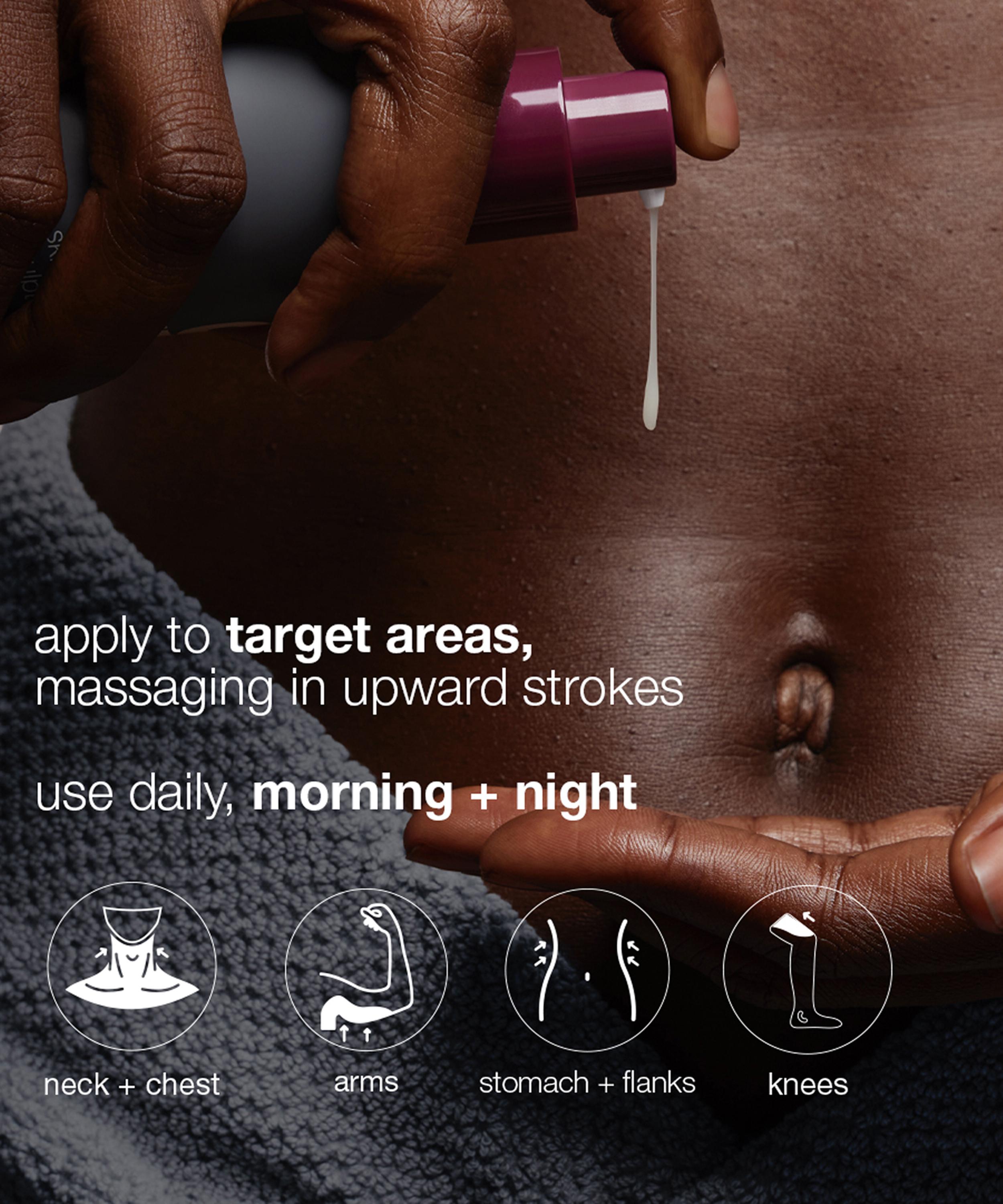 Apply to target areas, massaging in upward strokes. Use twice daily, morning and night.