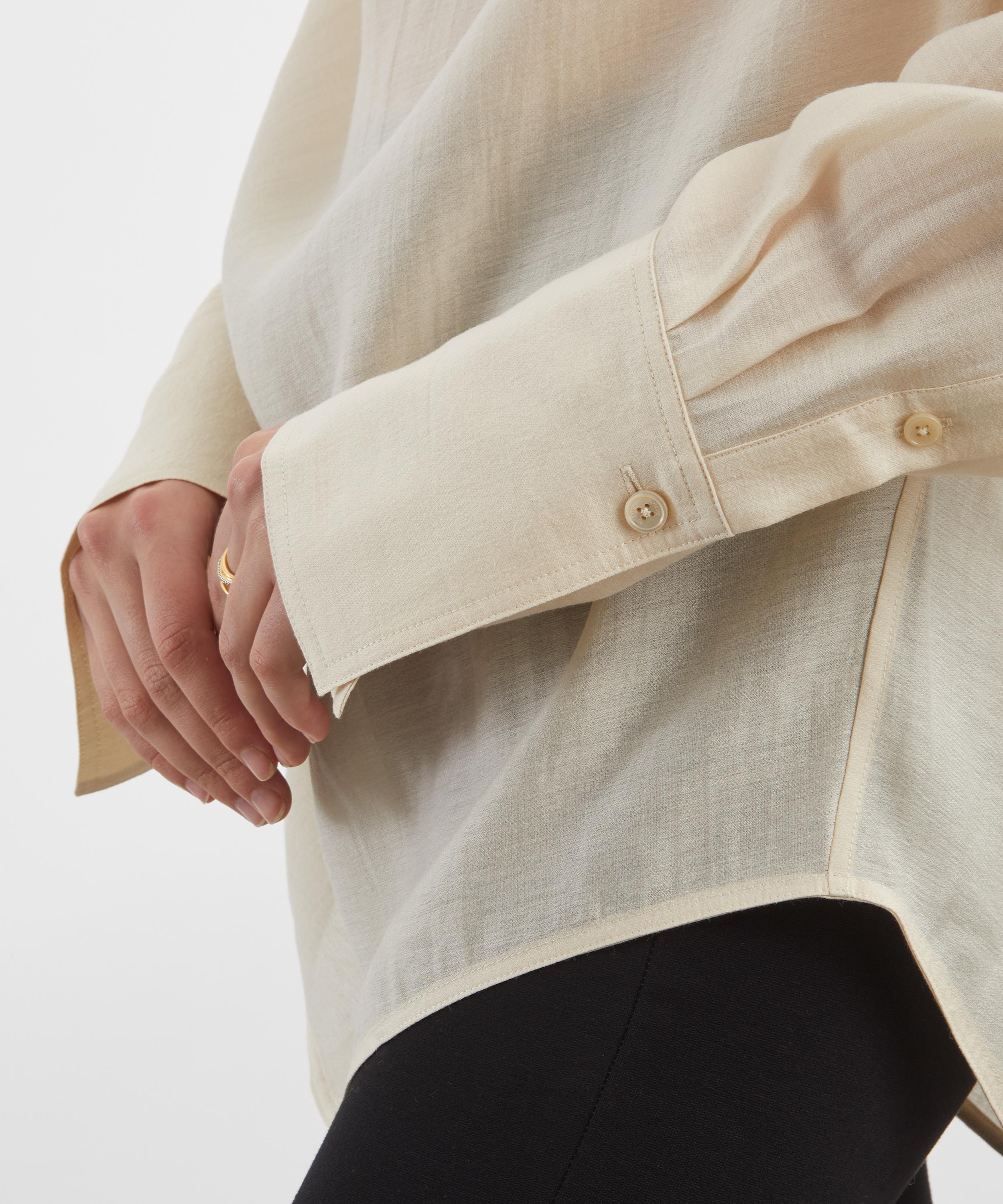Crafted from diaphanous organza, this oversized blouse drapes effortlessly over the body, featuring a dramatic cowl neckline, dropped shoulders, and long sleeves finished with neatly buttoned, elongated cuffs.