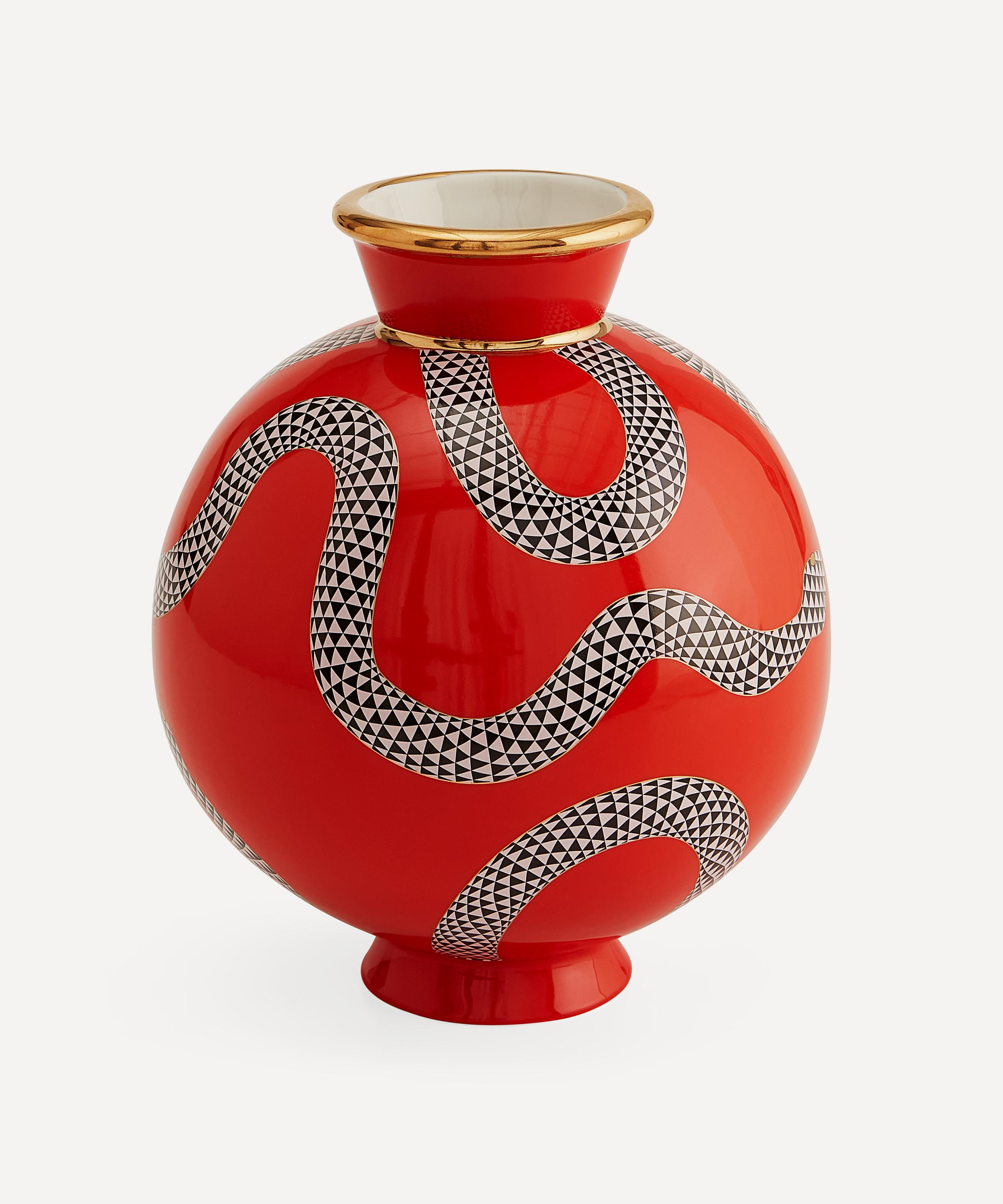The vase is sculpted from an original clay model and expertly crafted from high-fired porcelain in vibrant red, then decorated with a serpent-inspired design and warming gold accents that nod to the brand’s glamorous outlook. Perfect for displaying dried or freshly cut flowers, it’s effortlessly styled with the other pieces from the Eden collection.
