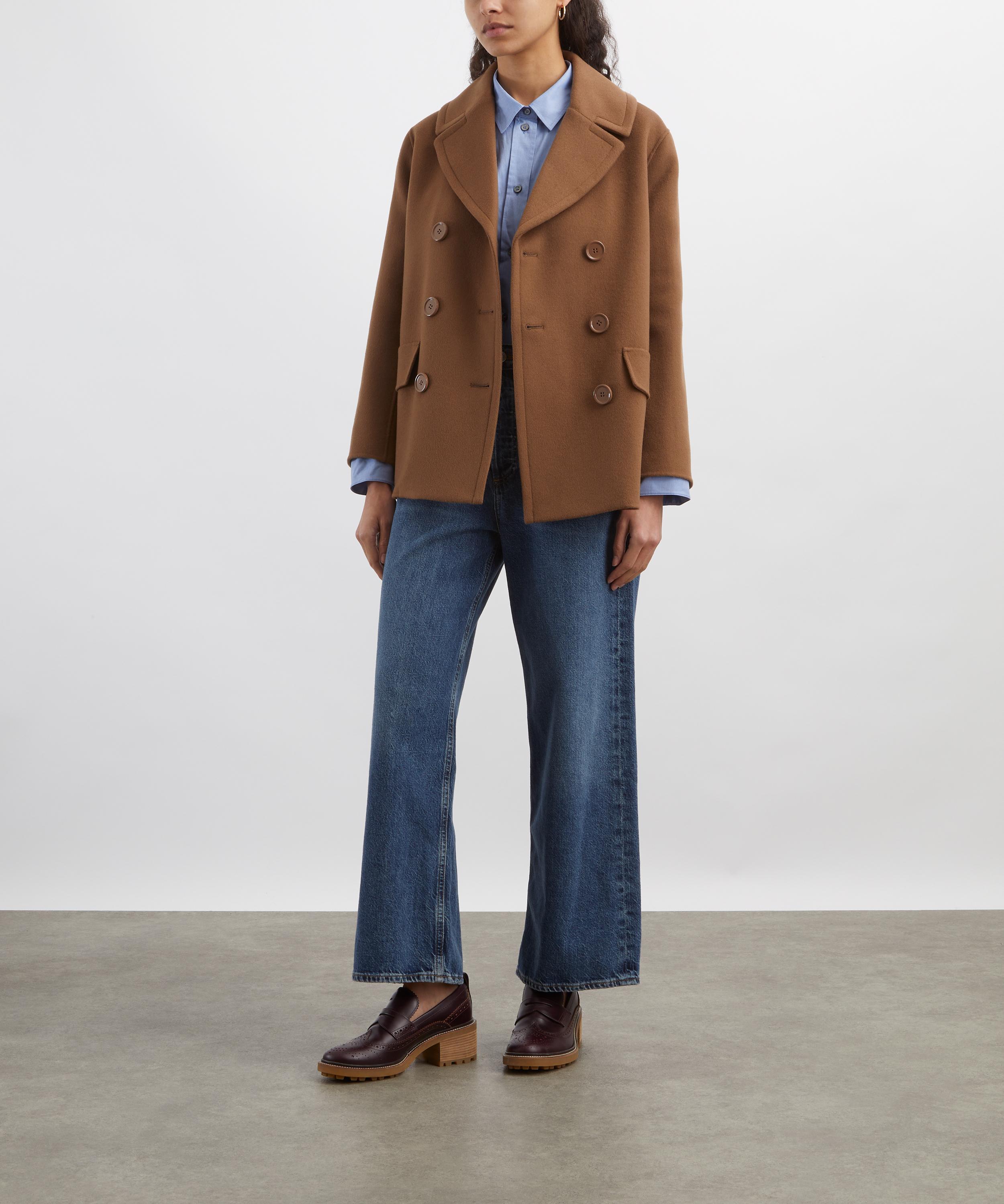 Crafted from double-faced pure wool broadcloth, this pea-style jacket is defined by a double-breasted, subtly flared silhouette, featuring a lapel collar, button fastening, and flap-accented welt pockets for a refined, tailored finish.