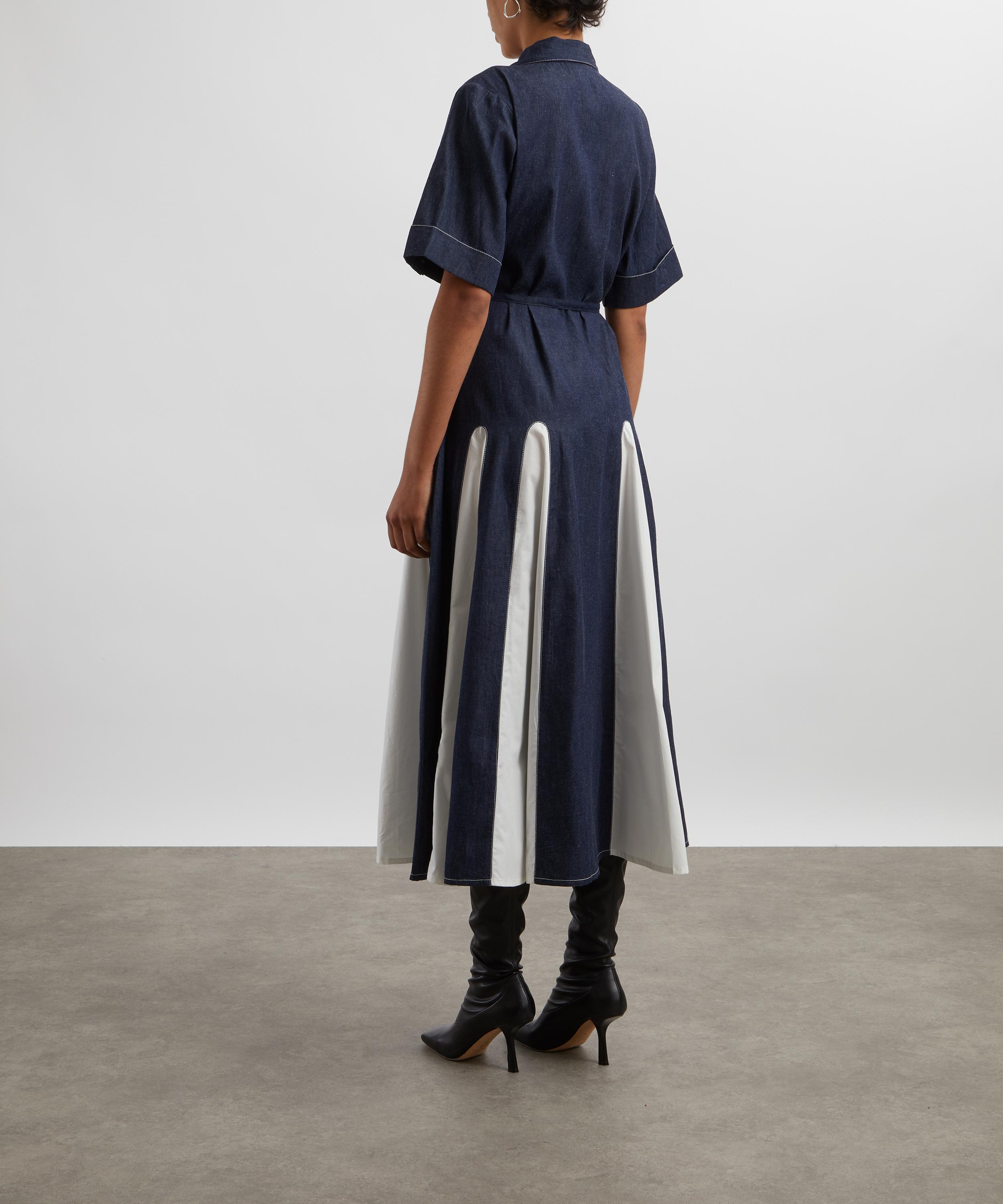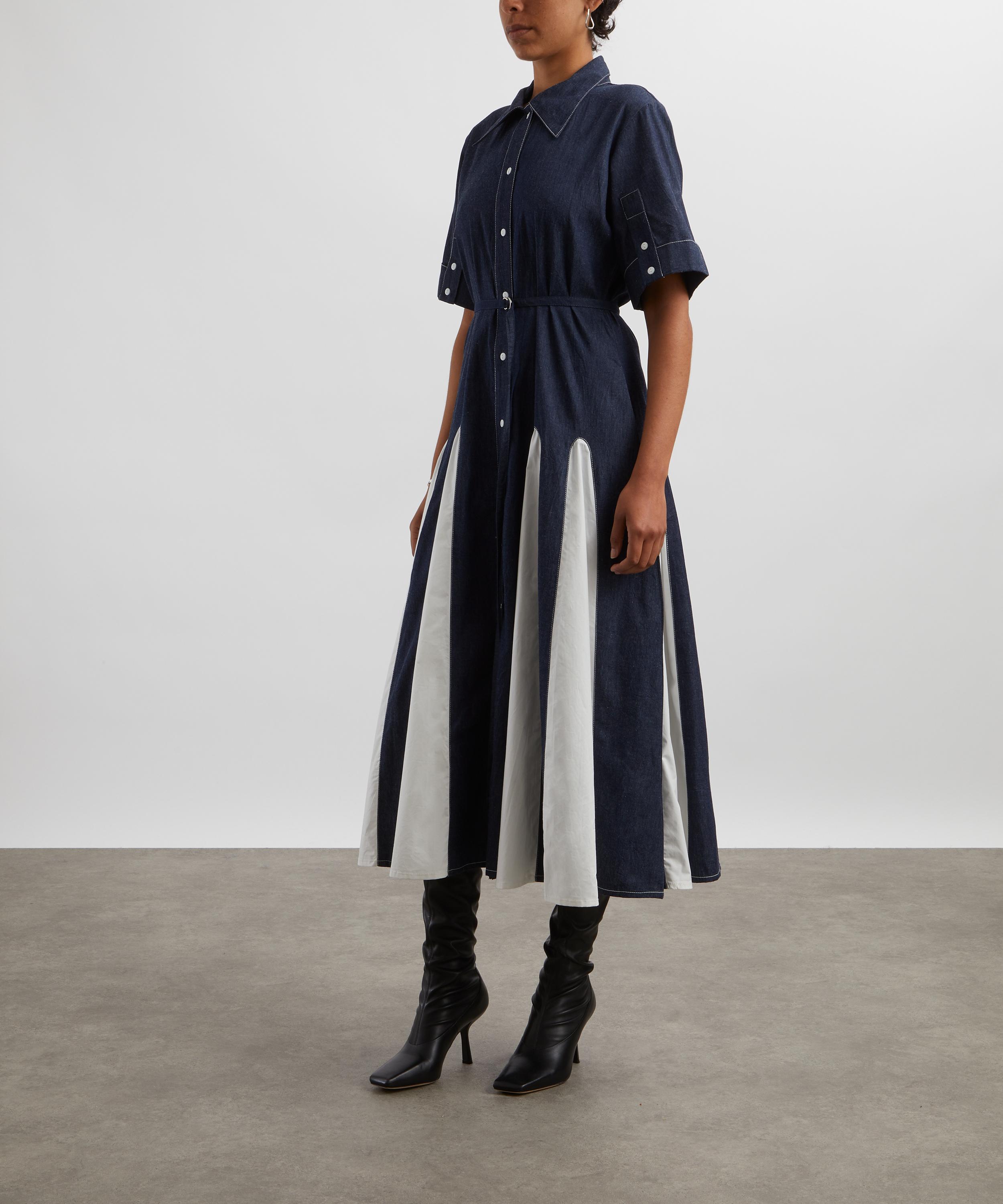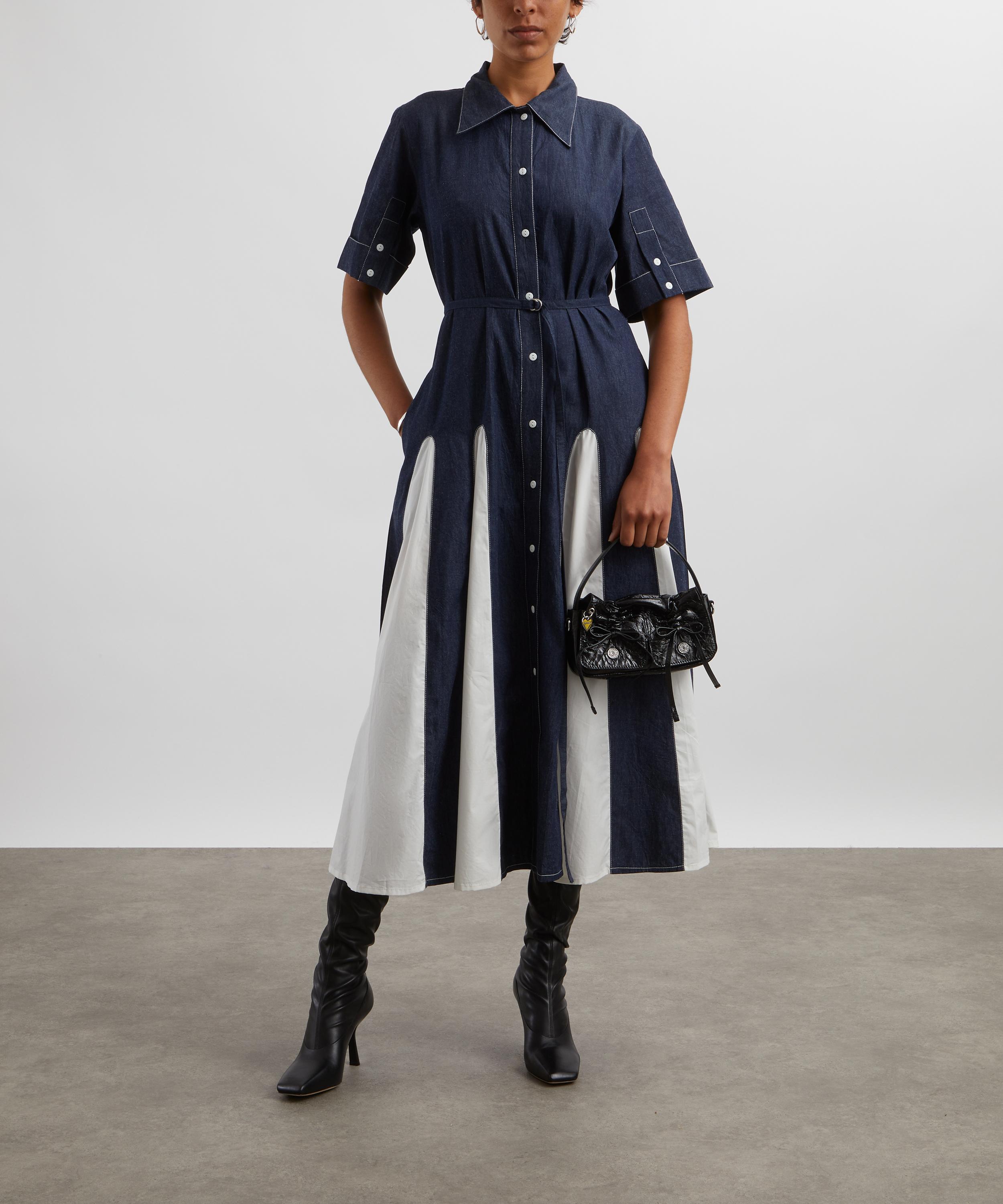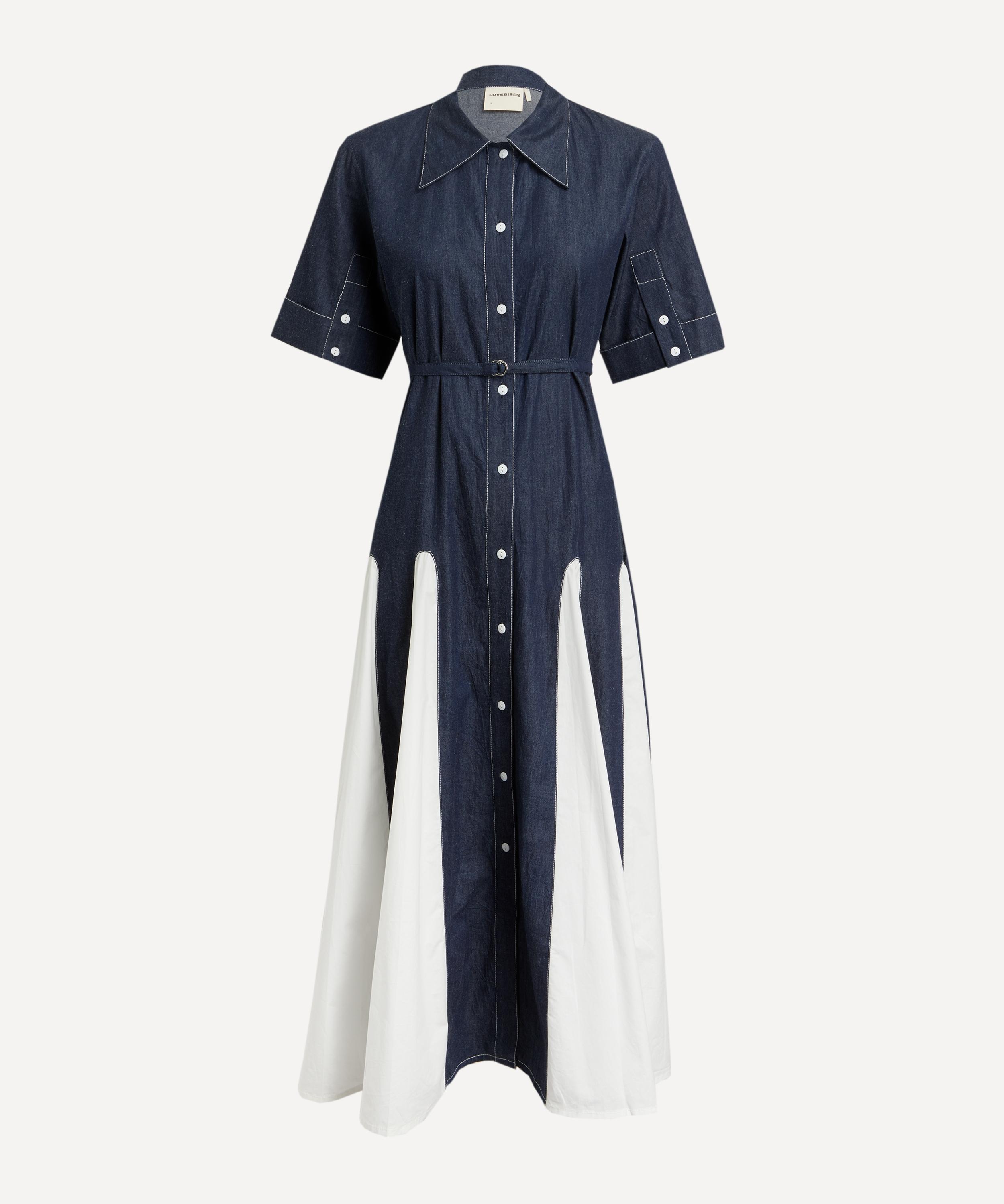 Update your eclectic wardrobe collection with Lovebirds’s playful Effervescent Midi Shirt Dress. Echoing a subtle vintage aesthetic, it’s crafted from cotton poplin and cut to a mid-length with dropped shoulders, featuring a point collar, short sleeves with buttoned cuffs and a button front closure. Complete with side pockets, a detachable belt and colour-blocked godet panels at the skirt, this dress is wearable for work, or weekends.
