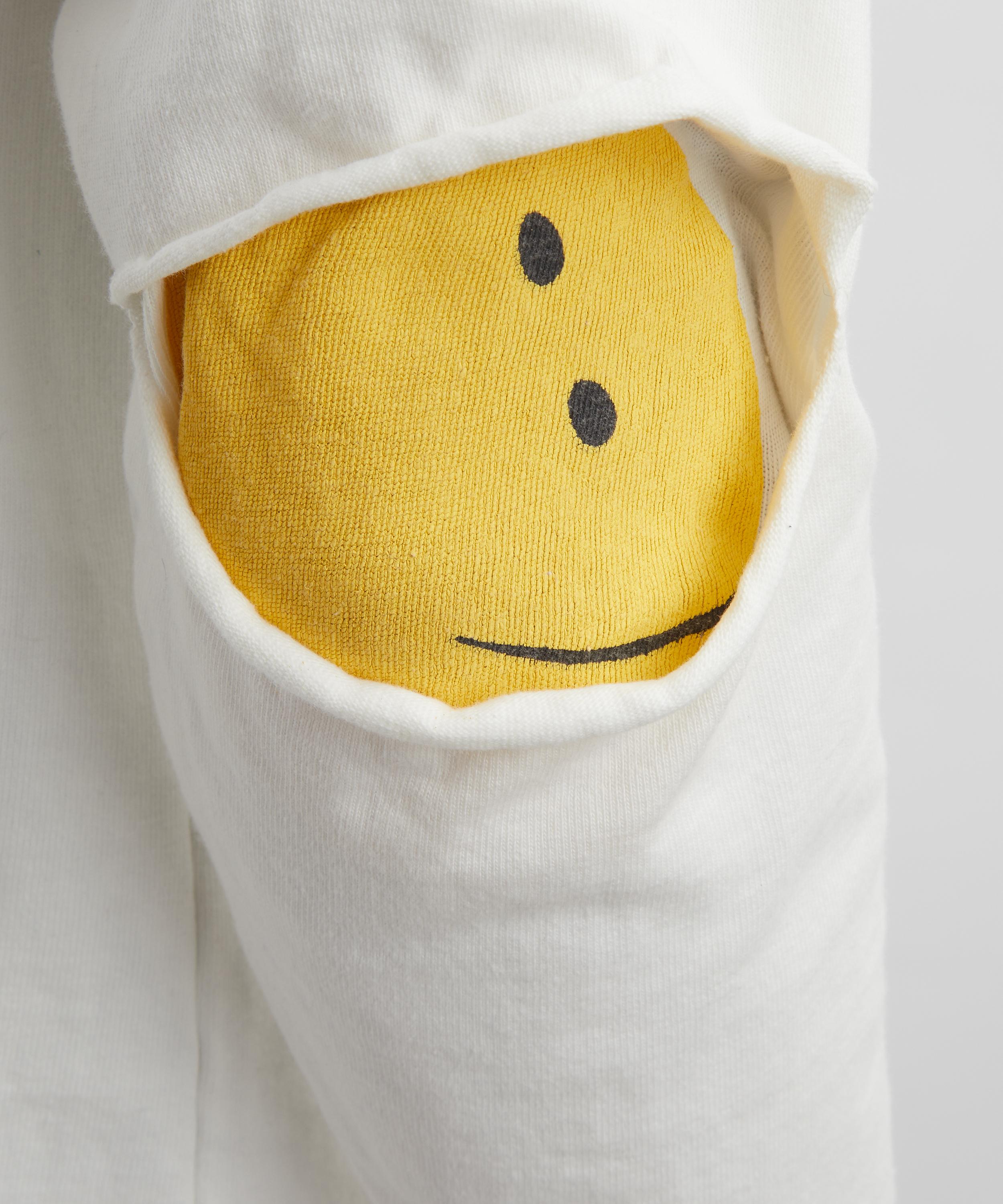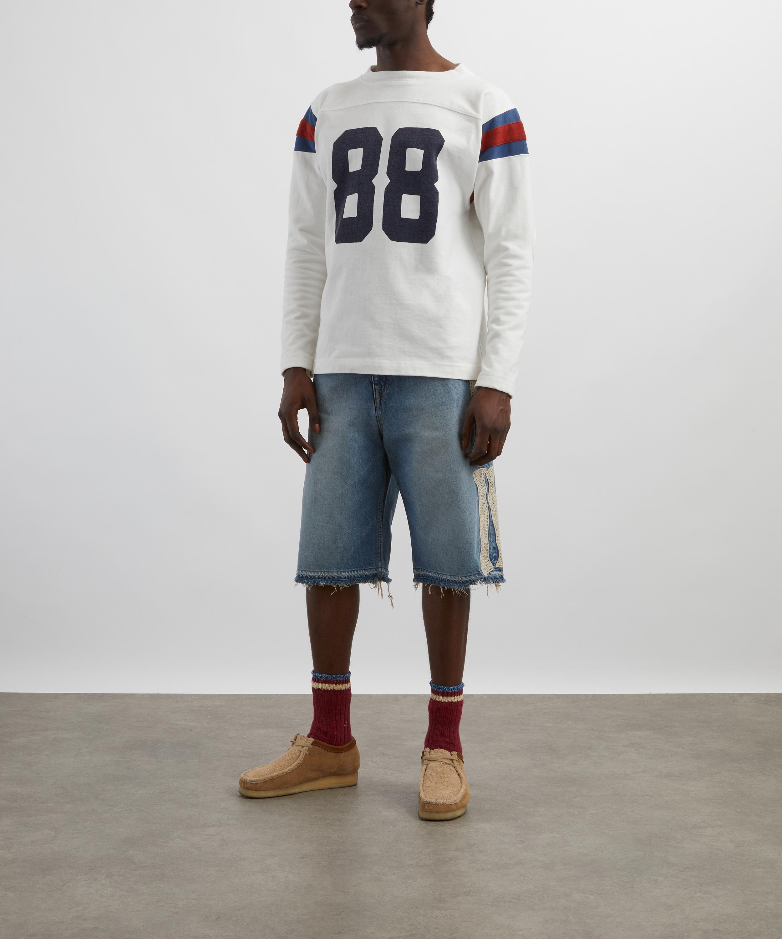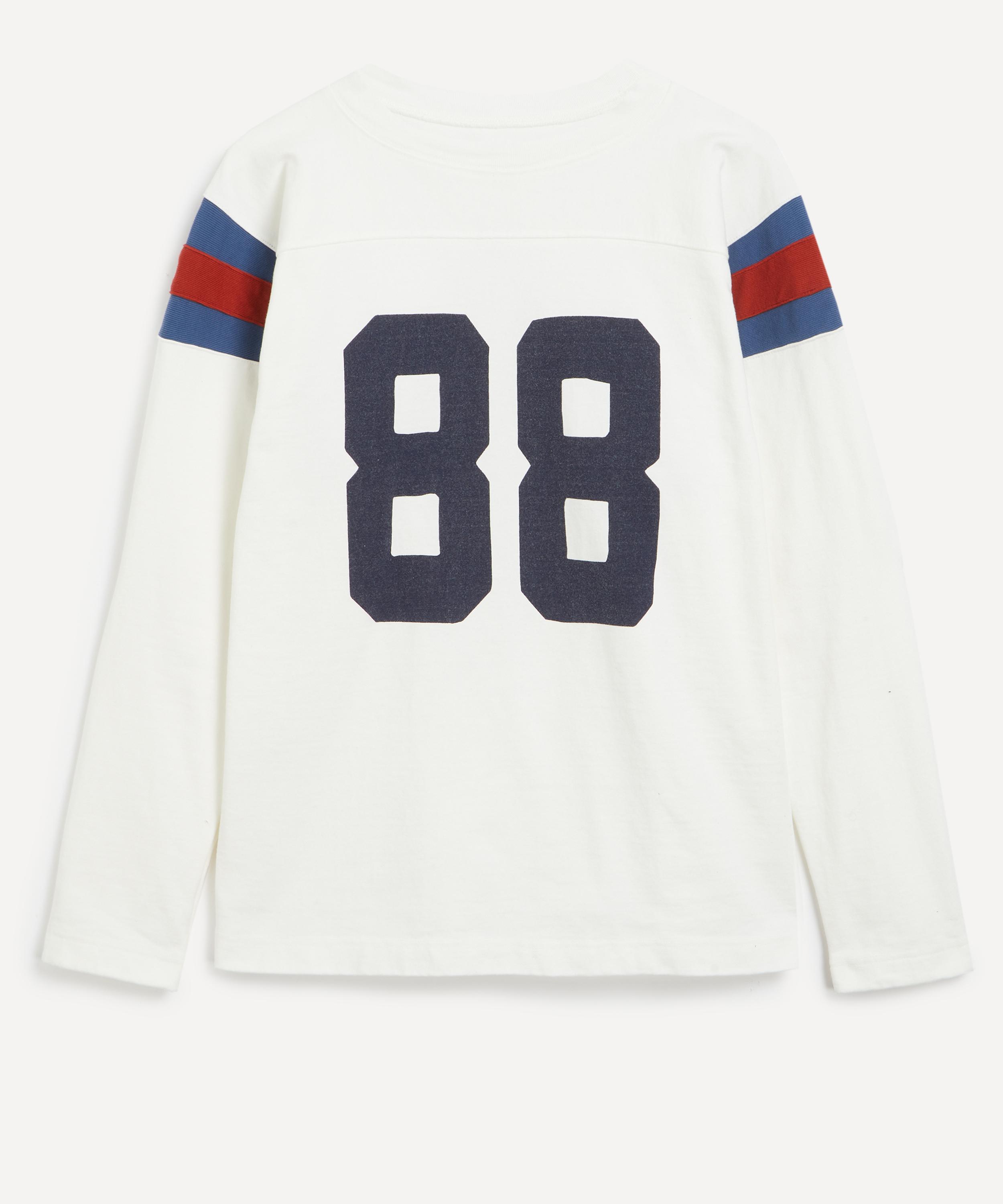 Fusing experimental design with cutting-edge production techniques, this football style shirt is made from a soft and densely knit cotton jersey with long sleeves and a classic crew neck. Boasting a regular fit with stripe detailing to the shoulders, it’s finished with the number ‘88’ to the chest and a playful smiley print peeking through the slit in the elbows.