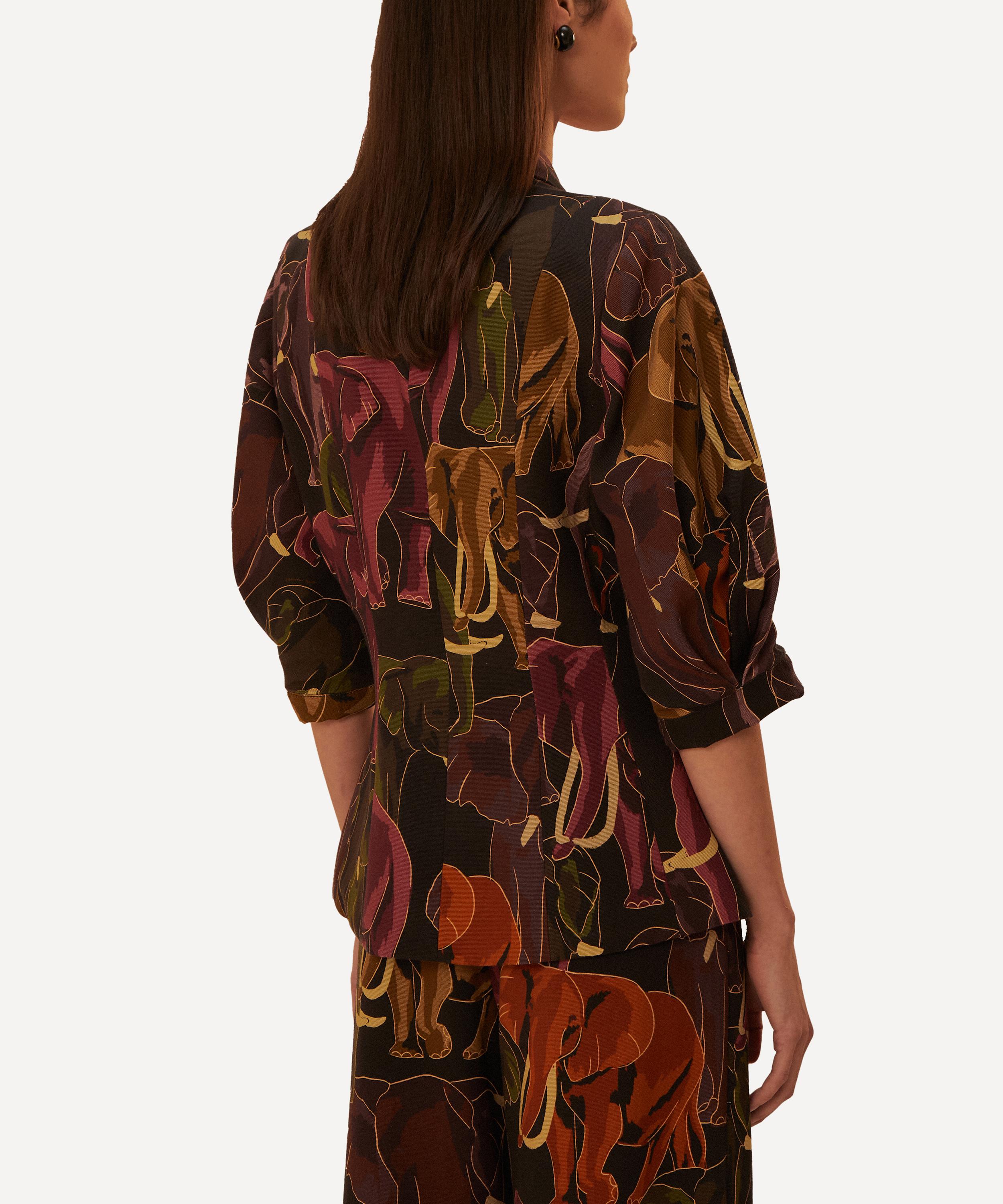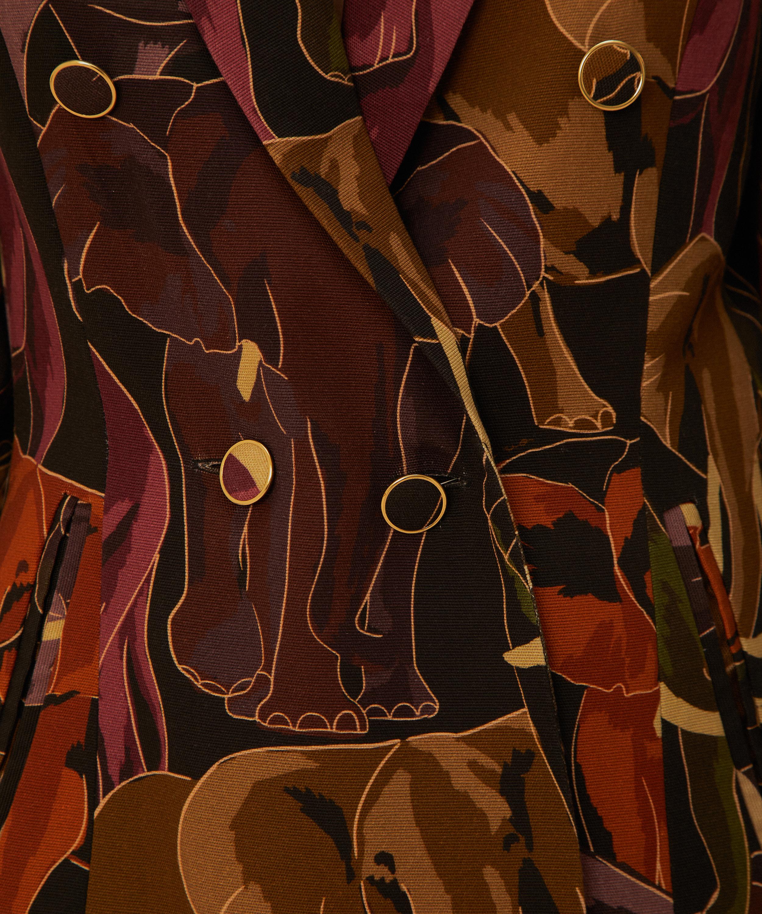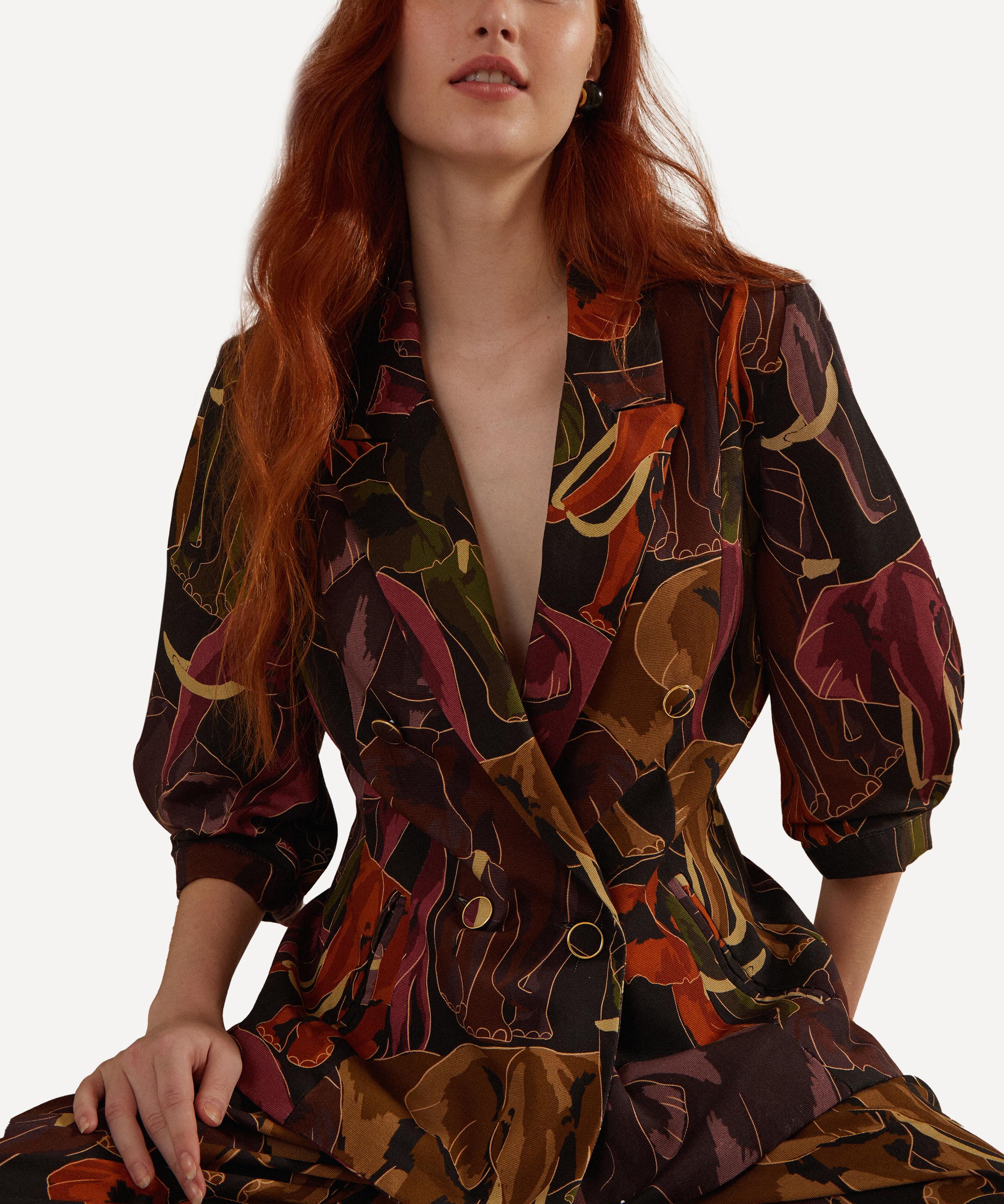 An elevated take on traditional tailoring with its short puff sleeves and double-breasted design, this beautiful blazer playfully presents an idiosyncratic elephant print throughout, meticulously finished with self-fabric covered buttons – style with the Elephants Green Skirt for a slick, statement co-ord.