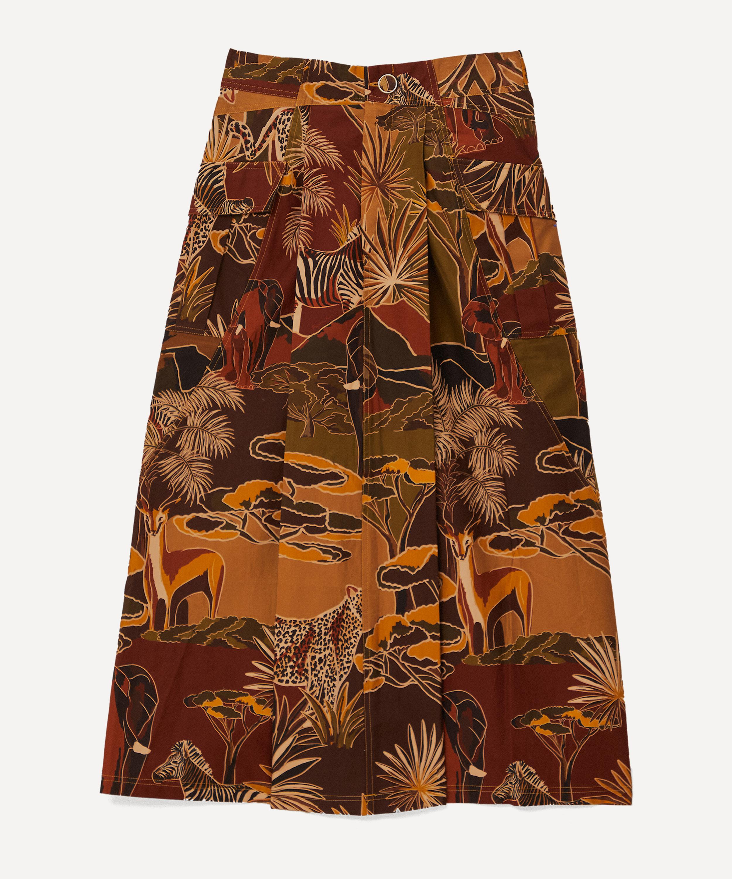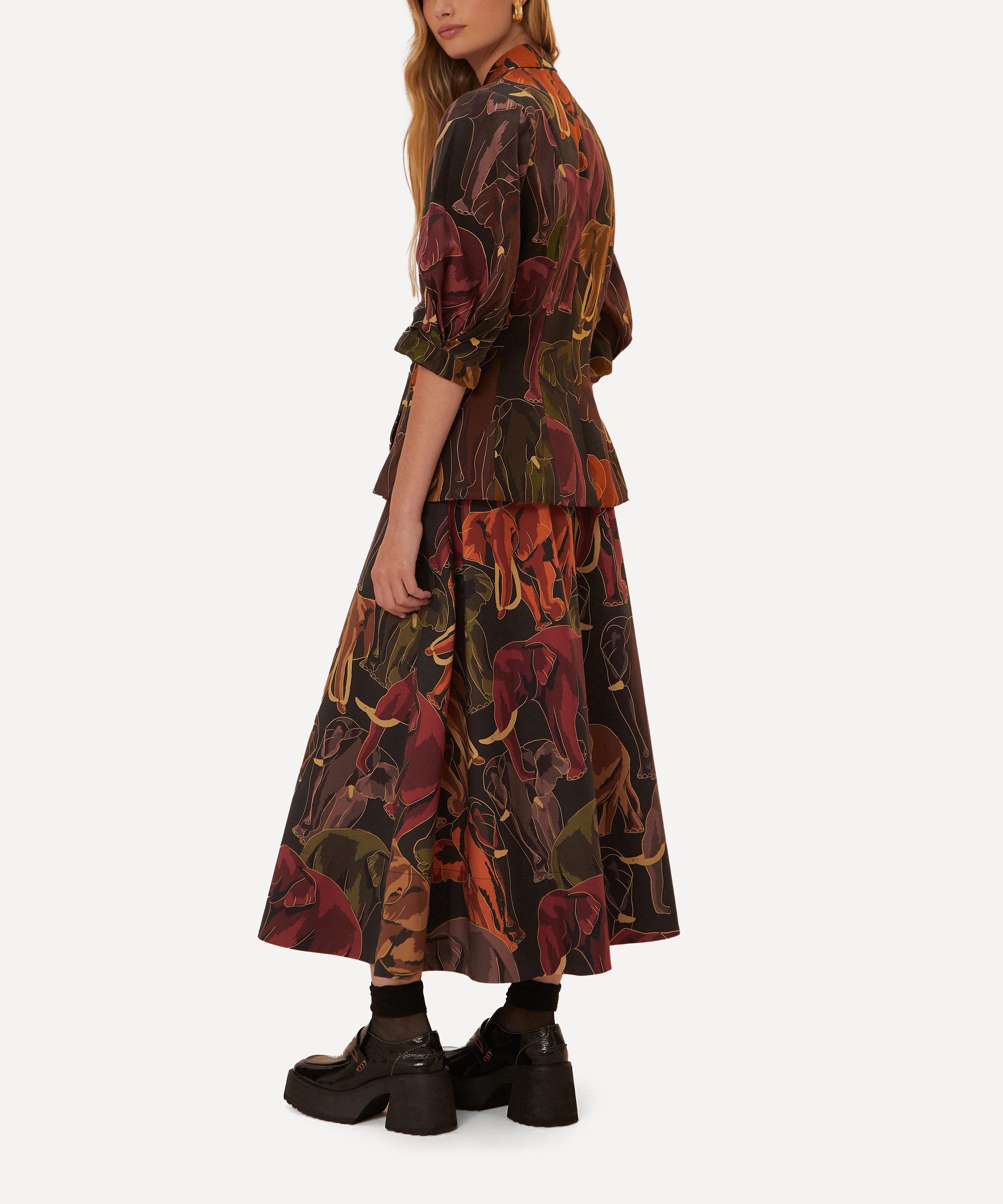An elevated take on traditional tailoring with its smart pleating and waisted design, this beautiful skirt playfully presents an idiosyncratic elephant print throughout, meticulously finished with a self-fabric covered button fastening – style with the Elephants Blazer for a slick, statement co-ord.