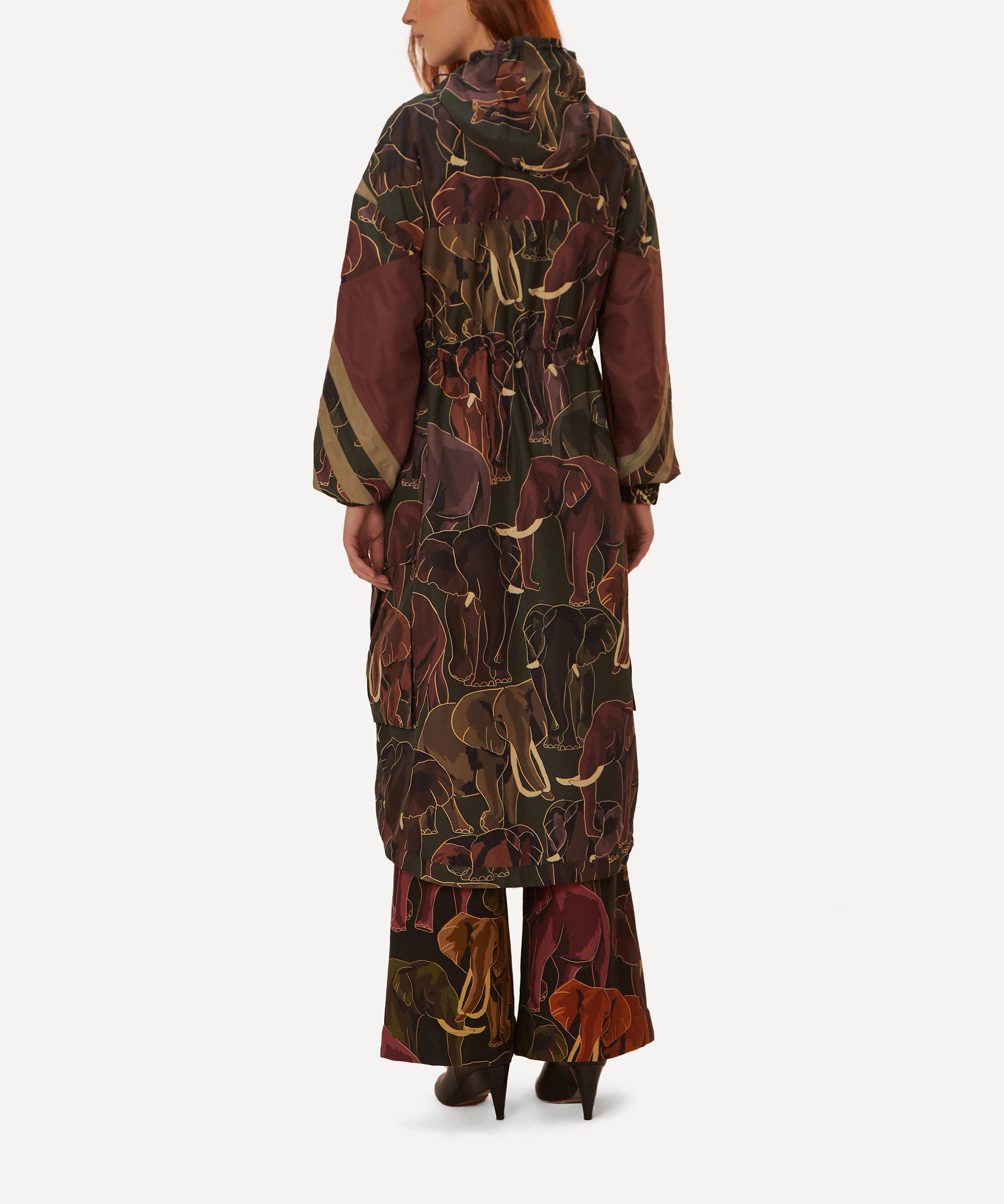 An elevated take on traditional outerwear with its vibrant elephant pattern, this raincoat presents a classic silhouette with tonal adjustable tie pulls – perfect for elevating your Autumn/Winter edit with a pop of colour and print.