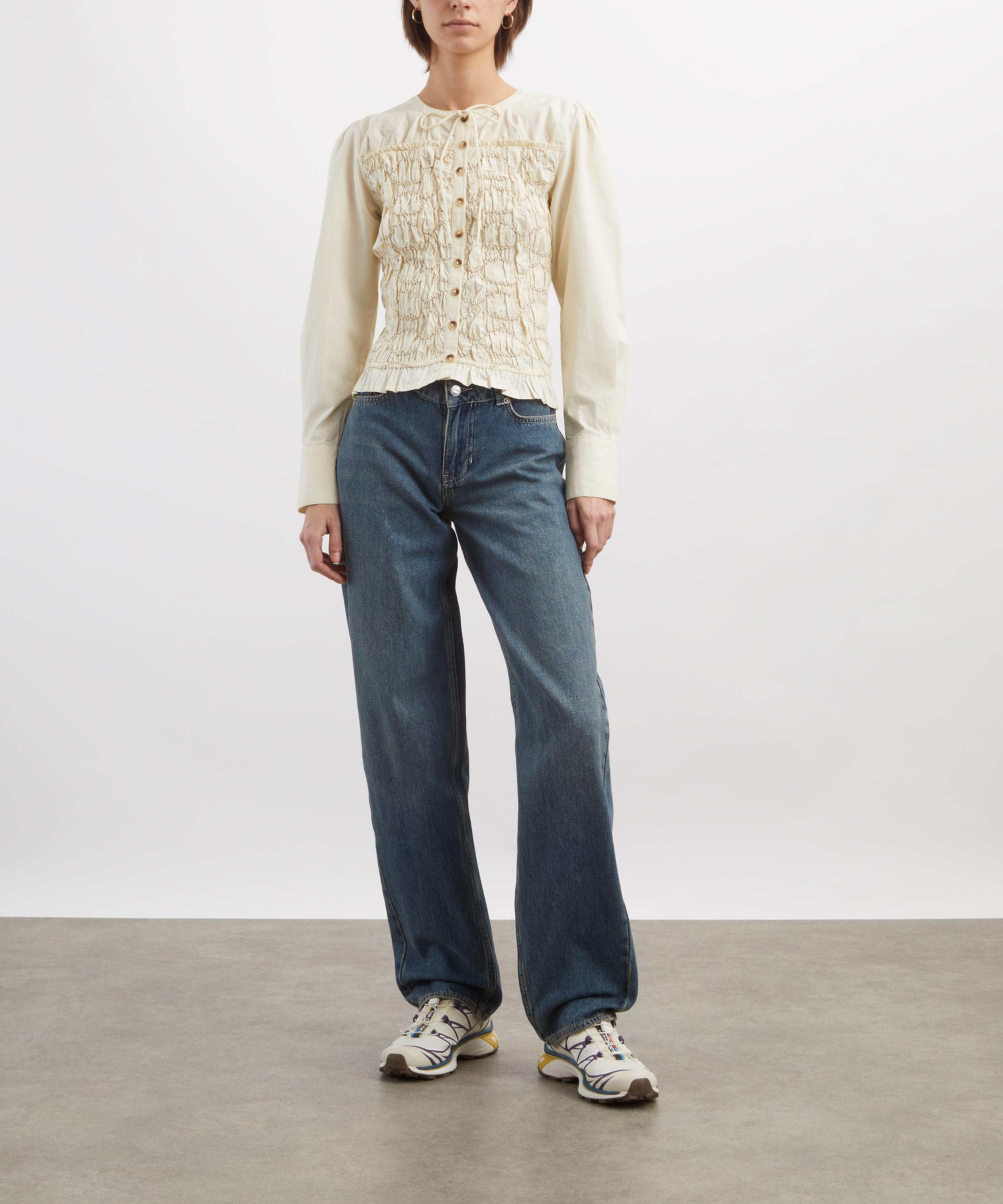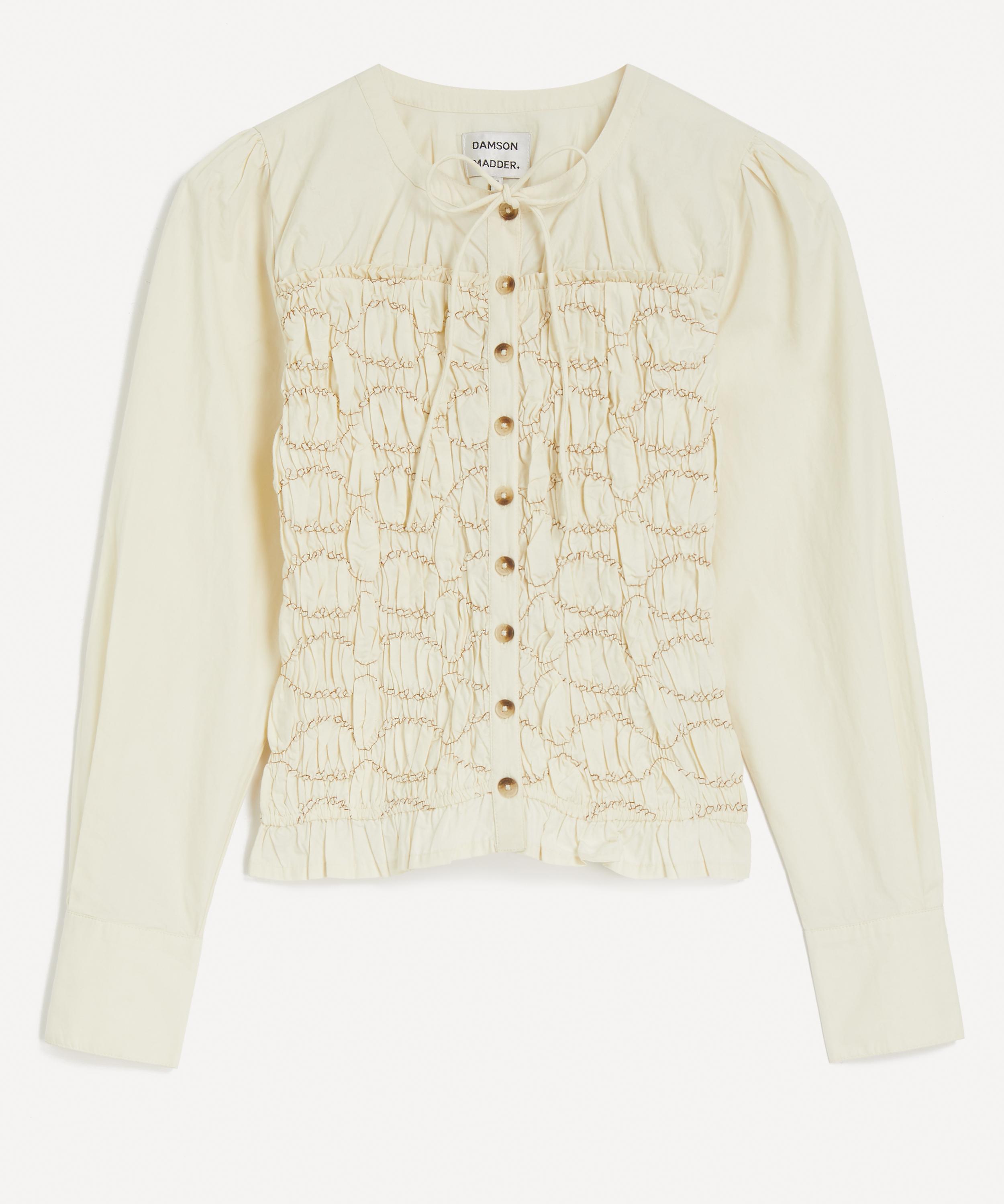 Cut from light butter-yellow cotton, this blouse features a beautifully smocked bodice that creates a flattering, fitted silhouette. A fully button-down centre placket and delicate neck ties complete the design with a dainty finish.