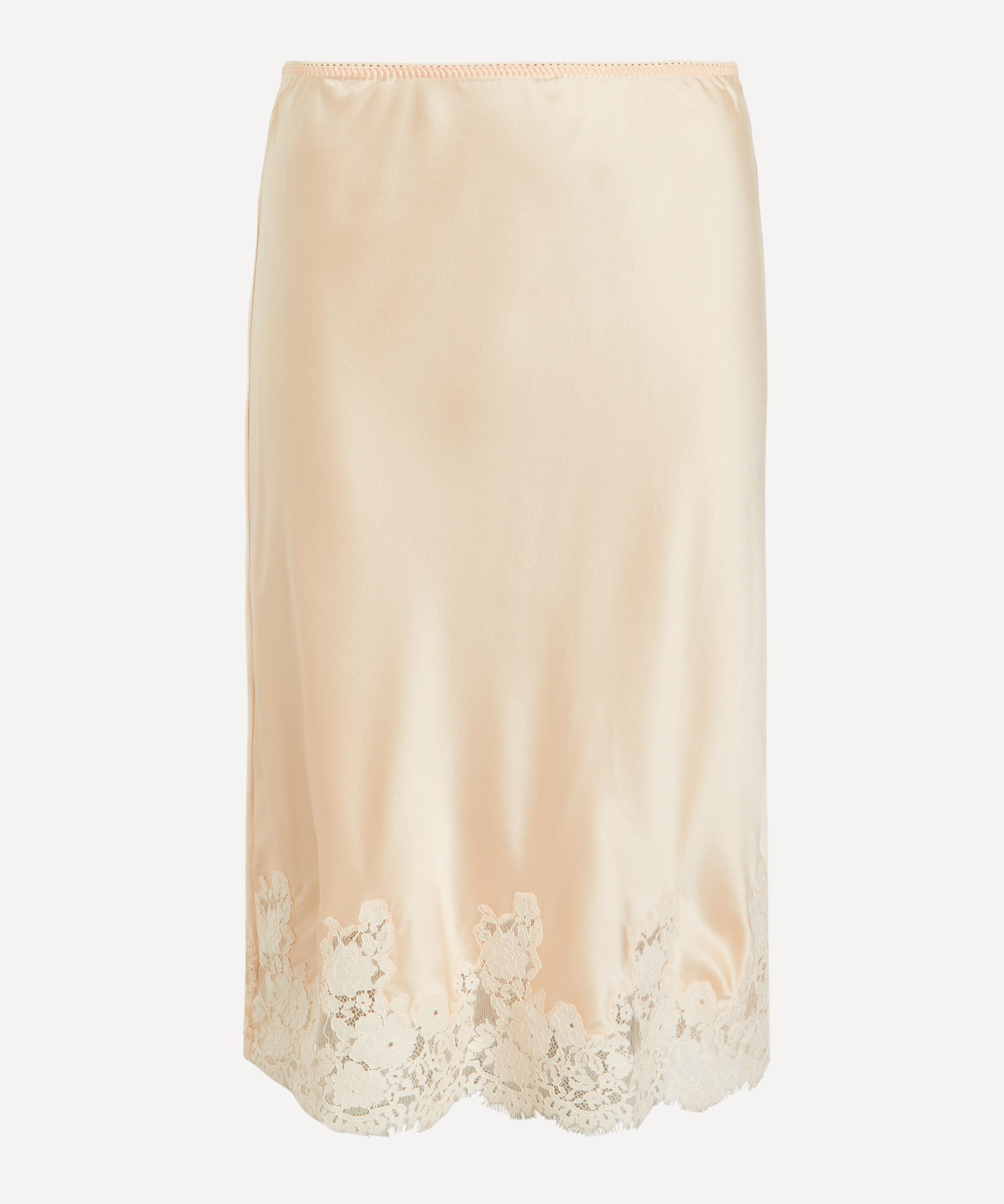 Crafted from luxurious, ultra-smooth silk satin, the Elowette Skirt feature a high-waisted, mid-length silhouette finished with scallop elastic detailing at the waist and ornate floral lace at the hems.