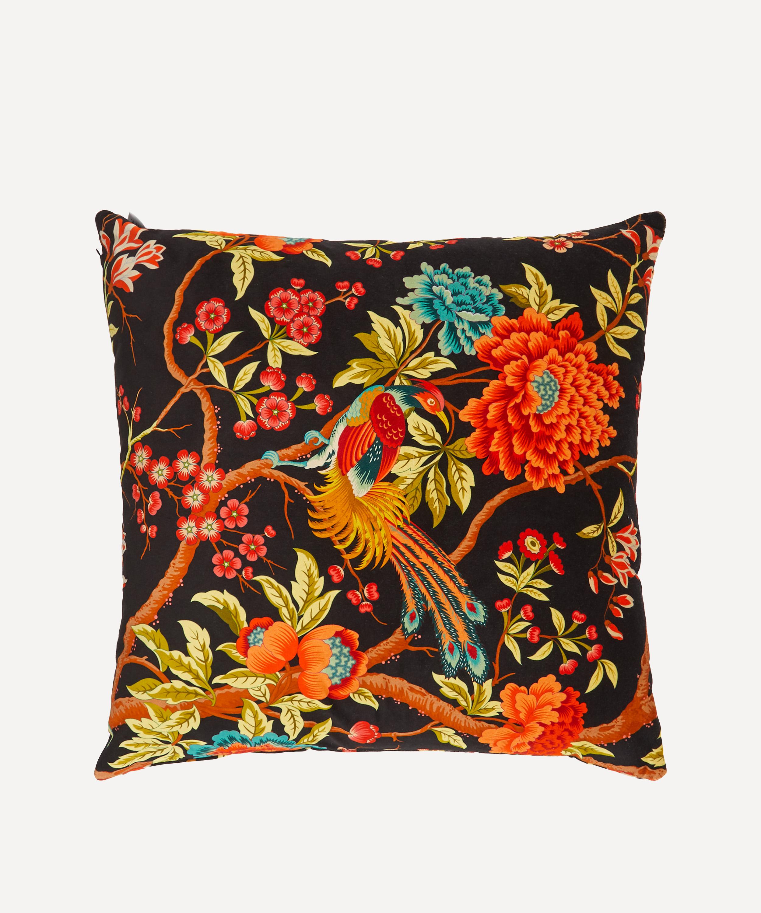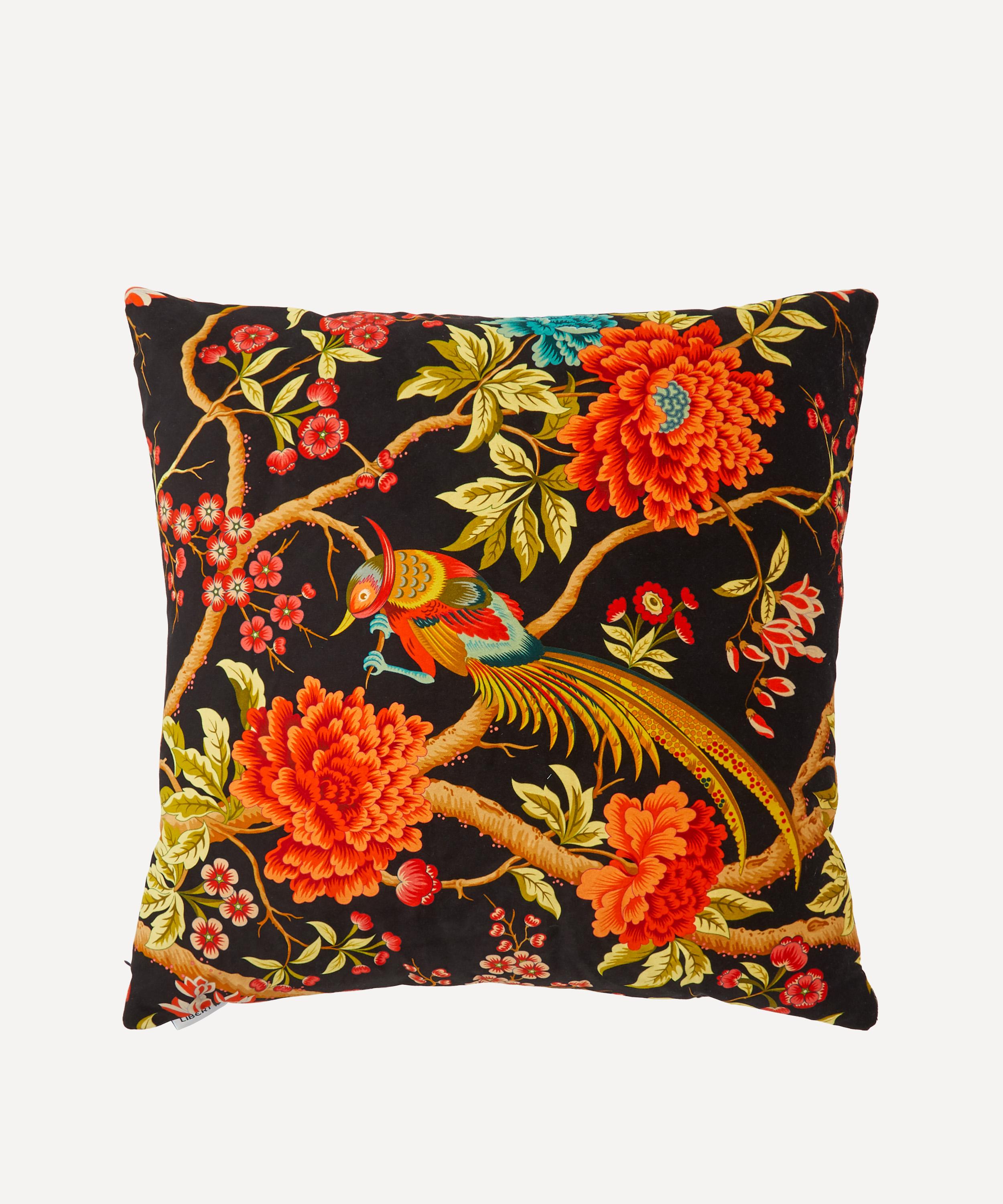 The large square velvet cushion features our Elysian Paradise layout – based on an original hand-painted furnishing design, it features a scattering of colourful birds perched among chrysanthemum and blossom branches. Its beautiful fluidity and intricacy have firmly cemented its status as a favourite among the Liberty team. Throw the cushion on a daybed or armchair, for a luxe archive-inflected approach to modern interior styling.
