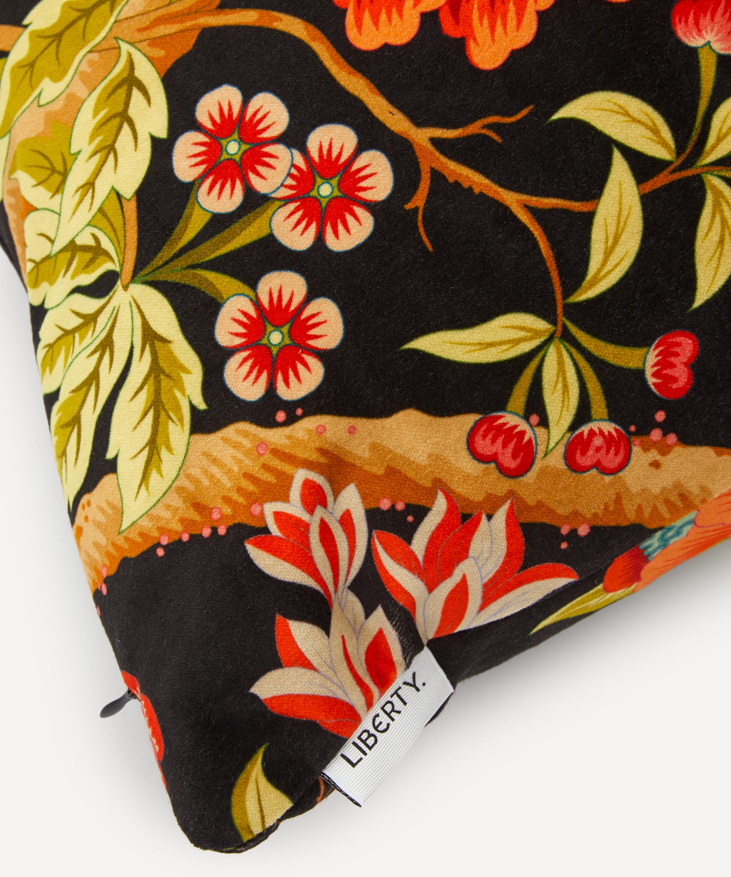 Liberty’s square velvet cushion is crafted in England from rich velvet with a plump duck feather filling, its vivid Elysian Paradise placement printed by experts in Italy.