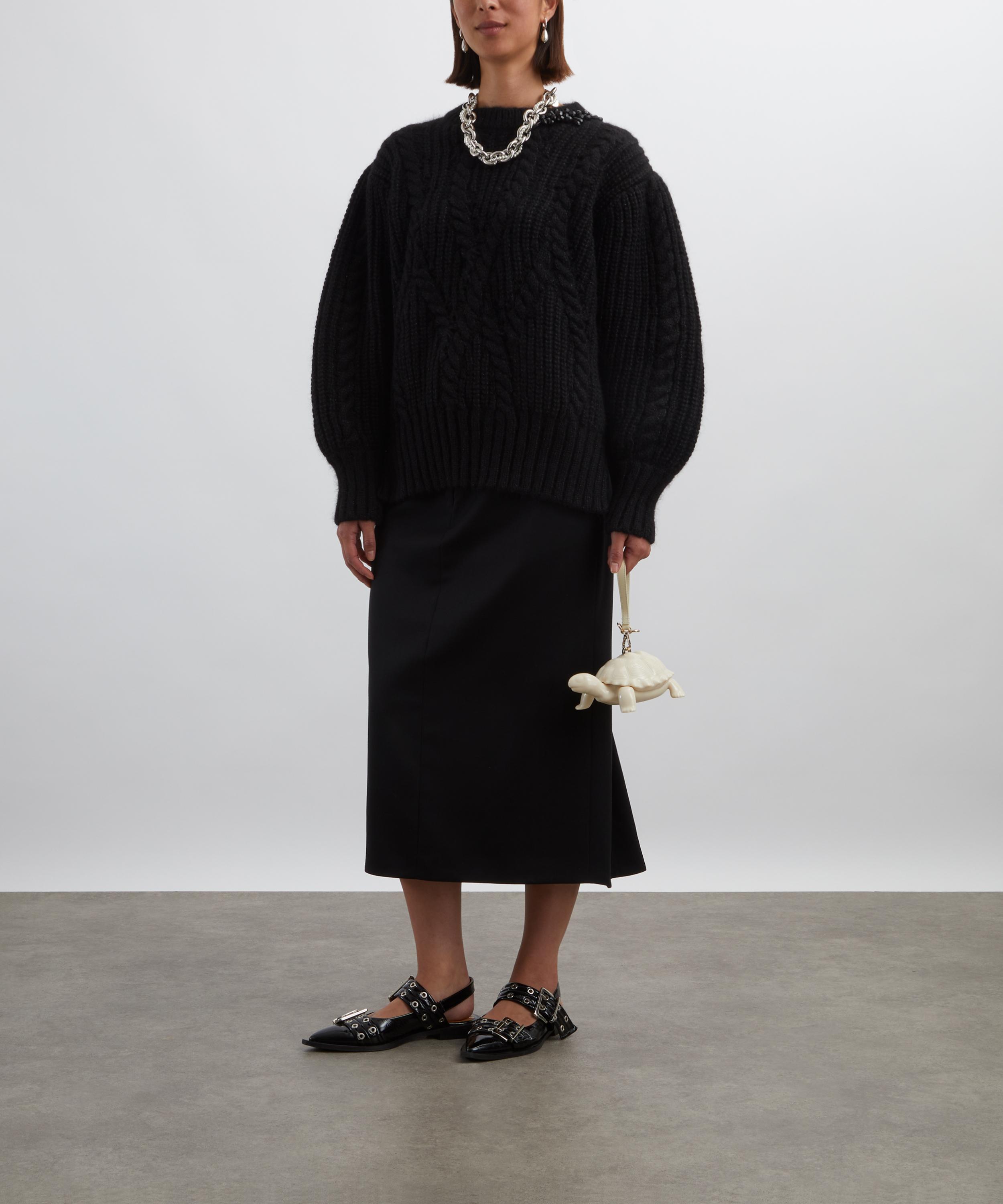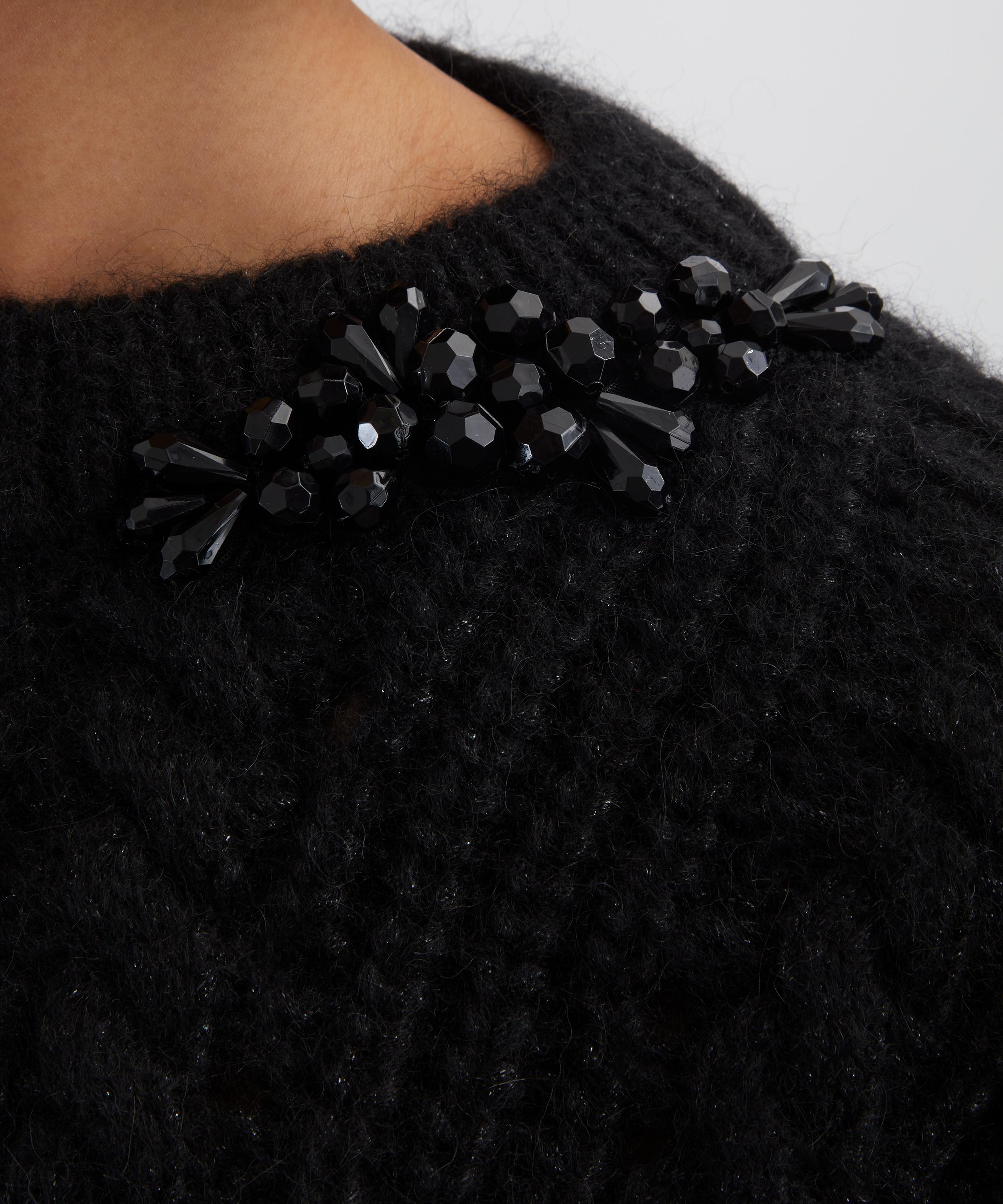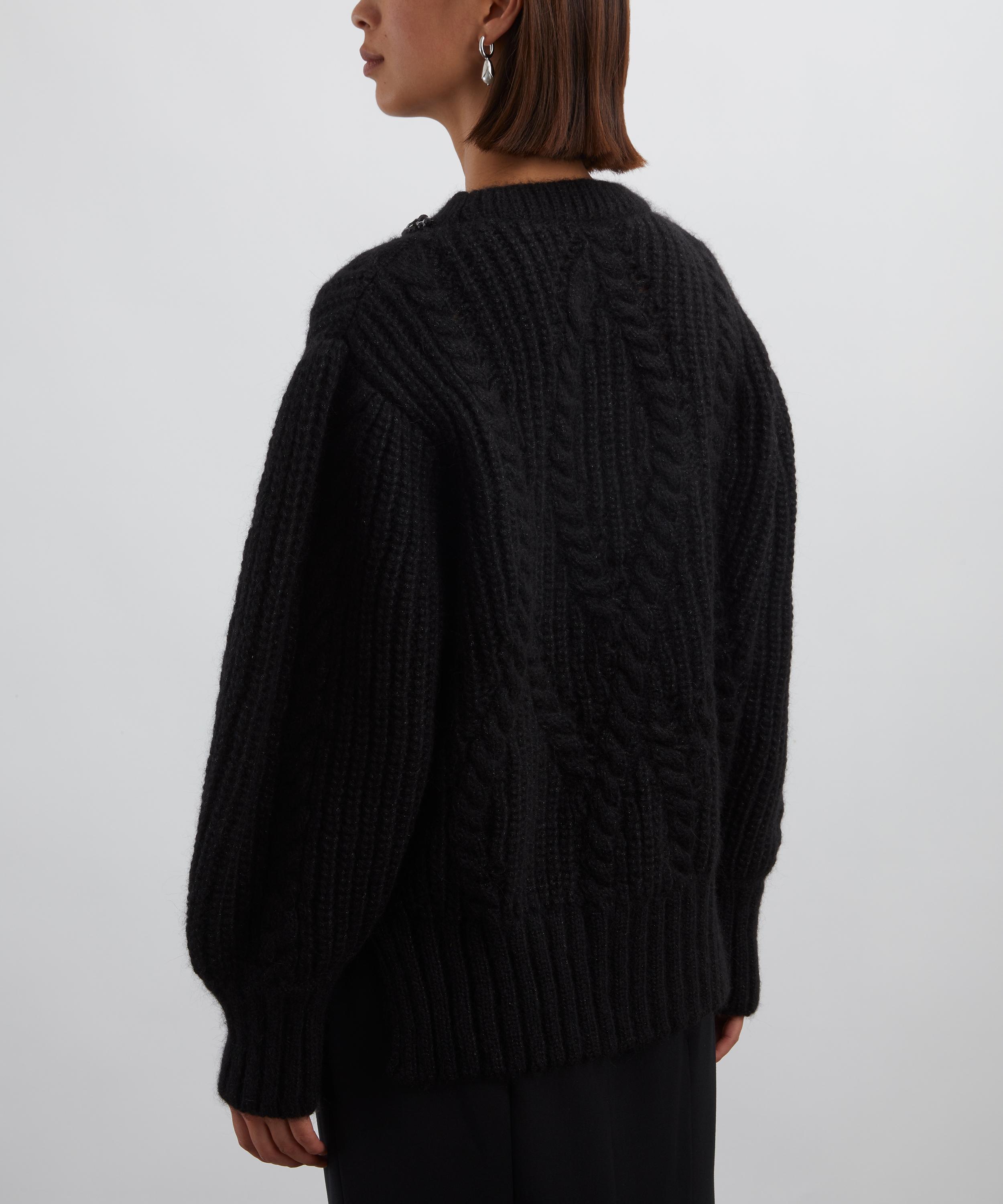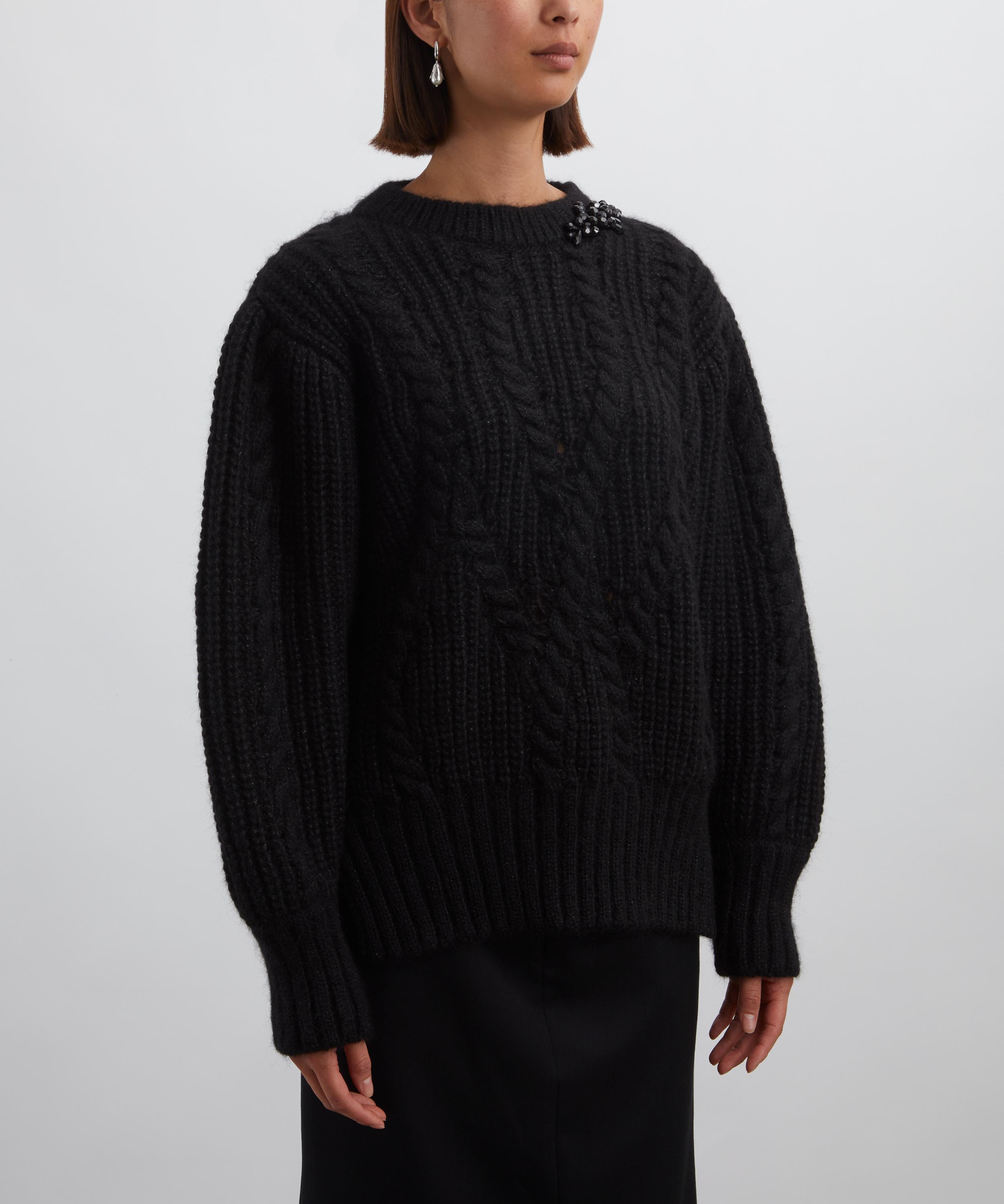 Crafted from a plush alpaca and Merino wool blend, this chunky jumper features an intricate Aran-style knit throughout. Its oversized silhouette, dropped shoulders, and balloon sleeves add relaxed volume, while glitzy beaded detailing at the neckline brings a touch of sparkle.