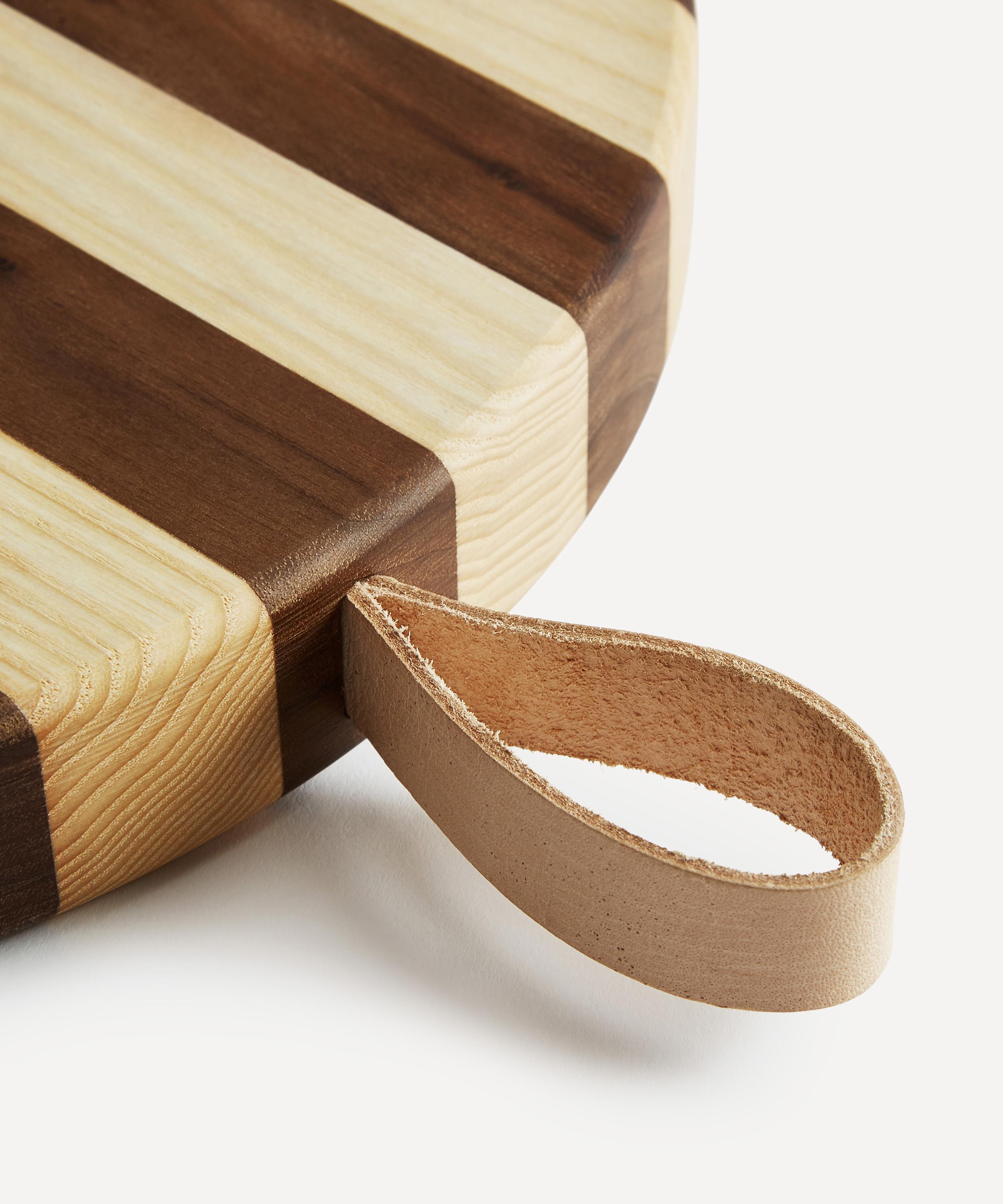 The sleek design of this dining staple is crafted from Italian walnut wood juxtaposed with a lighter-coloured ash to form its bold tonal stripe. Finished with a tan leather handle, this board is perfect for enhancing kitchen countertops or serving your home cooked creations.