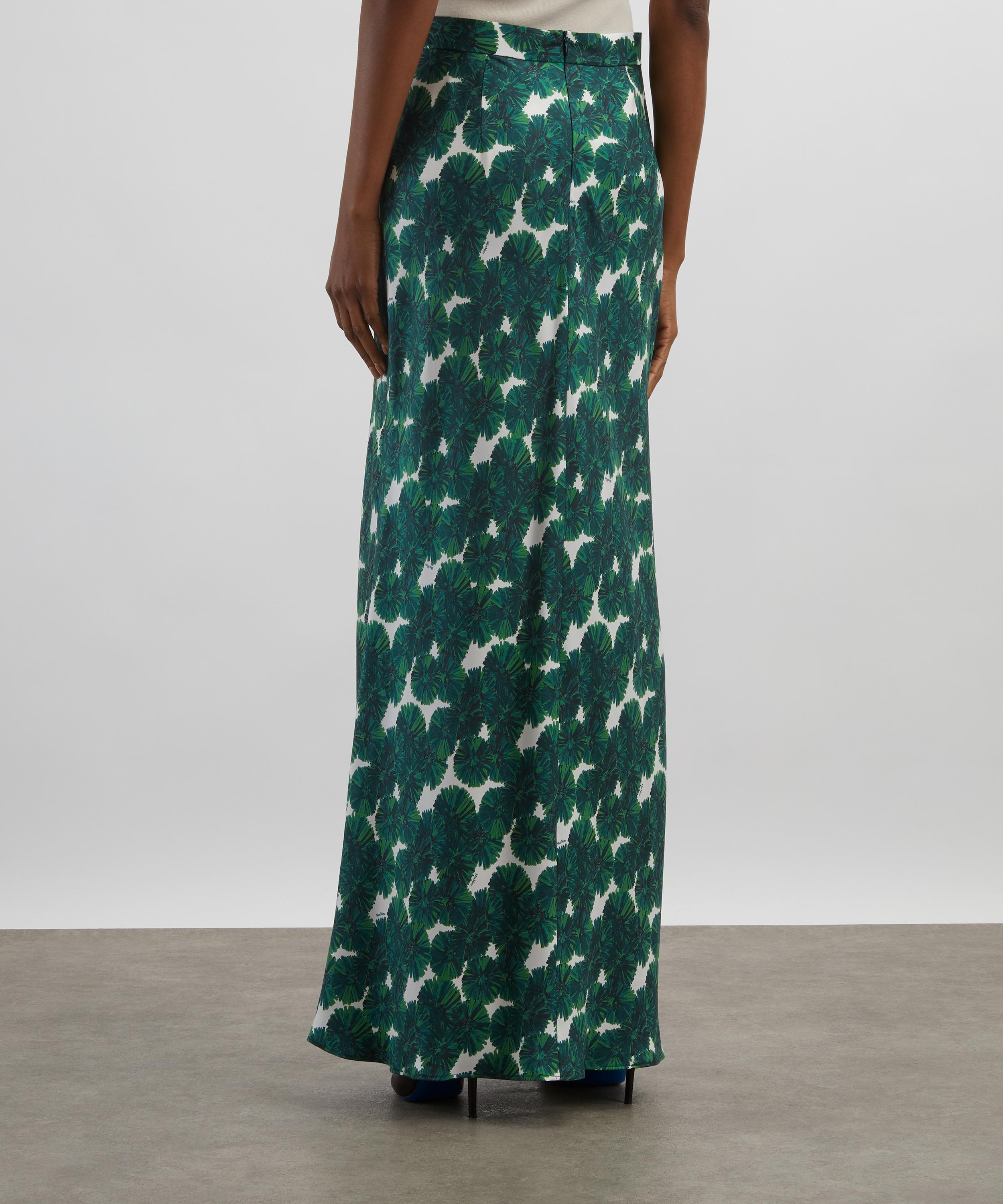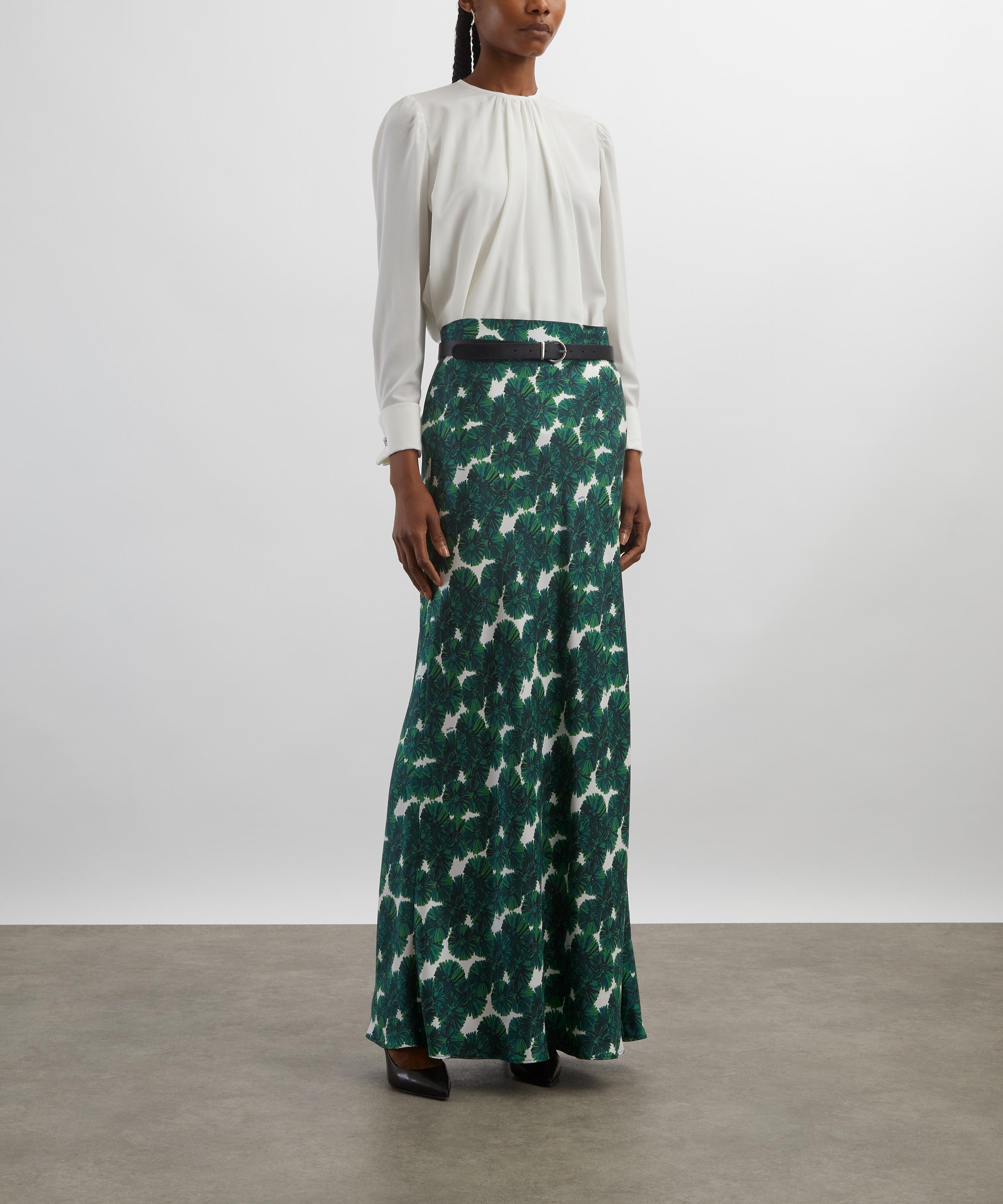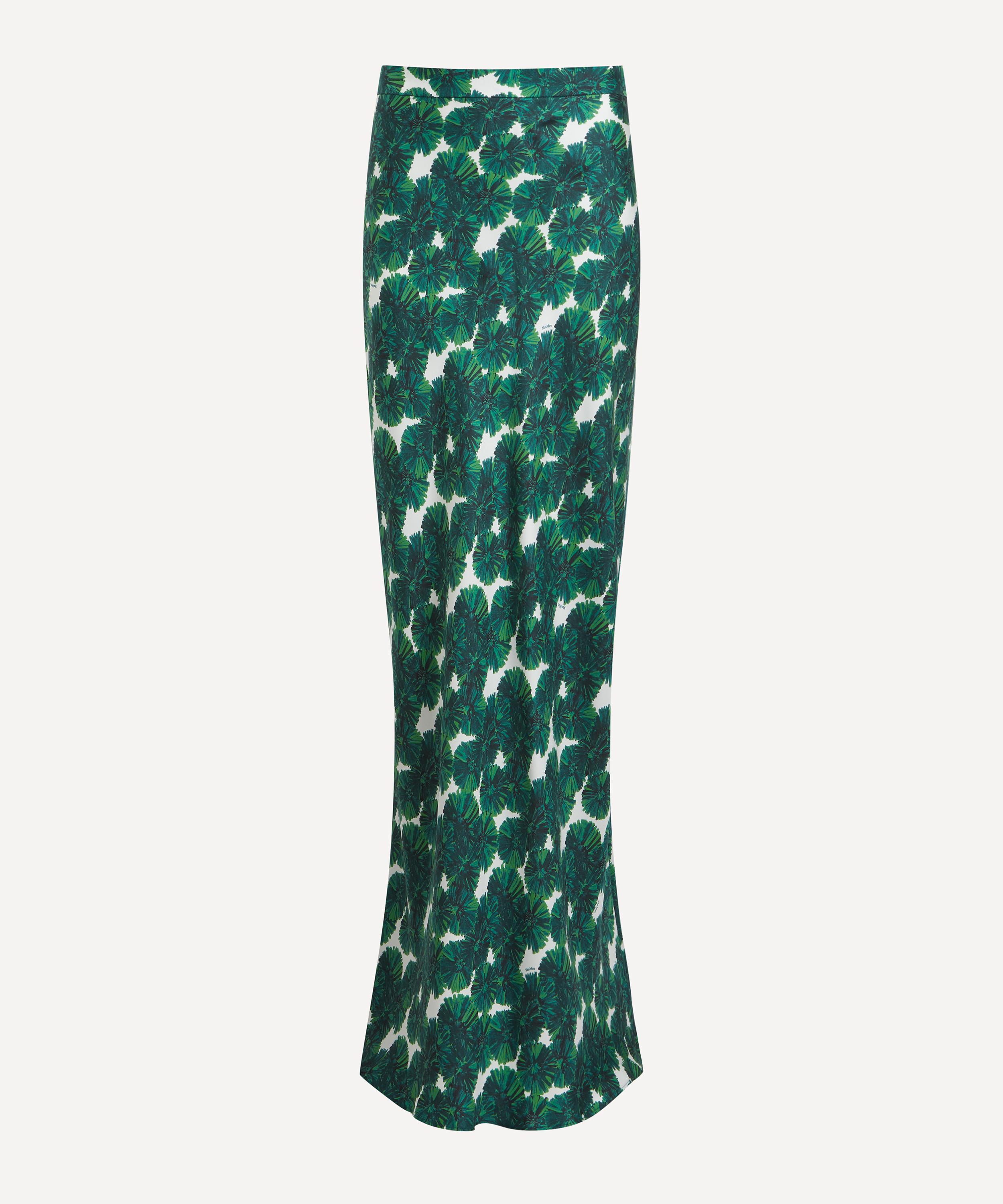 Crafted from pure silk twill with painterly green florals, this maxi skirt features a feminine, figure-skimming silhouette that drapes beautifully to the ankle for an effortlessly elegant look.