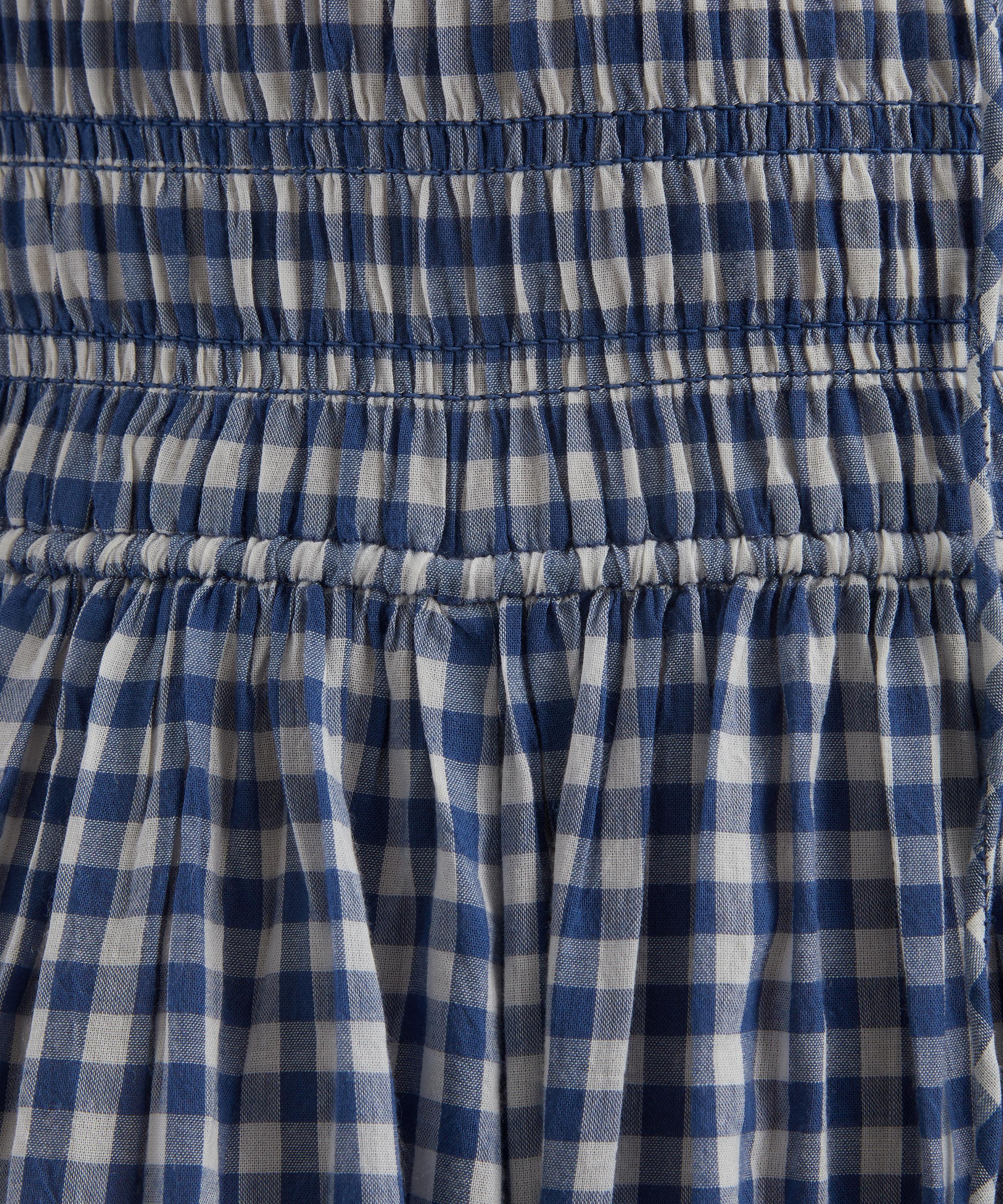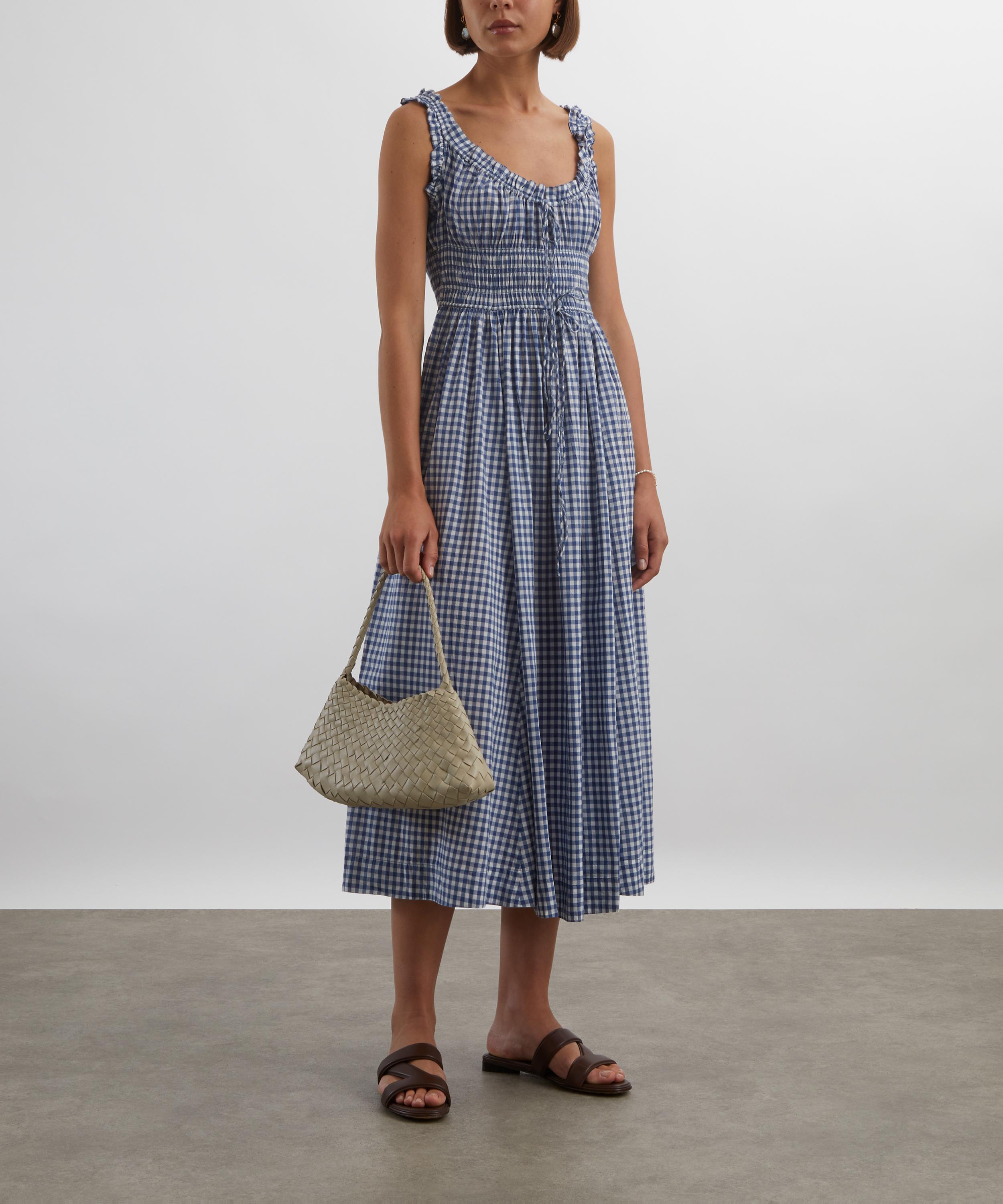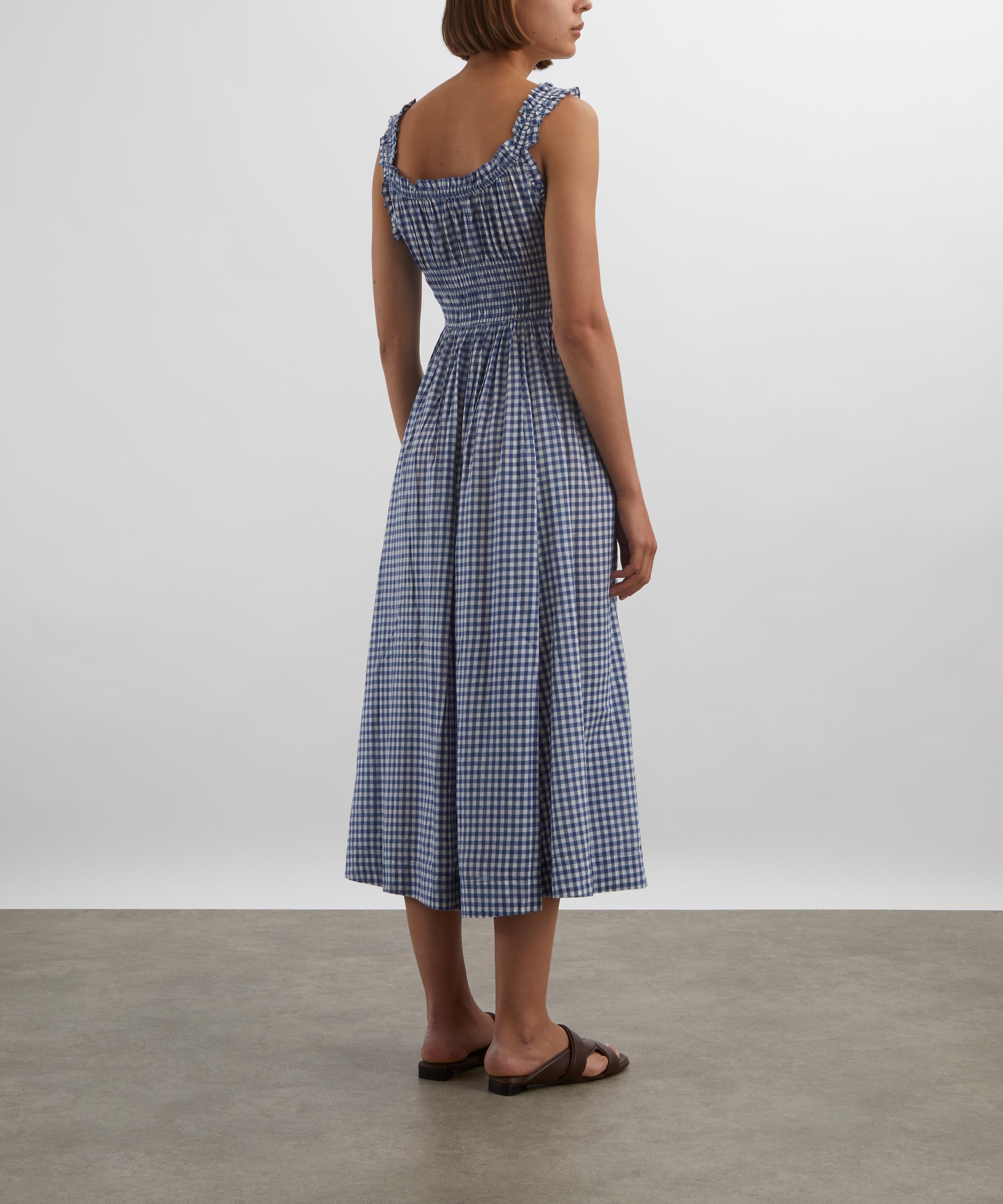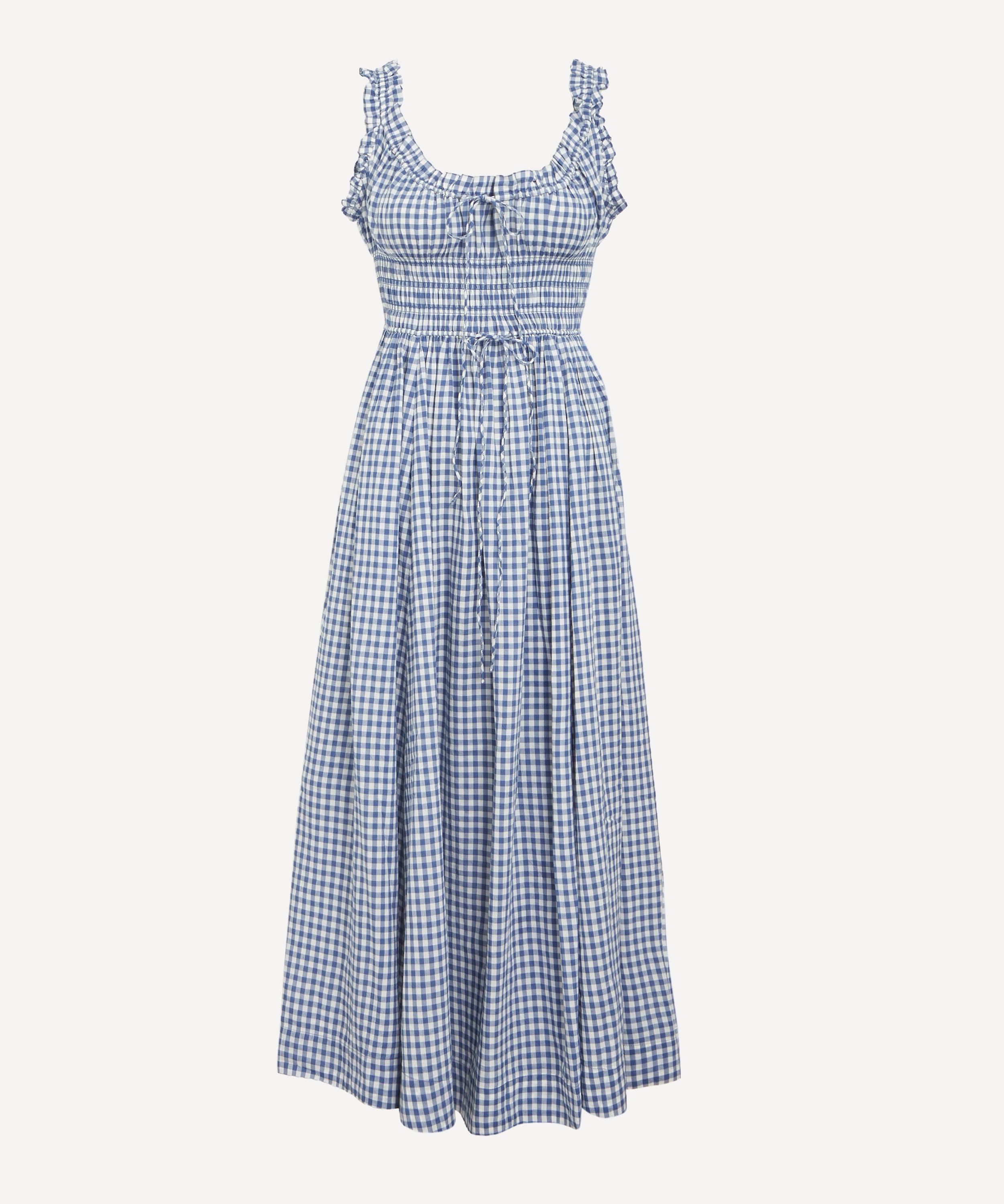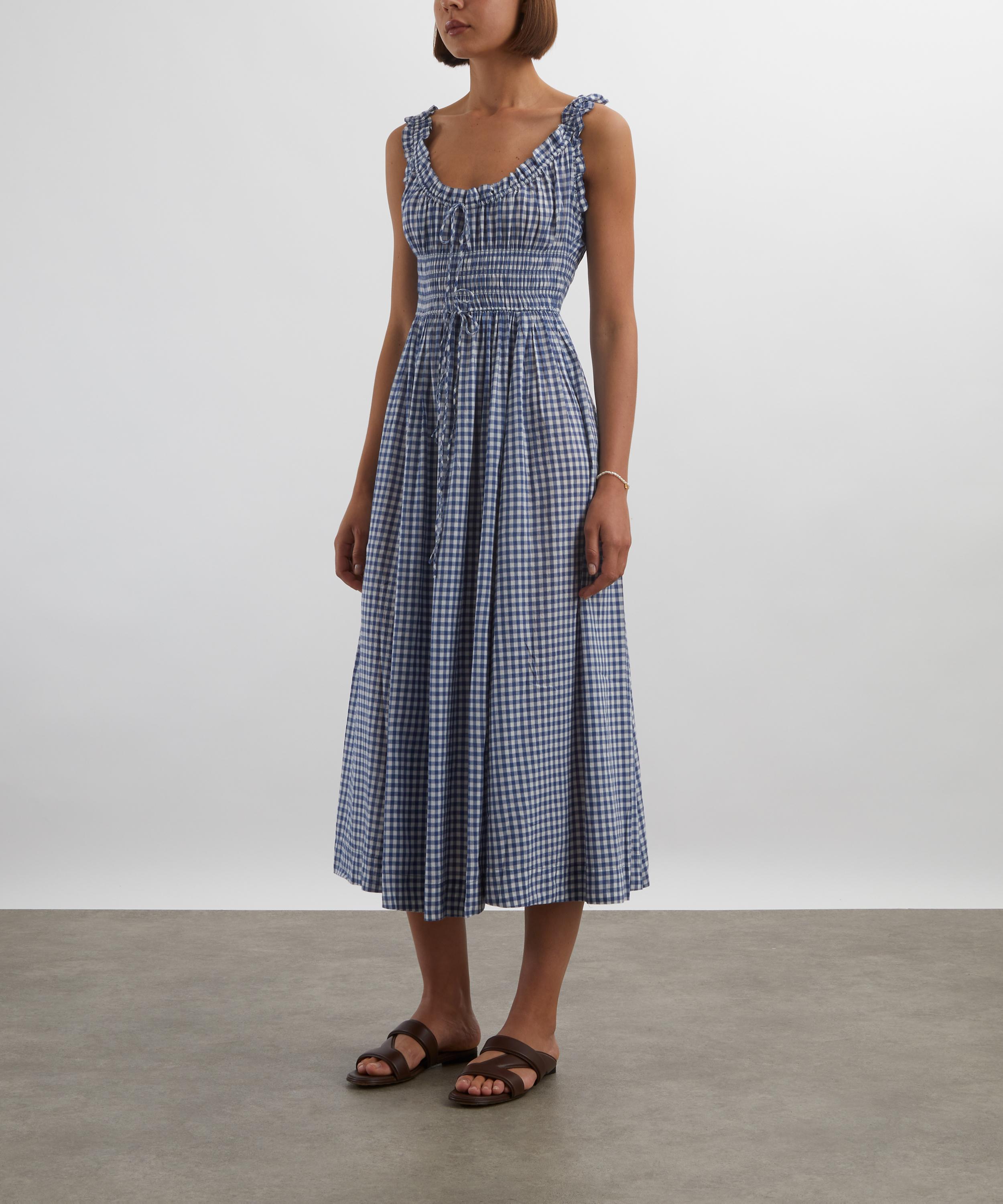 Crafted from soft, lightweight cotton in a classic blue gingham plaid, the Emmaretta features a scoop neckline, ruffle-trimmed straps, and a smocked bodice that flows into a full, ankle-grazing skirt.