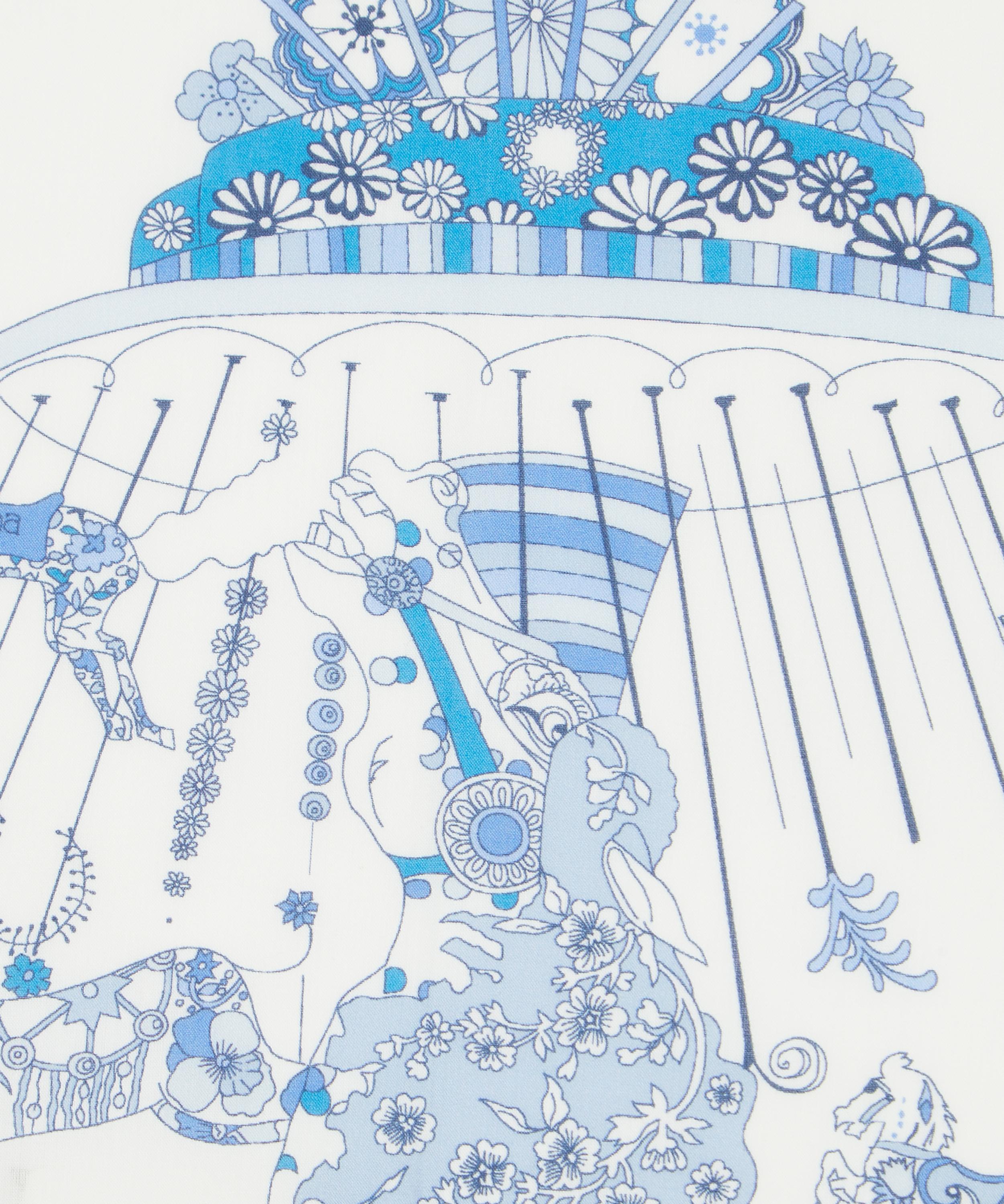 The beautifully painted carousels at old-style steam fairs were the inspiration behind Emolly Can-Can. Each of the horses are named and decorated with a Liberty print, with flowers spilling over into the background of this charming design.