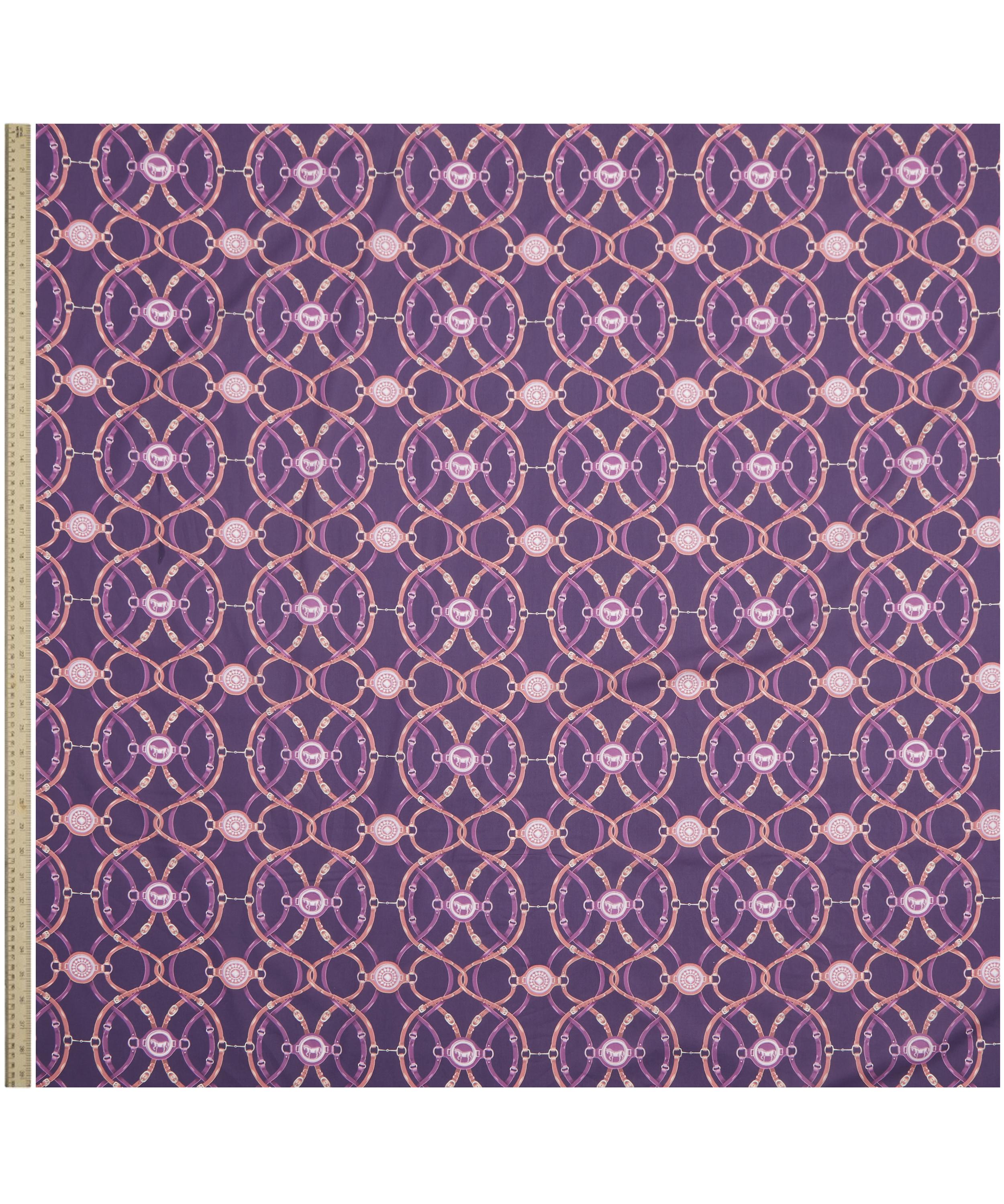 Horse tack and bridles have been cleverly arranged to create a mirrored design. Equestrian was hand-painted in the Liberty design studio using gouache to create the shadows and highlights of the leather and metallic elements.