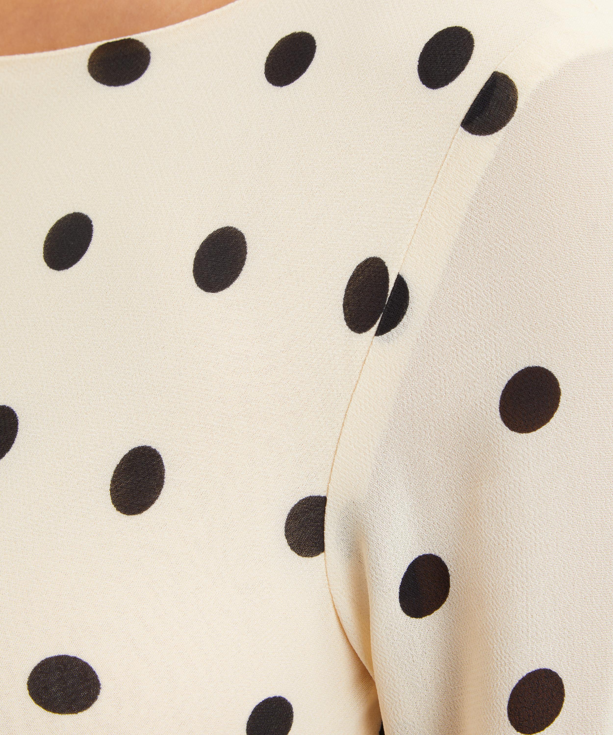 Adorned with a classic cream and black polka-dot pattern, this maxi dress flatters with a fitted silhouette, boat neckline, and sweeping bell sleeves.