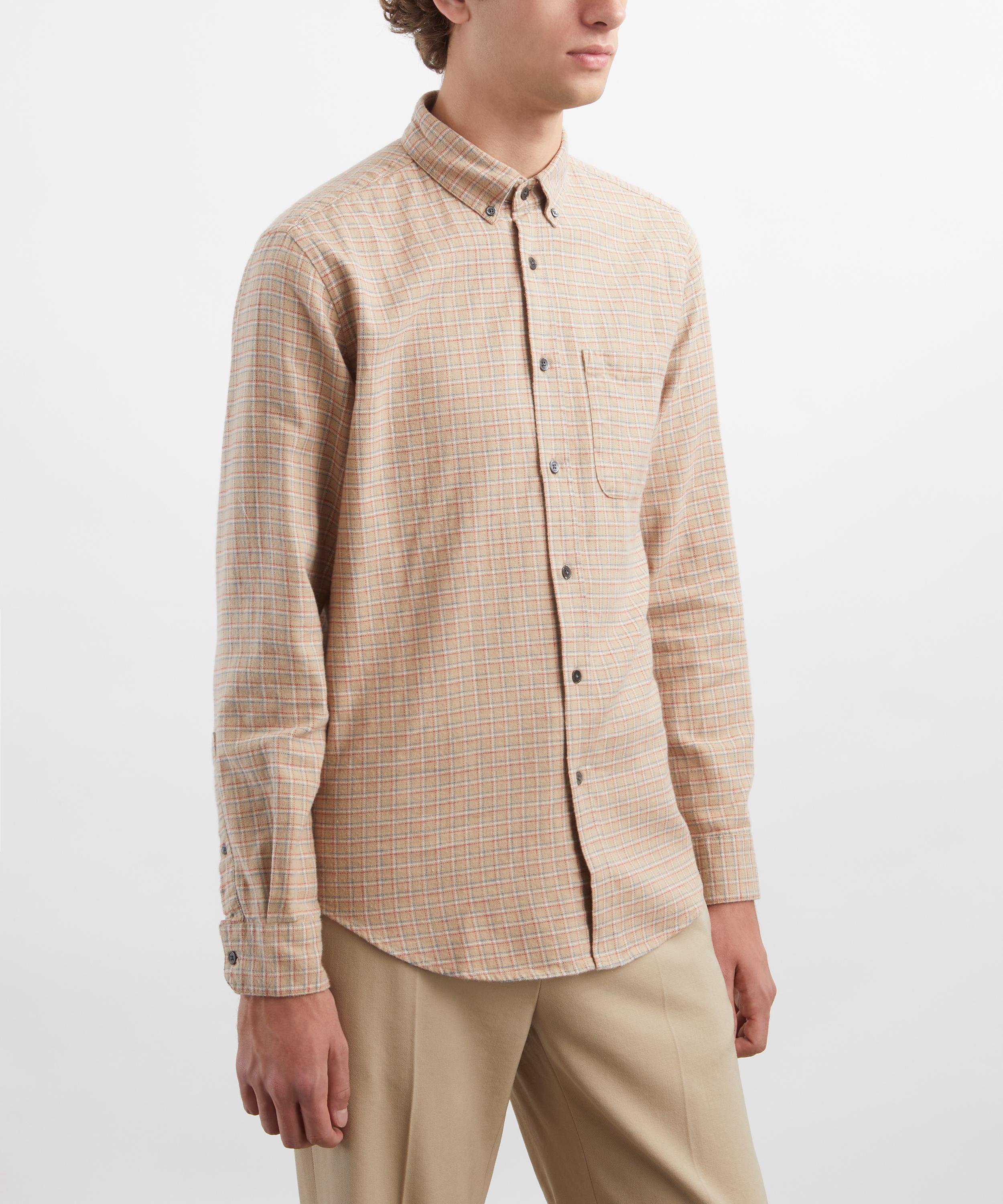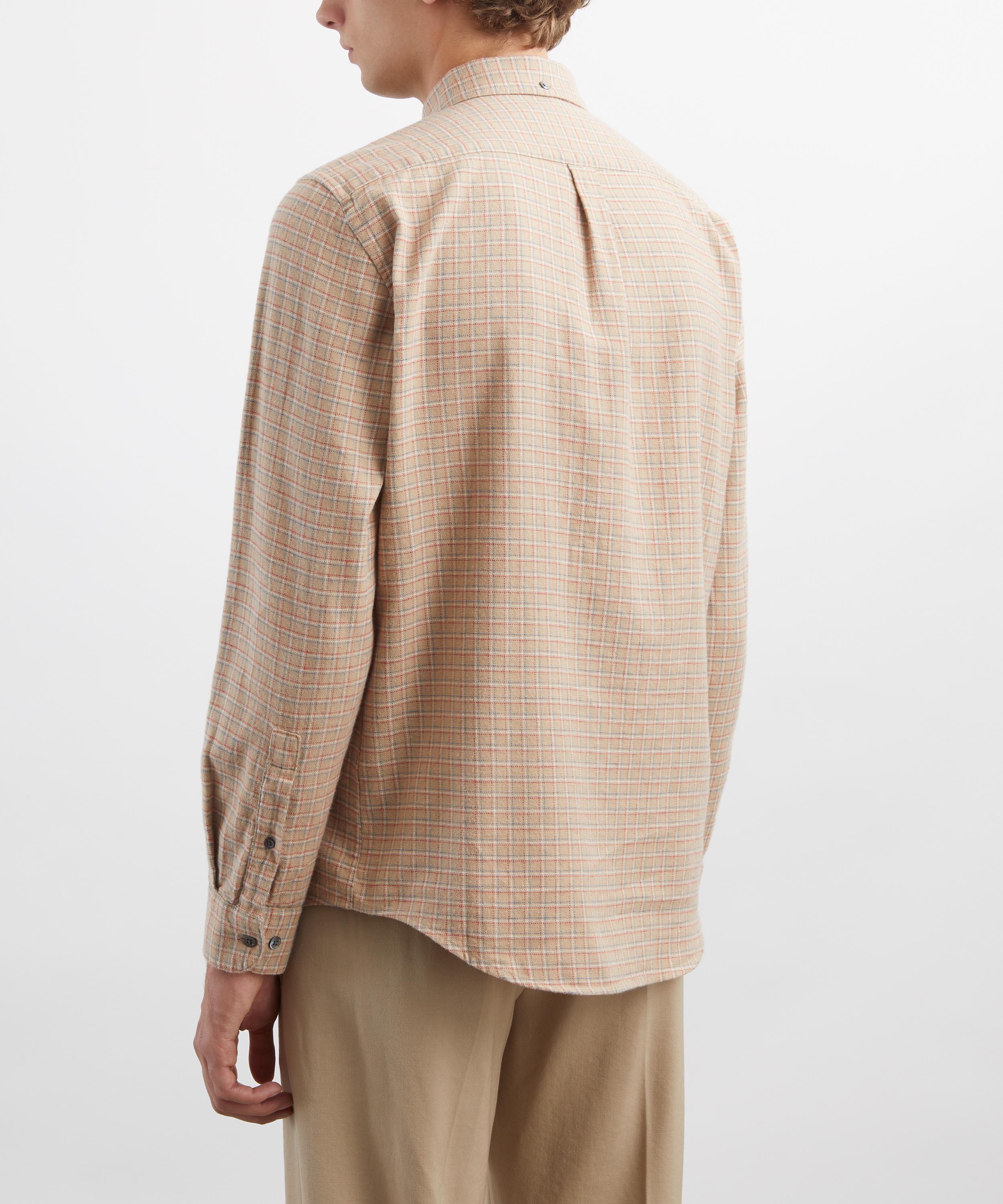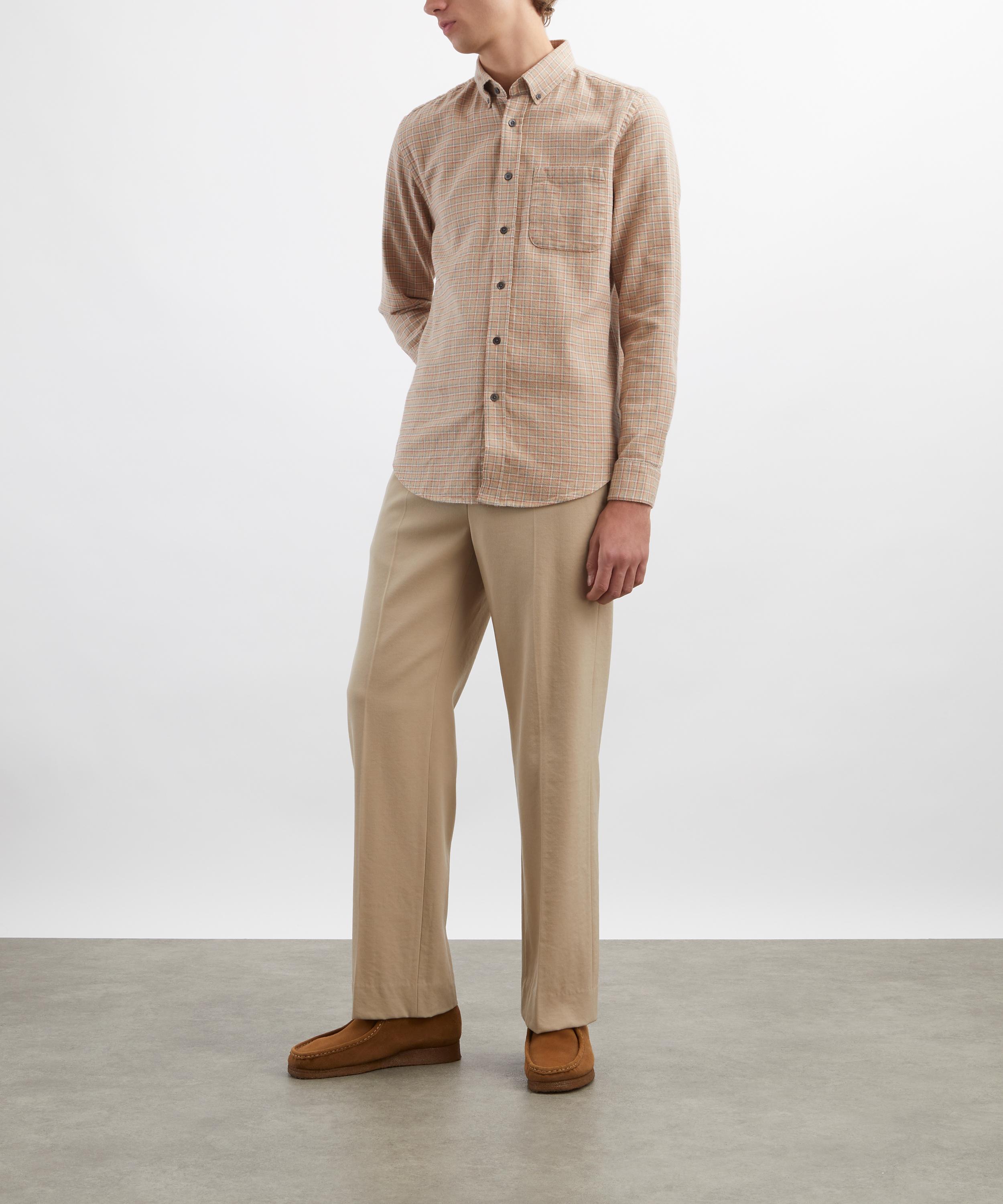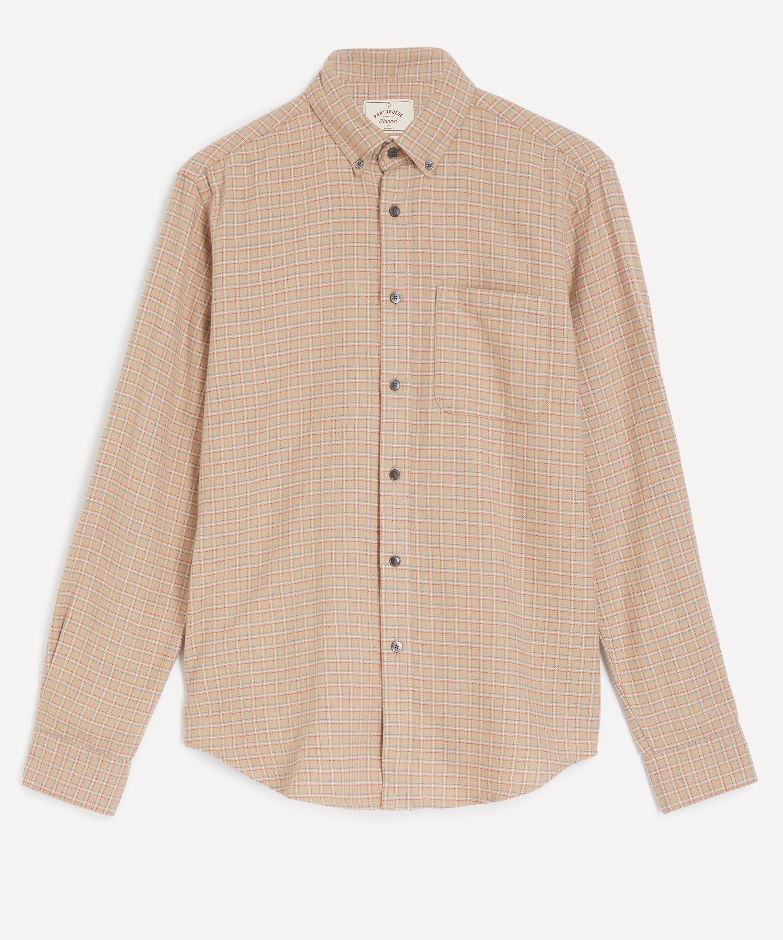Crafted from brushed cotton adorned with a pink check pattern, this shirt features a button-down collar, mother-of-pearl button fastening, and a single chest pocket - offering timeless utilitarian style with a modern edge.