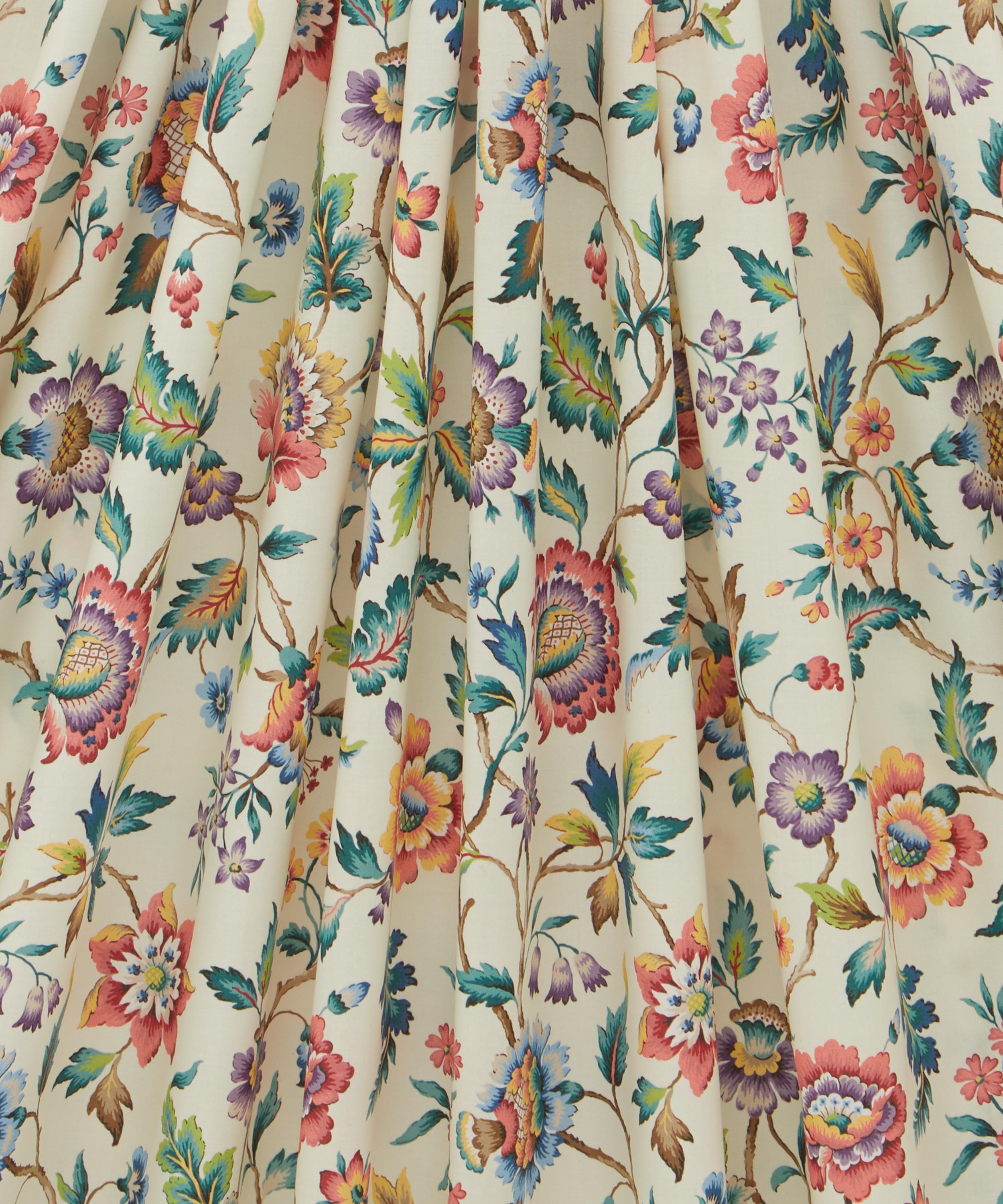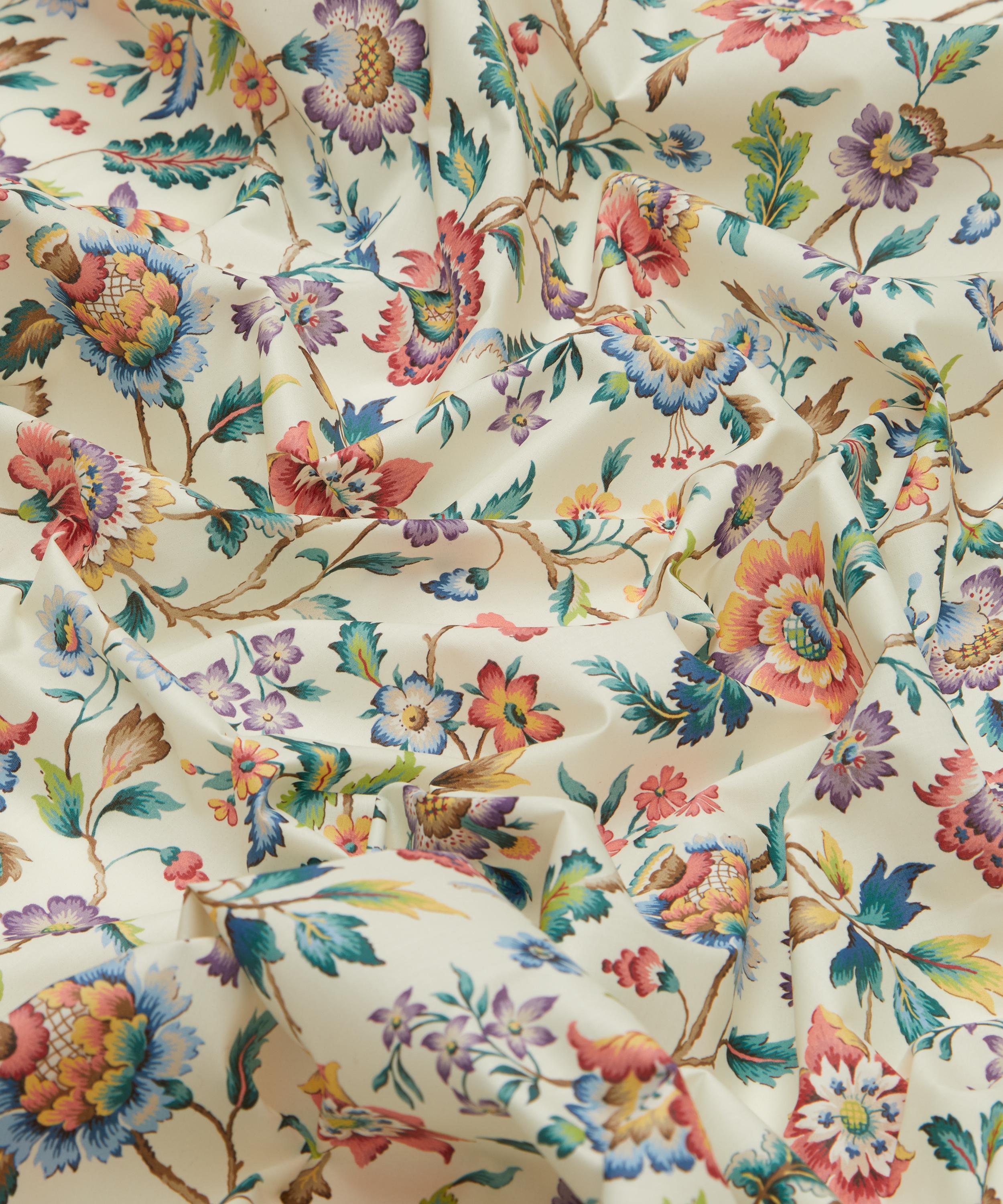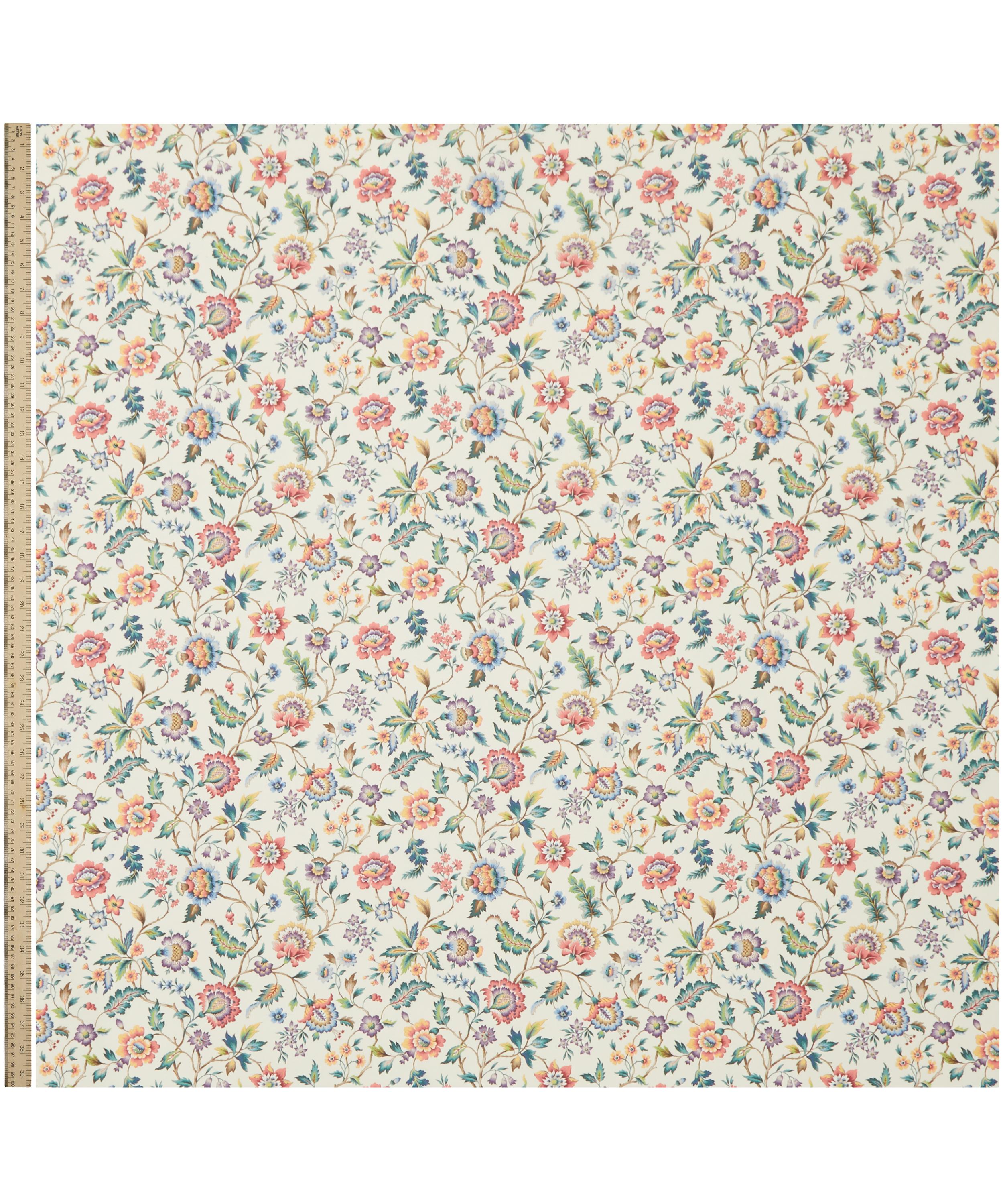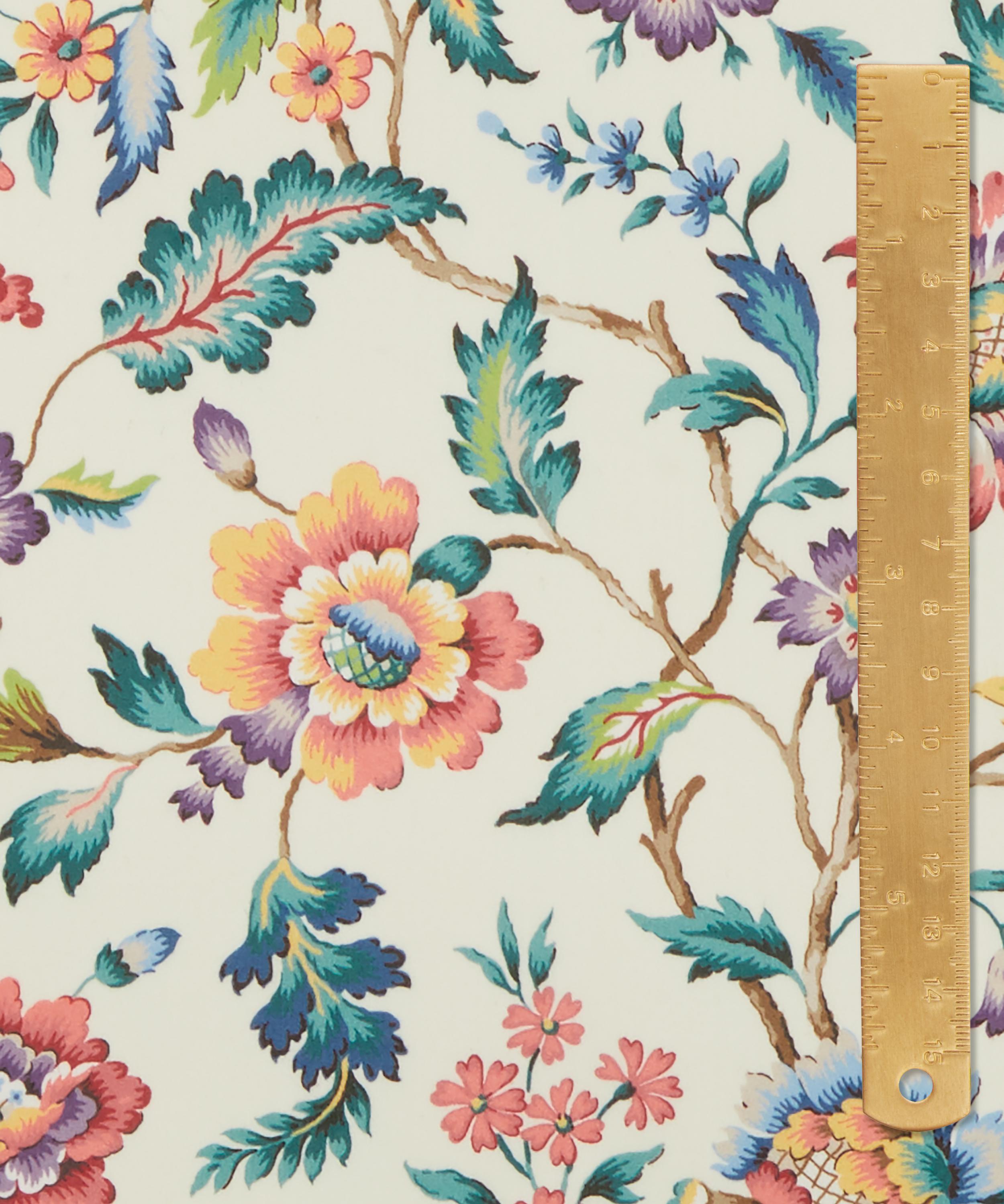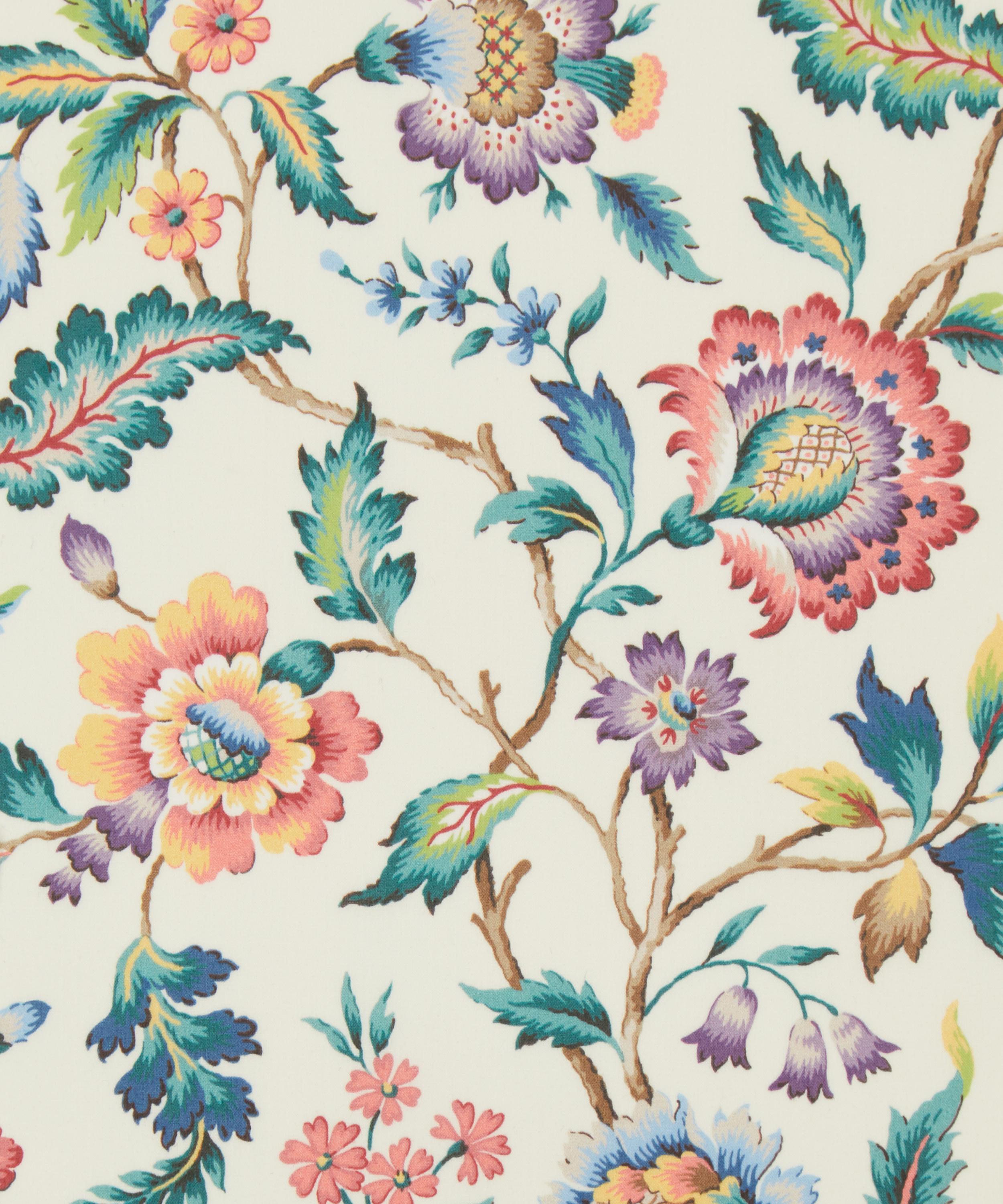 Eva Belle is inspired by a design from the Liberty archive, originally created between the 1910s and 1930s in Jacobean needlework style. A Tree of Life arrangement, it features stylised florals with winding leaves and intricately shaded petals in soft jewel-tone colourways.
