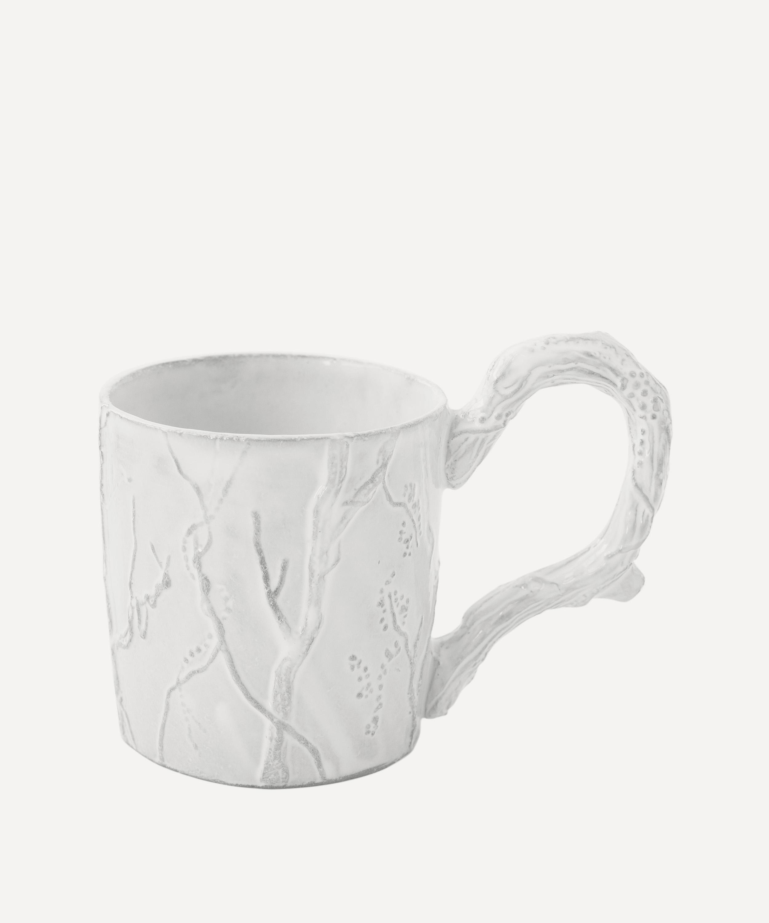 Votary of pre-industrial fabrication, Astier de Villatte is celebrated for being the one and only studio in Paris to hold and harbour the traditions of artisanal ceramic production. Restoring the ancestral systems of moulding and stamping, this piece is made using techniques from the Middle Ages which involve moulding a sheet of handmade clay, double firing the ‘biscuit’ piece and glazing the product in white enamel – a lengthy process that requires a drying time of up to one month. Characterised by the subtle tree motif that adorns the cup and the irregular, branch-inspired handle, this charming piece is complete with the brand’s signature crest - depicting an interlacing A & V. Each handmade piece tells a beautiful story, it romances and imparts a sense of nostalgia into its owner. Arrange with the teapot and mugs from the collection to breathe an air of authenticity into your breakfast setting.