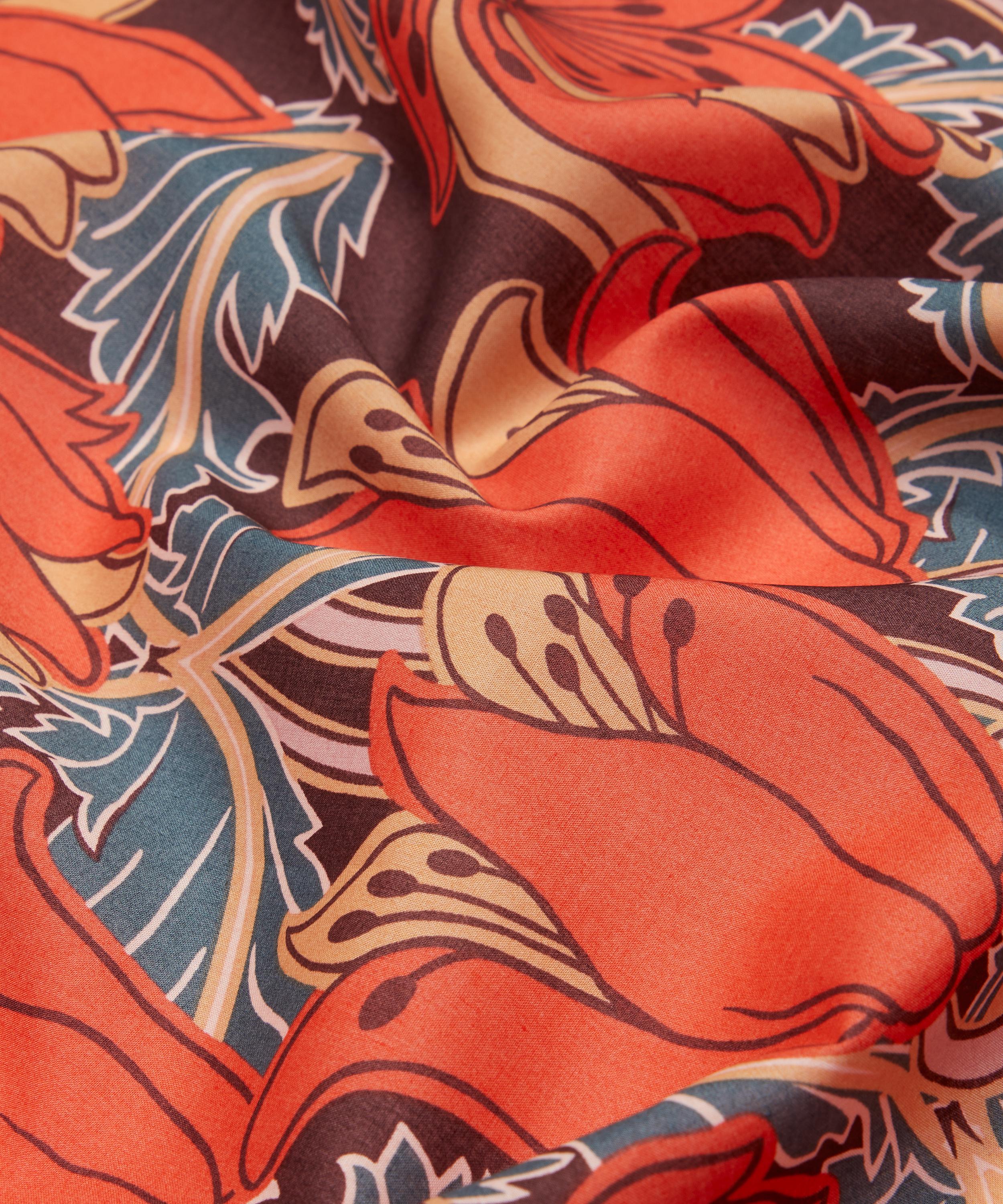 Championed by Liberty throughout the ages, the wonderful lily flower in its various forms was closely associated with the Aesthetic, Arts & Crafts as well as Art Nouveau movements. Inspired by a hand-painted artwork discovered in the Liberty archive, this large-scale portrait is a modern rendition of the original, featuring stylised blooms over an undulating, acanthus leaf trail. This print is part of the Floral Library narrative of the AW24 collection, which studies the subject through the Botanist’s eye, cataloguing and exploring an assortment of species as well as a being a celebration of key florals throughout Liberty’s history.