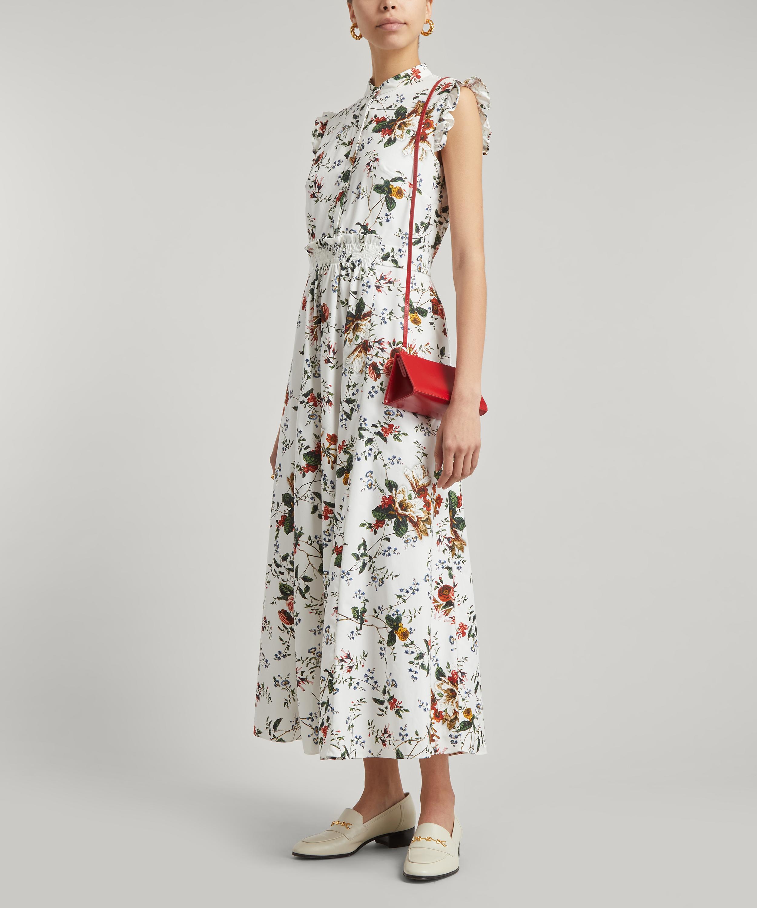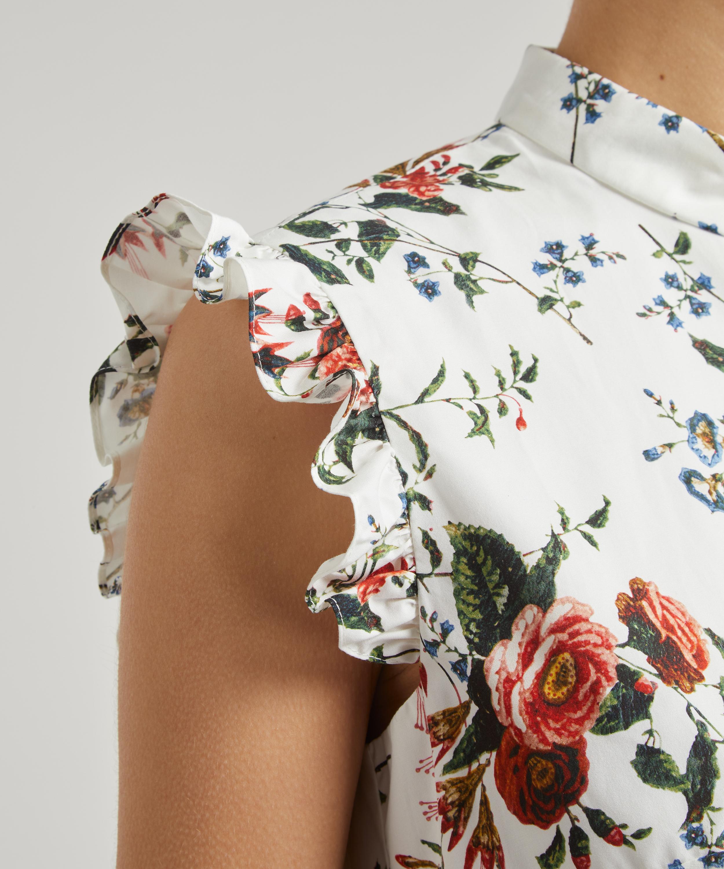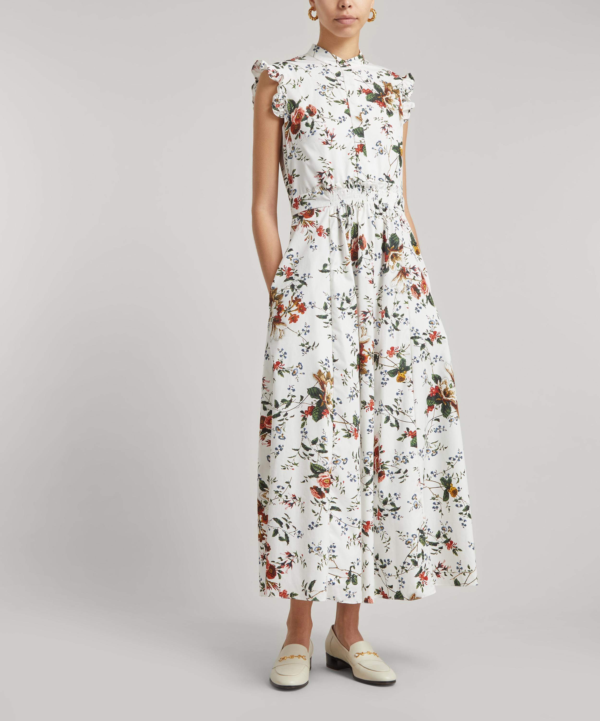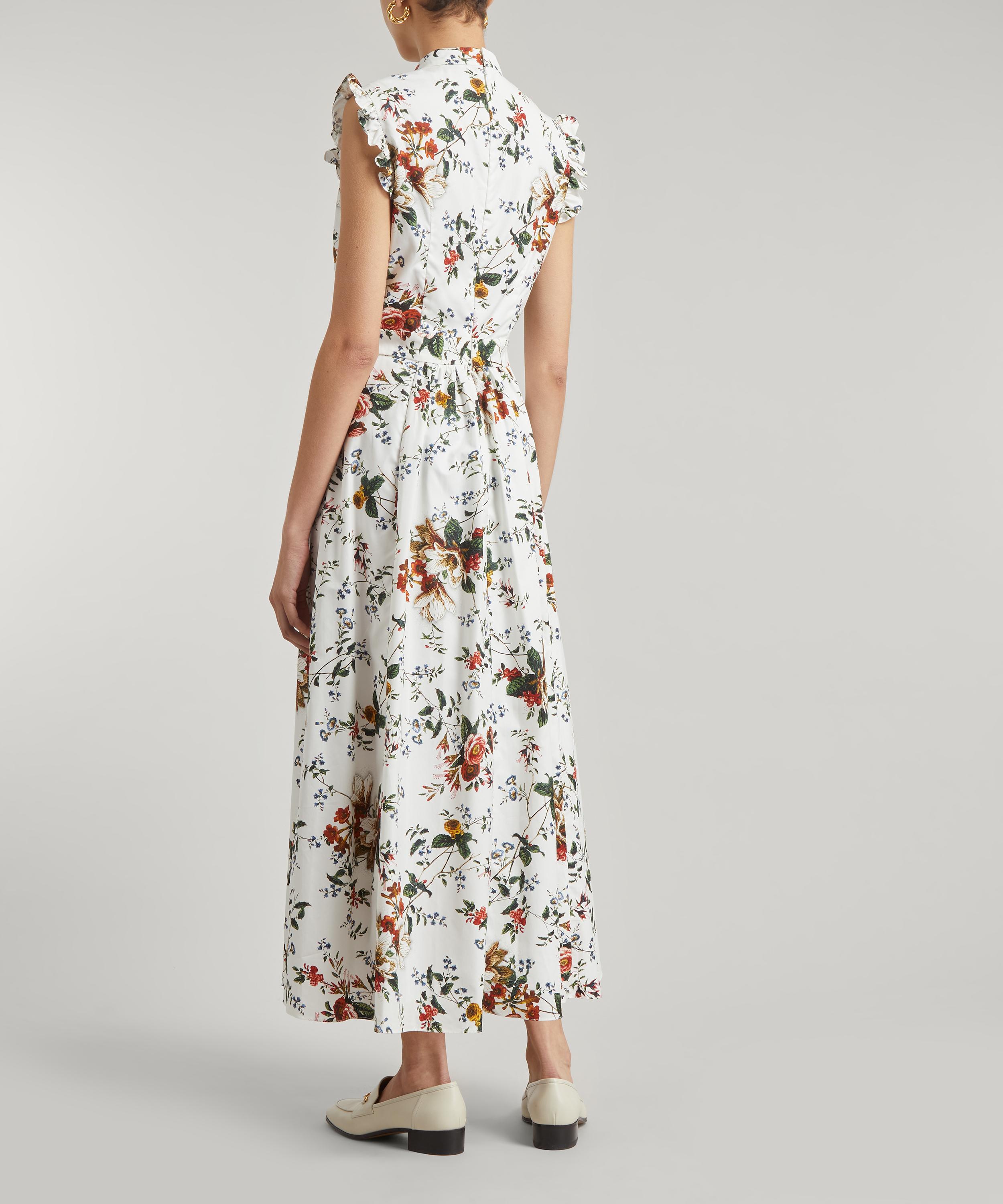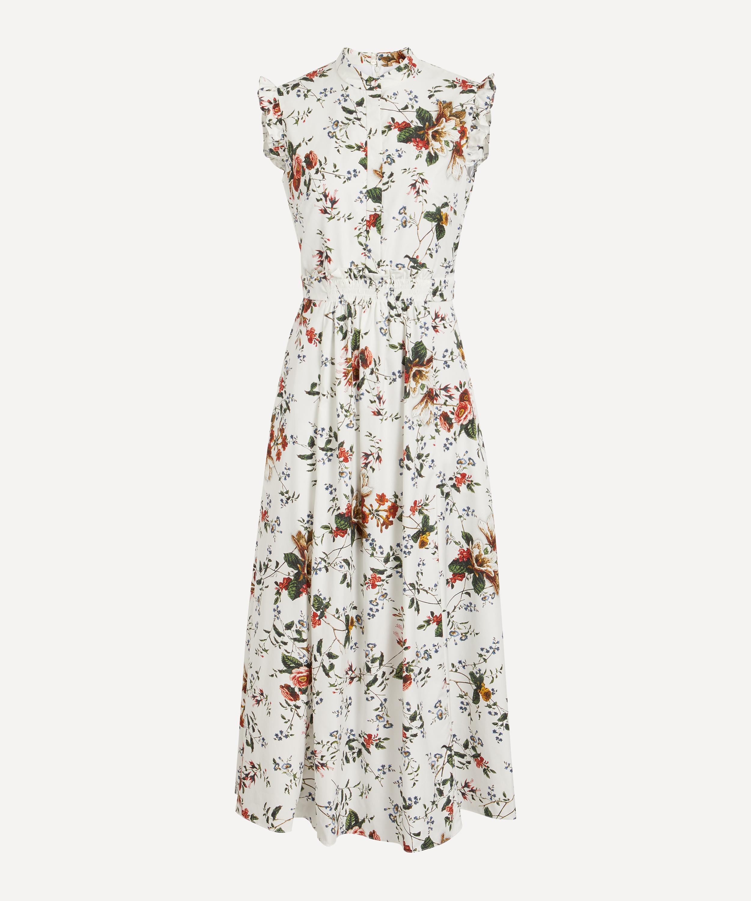 Impeccably crafted from a premium cotton-rich composition, this beautiful dress is adorned in a glorious floral print and finished with charming frill details to the cuffs. The mid length cut is timelessly elegant, meanwhile the floaty fit lends a whimsical touch. Featuring a high neckline for added sophistication, this wonderful piece is illuminated by a glorious selection of bold tones that contrast wonderfully with the ecru fabric. Partner with cream flats and gold accessories for an effortlessly elegant ensemble.
