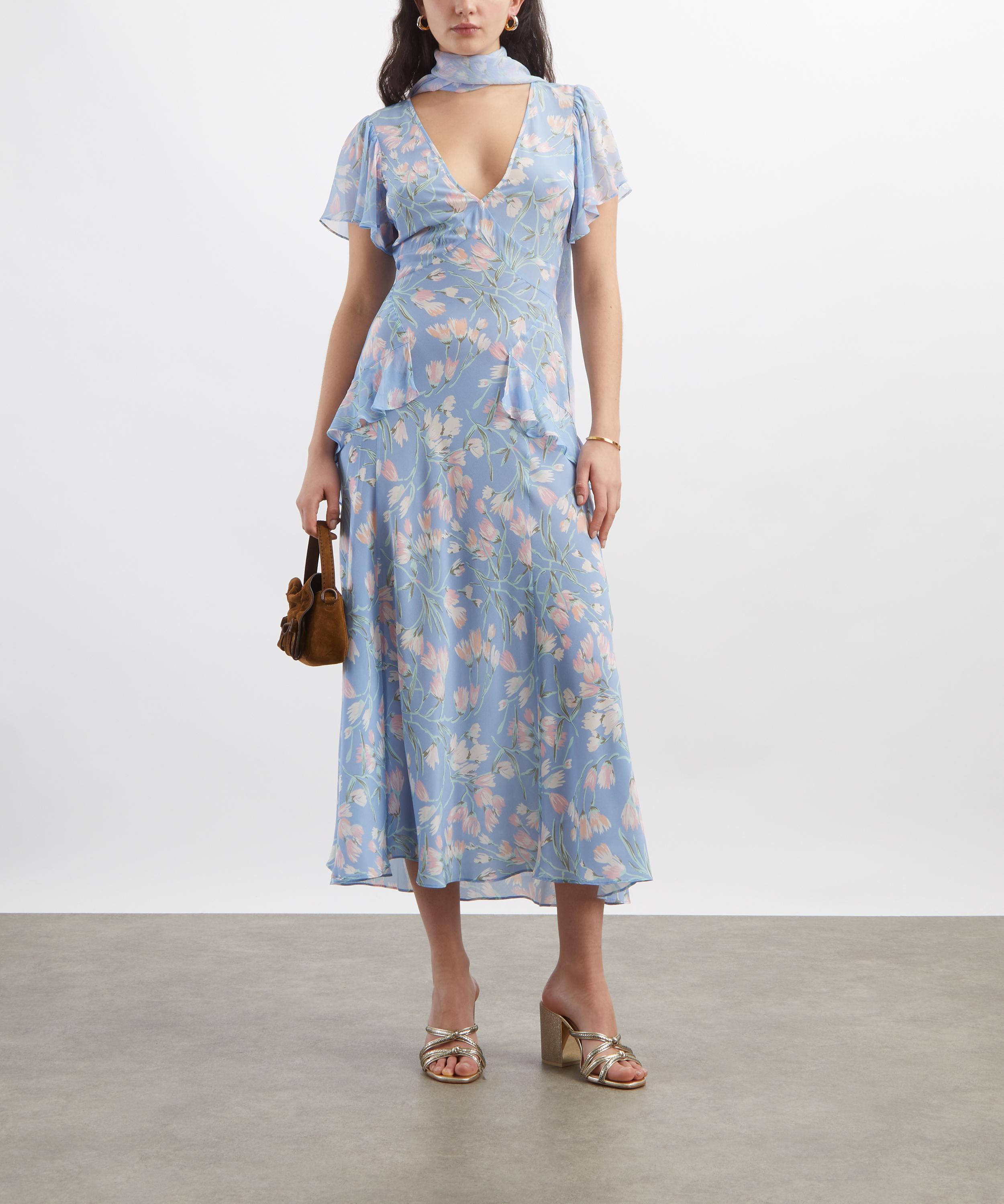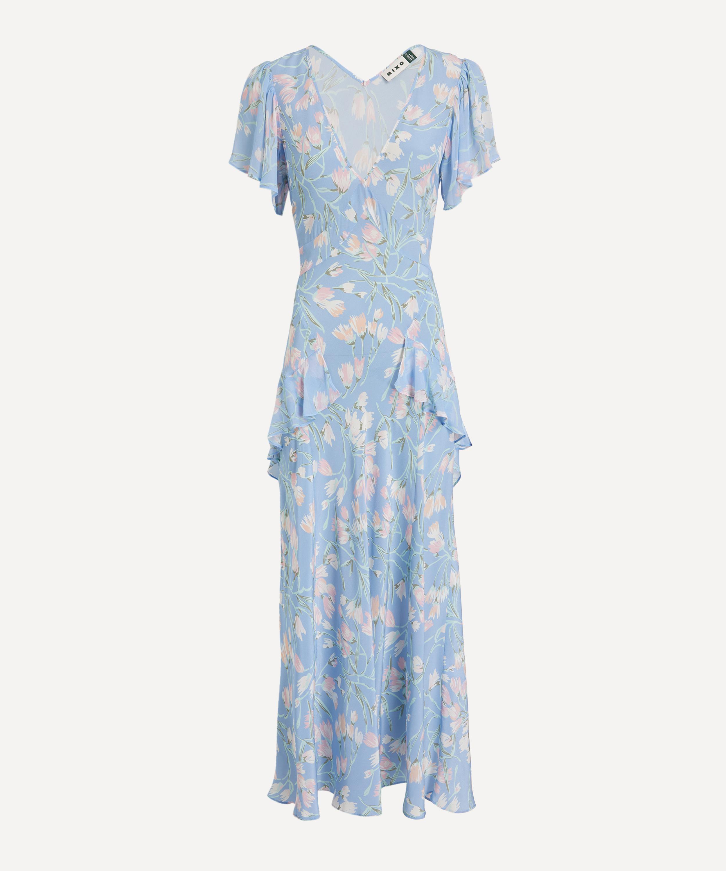 Crafted from lightweight silk adorned with a pastel blue floral print, this romantic, vintage-inspired dress embodies refined femininity. A classic V-neckline, short butterfly sleeves, and fluttering ruffles channel a subtle 1970s sensibility, making it equally suited to weddings, work, or holidays.