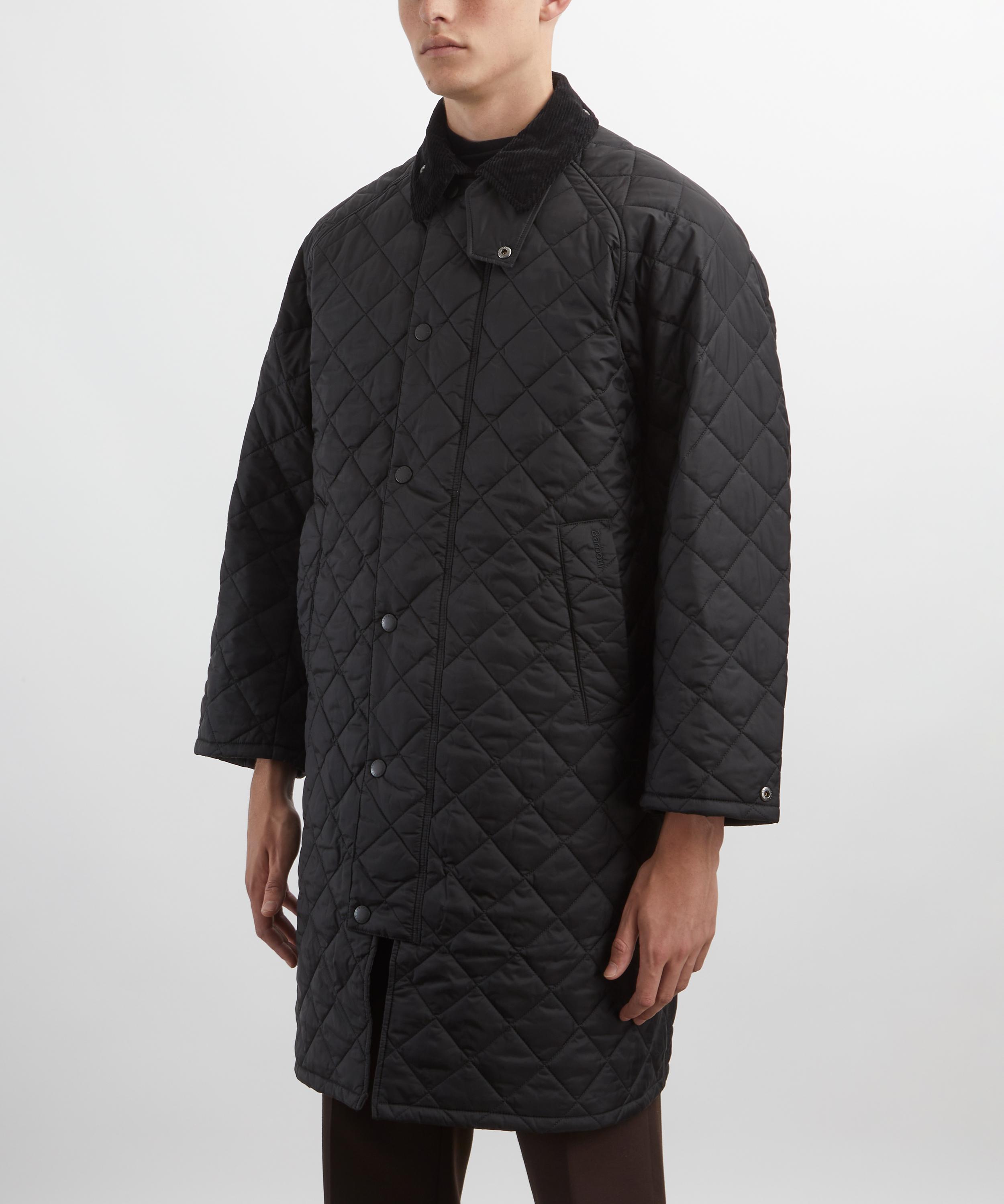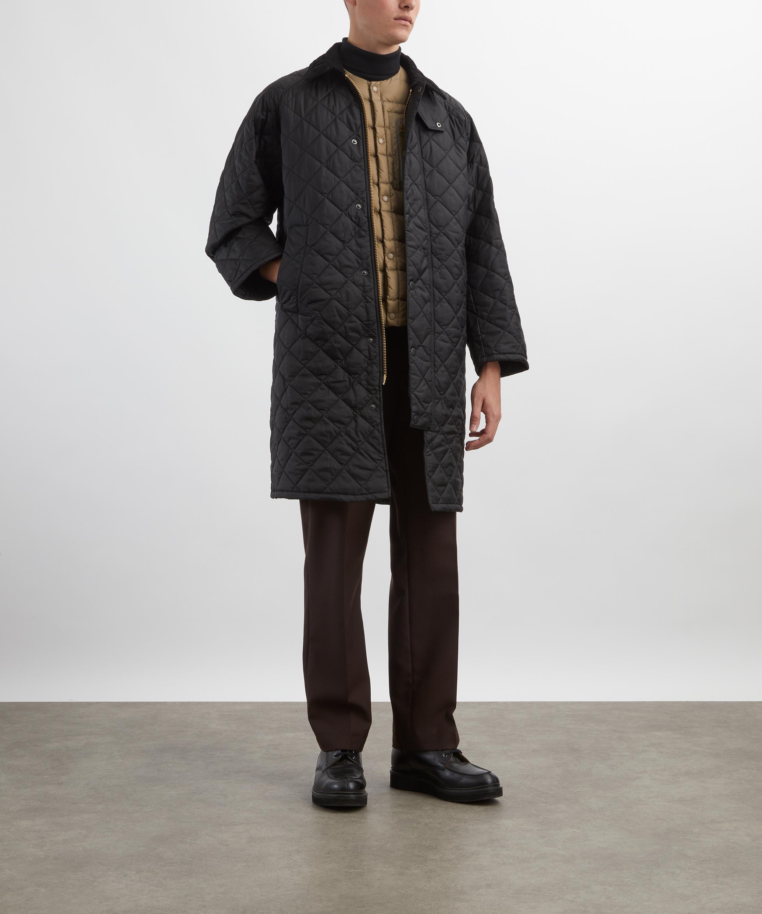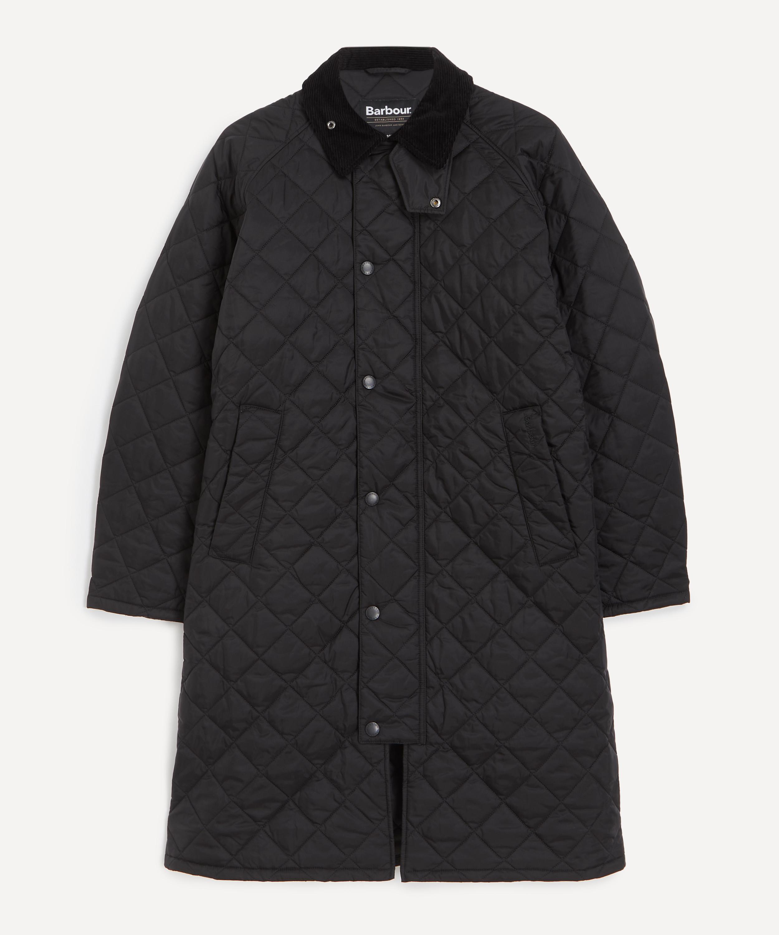 Inspired by the iconic Burghley jacket, the Barbour Exmoor Quilted Jacket reimagines classic outerwear with a modern, oversized silhouette and extended length. Crafted from Barbour’s signature diamond-quilted fabric, it features a soft corduroy collar, cozy handwarmer pockets, and stud-fastened back vents for added comfort and versatility.