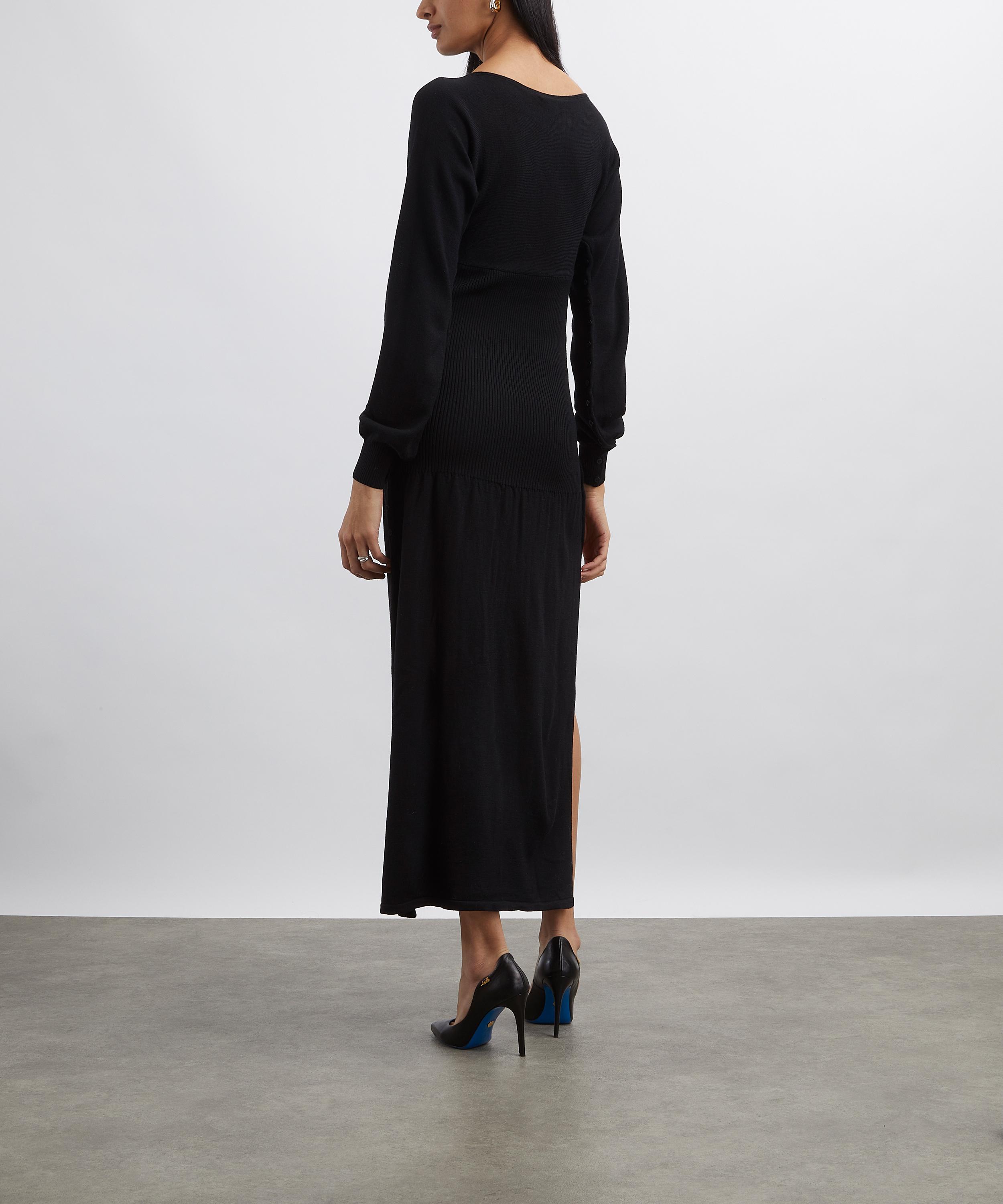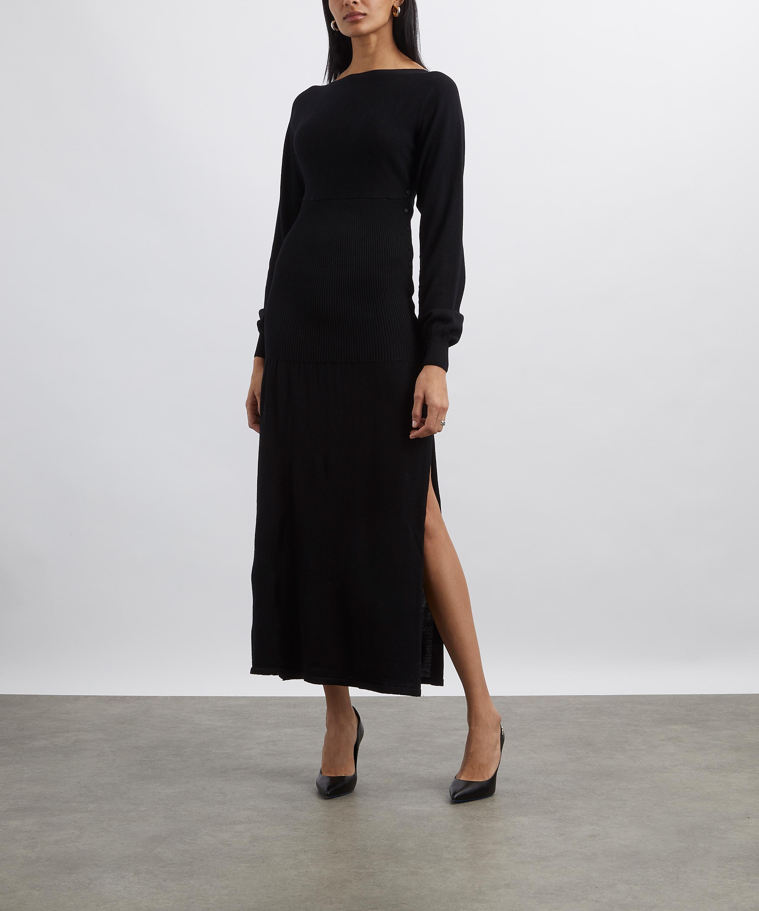 Constructed from pure Merino wool, this rib-knit maxi dress is designed for a close fit with a sleek boat neckline and long sleeves. Button detailing along the sides and sleeves offers versatile styling, making it a refined staple for both day and evening wear.
