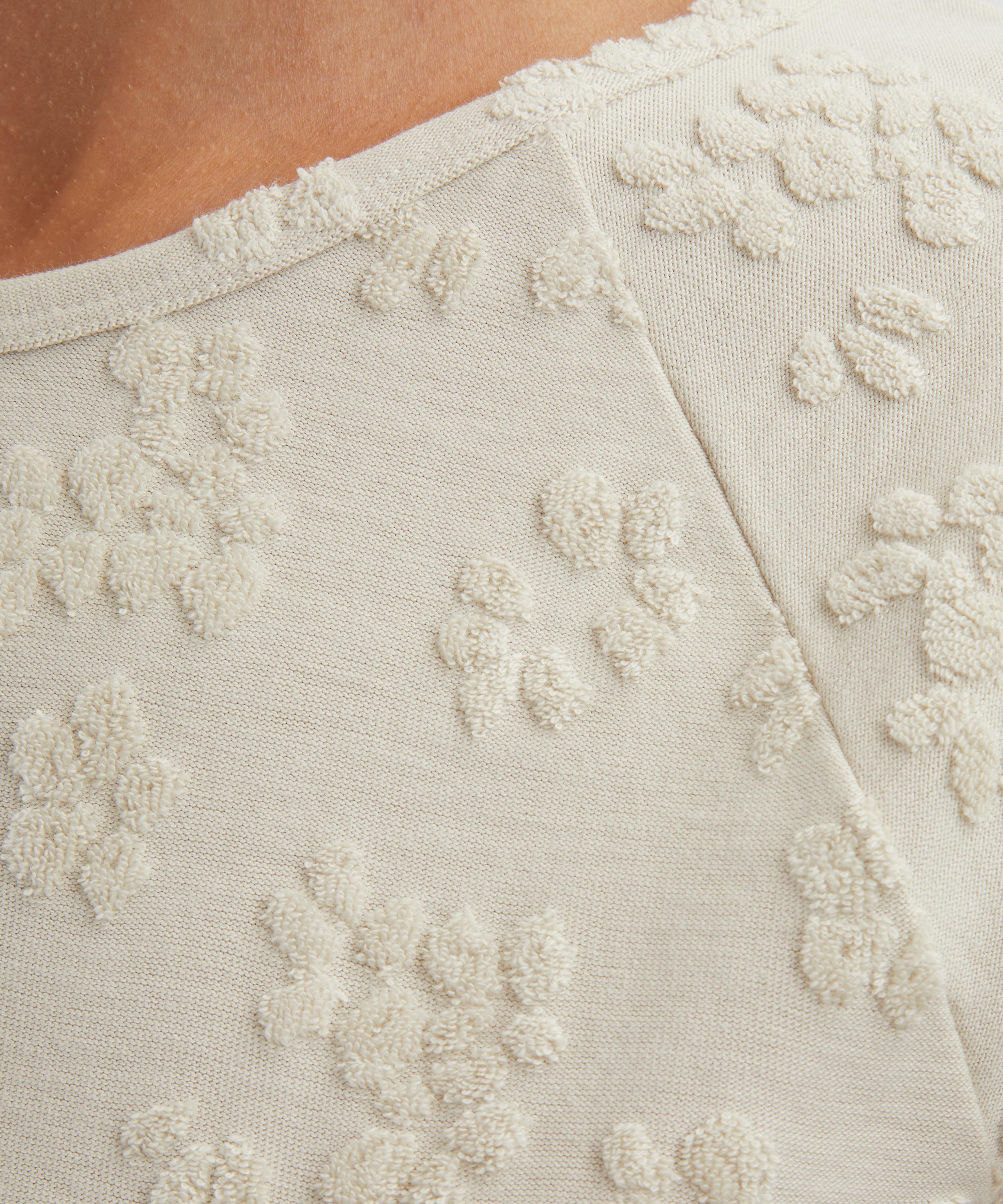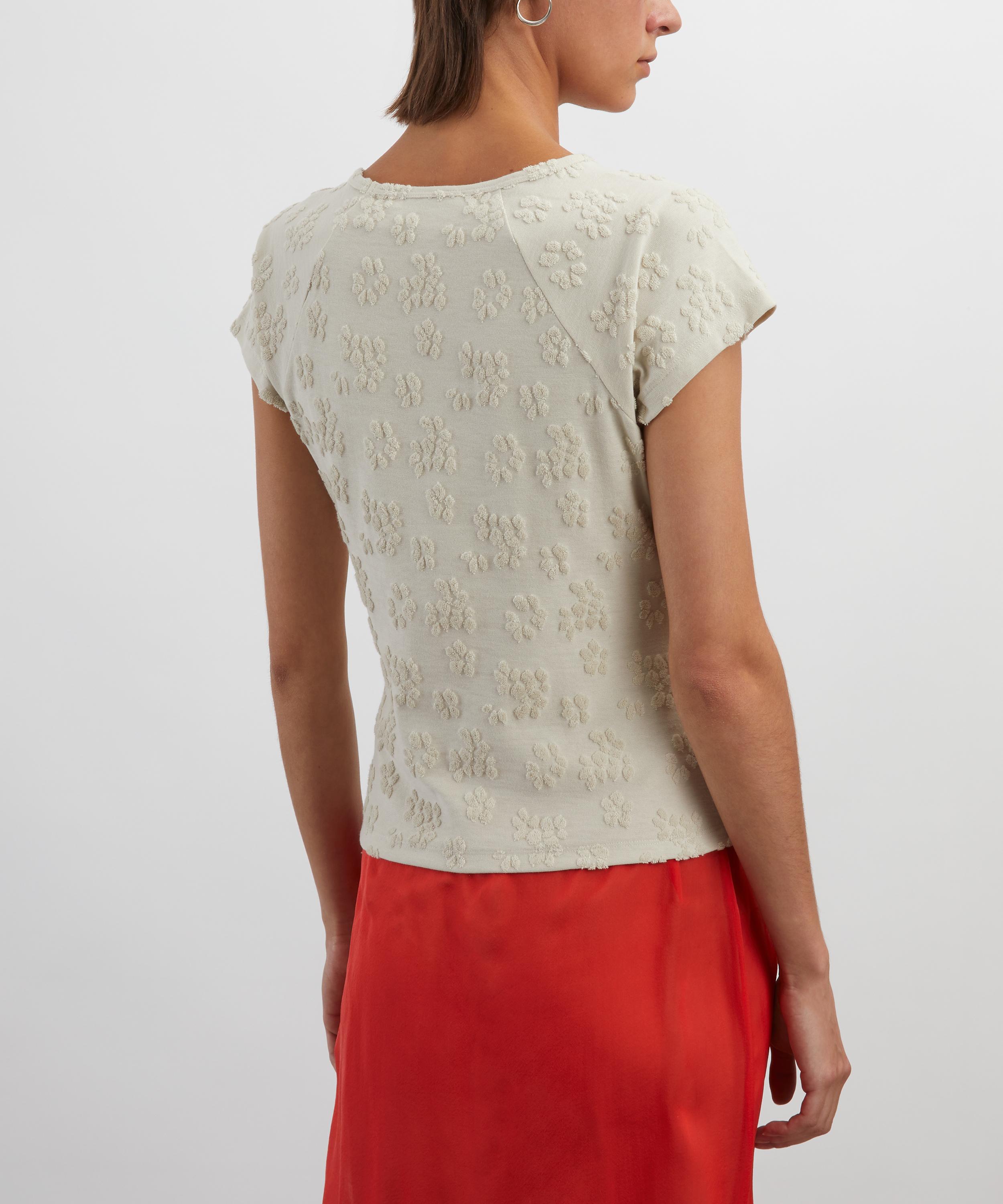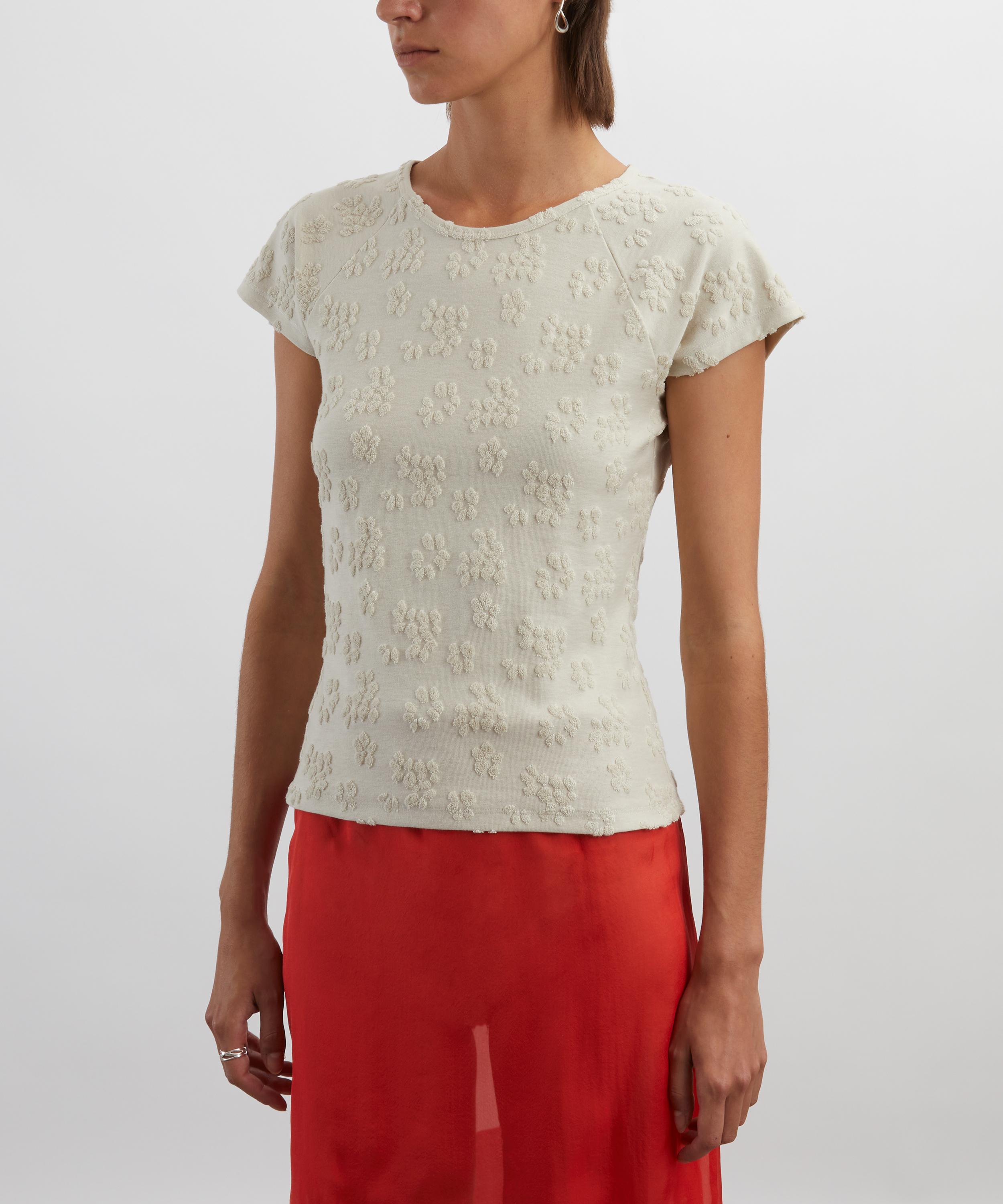 The Fabri Floral Jacquard Top, crafted from a floral jacquard terry-effect fabric, features a round neckline and short raglan sleeves, offering an elevated take on a summer staple.