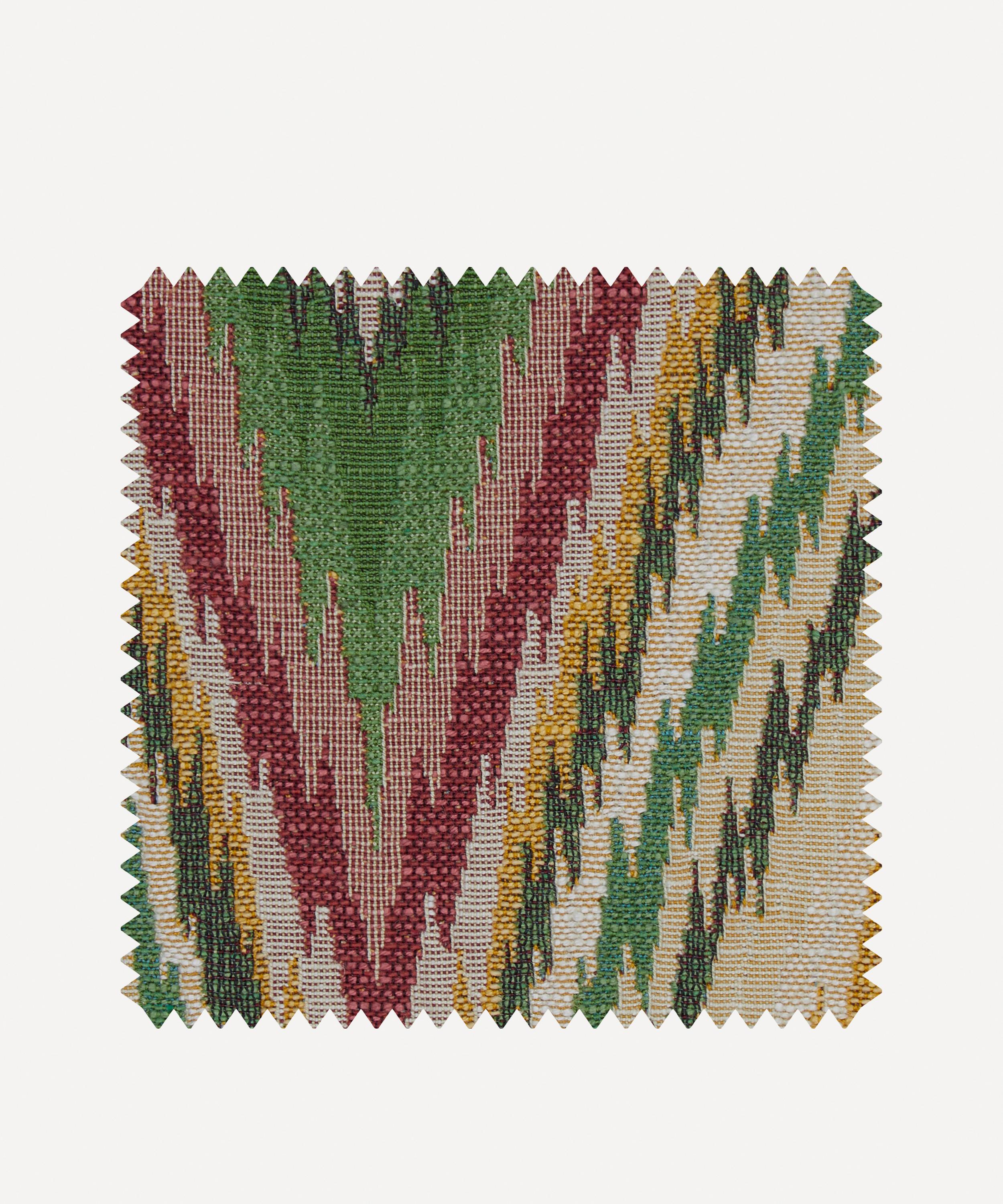 Bombazine is a contemporary interpretation of the historical flame stitch, a bold, often colourful zig zag pattern achieved through a combination of different weaving techniques. Popular during the 18th century amongst Europe and its colonies, this luxurious weave was developed for Liberty. Using textural yarns, coloured with rich hues from the design house’s signature colour palette, this beautiful coordinating fabric offers a vibrant graphic contrast to the collection’s intricate floral artworks. Ideal for light upholstery, drapery, cushions, and accessories.