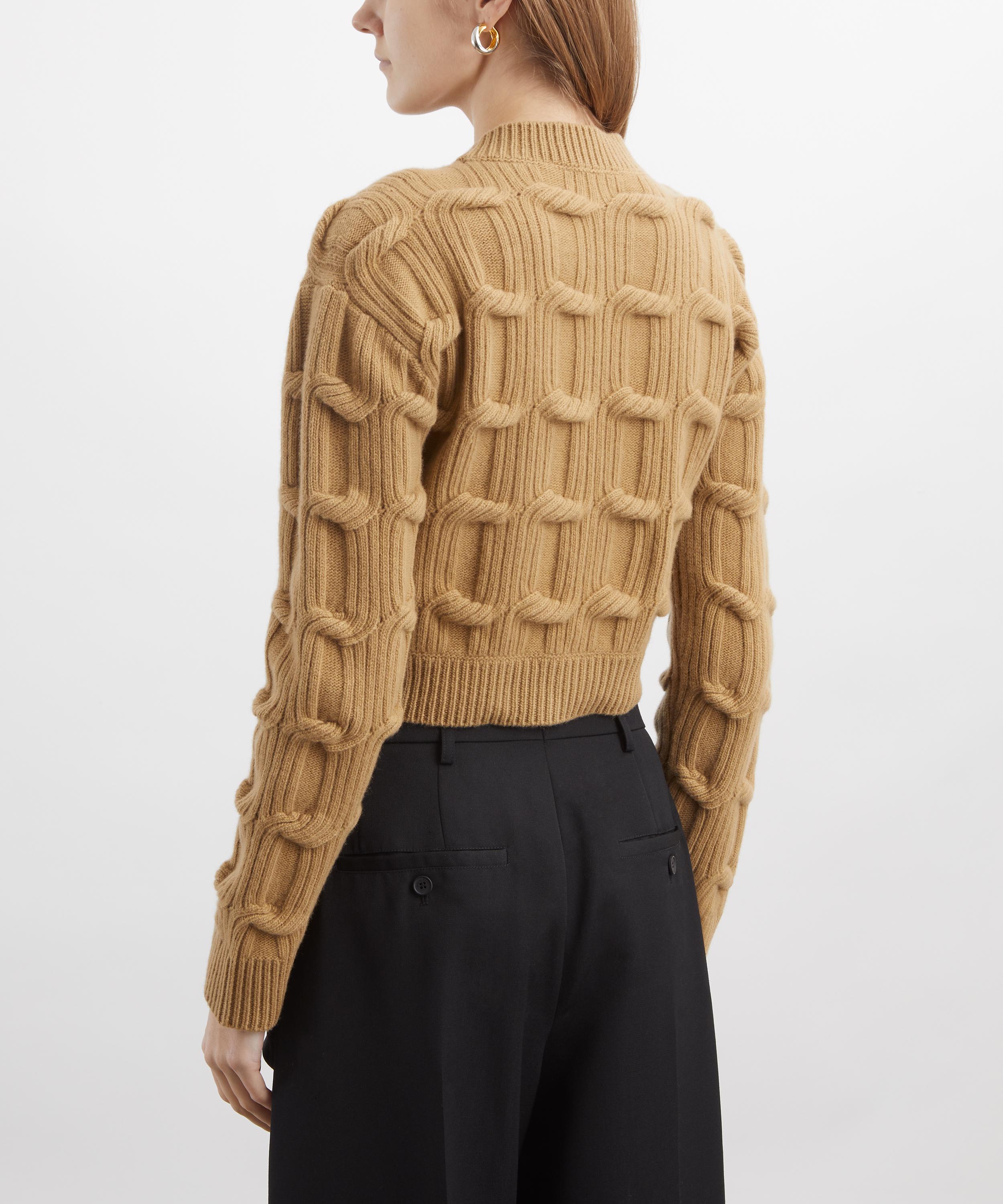 Handcrafted in Italy from luxurious virgin wool, this sculptural jumper features a striking cable-knit design inspired by Stella McCartney’s iconic Falabella chain. Finished with a classic crew neck and ribbed trims, the waist-length hem effortlessly complements high-waisted skirts or jeans for versatile styling.