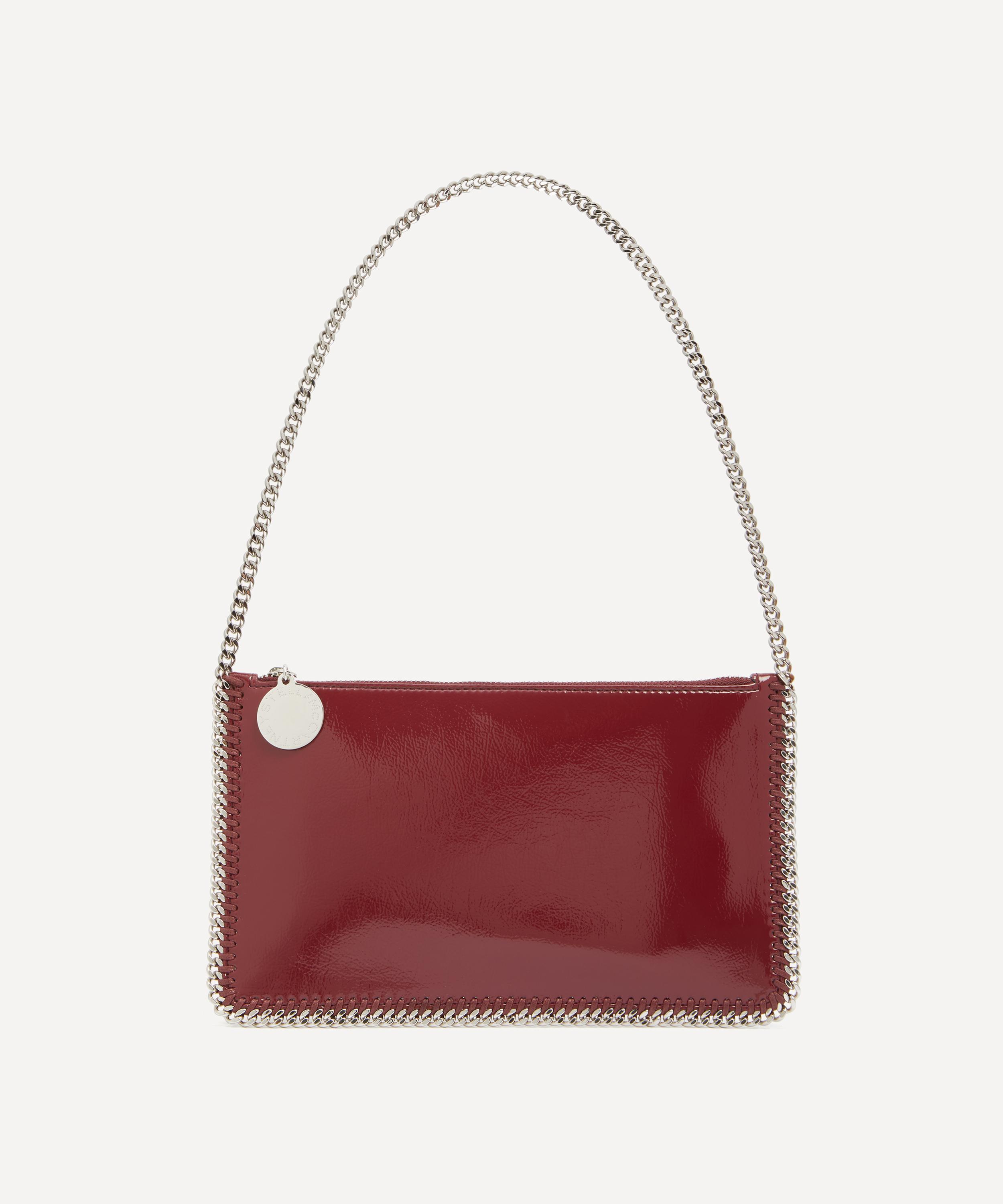 Presented in the brand's signature imitation leather with a glossy, crinkled patent finish, this versatile bag features a zip-top closure, a single shoulder strap, and an engraved logo charm, and is complete with the iconic diamond cut chain and whipstitch edging that characterises every Falabella style.