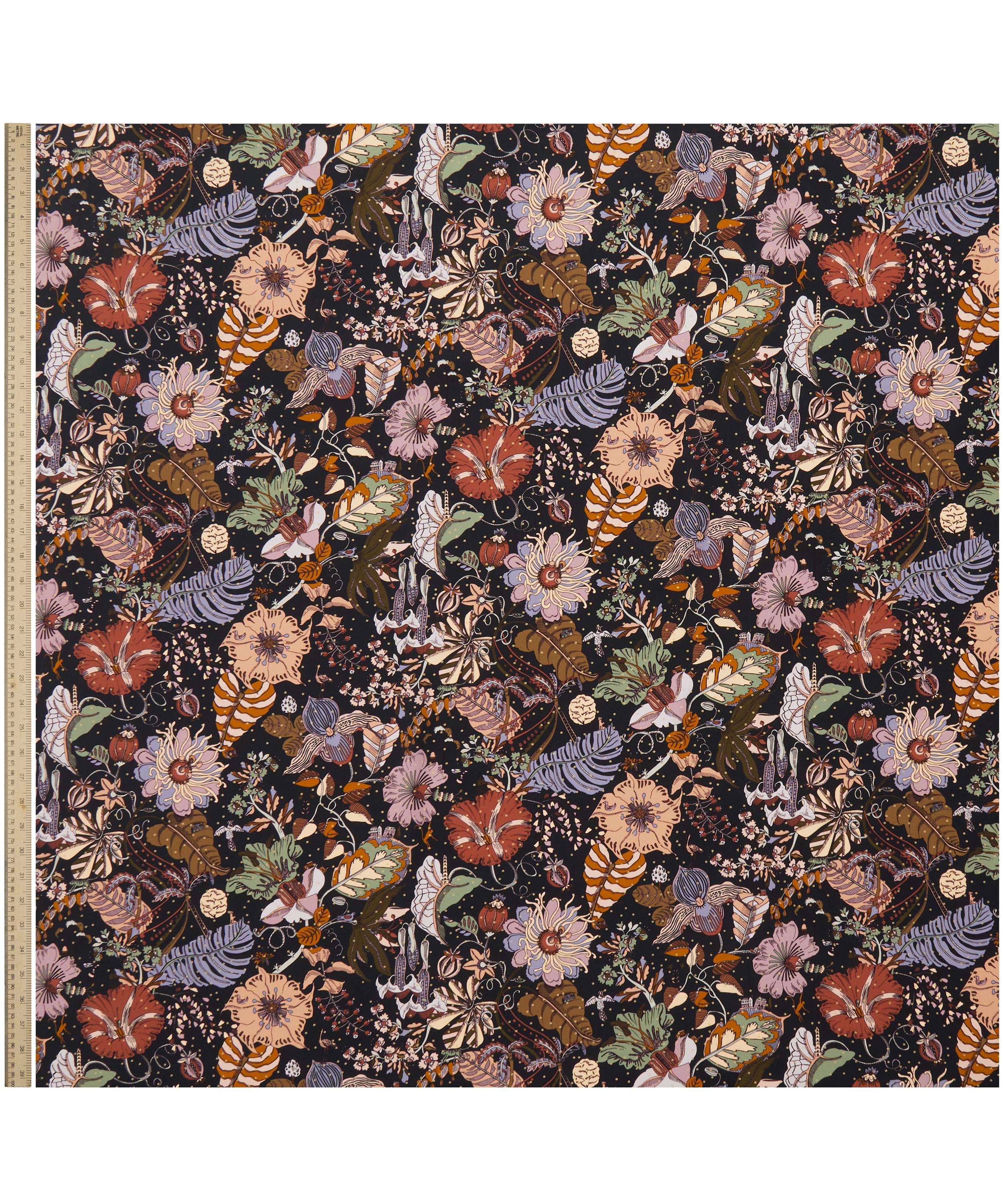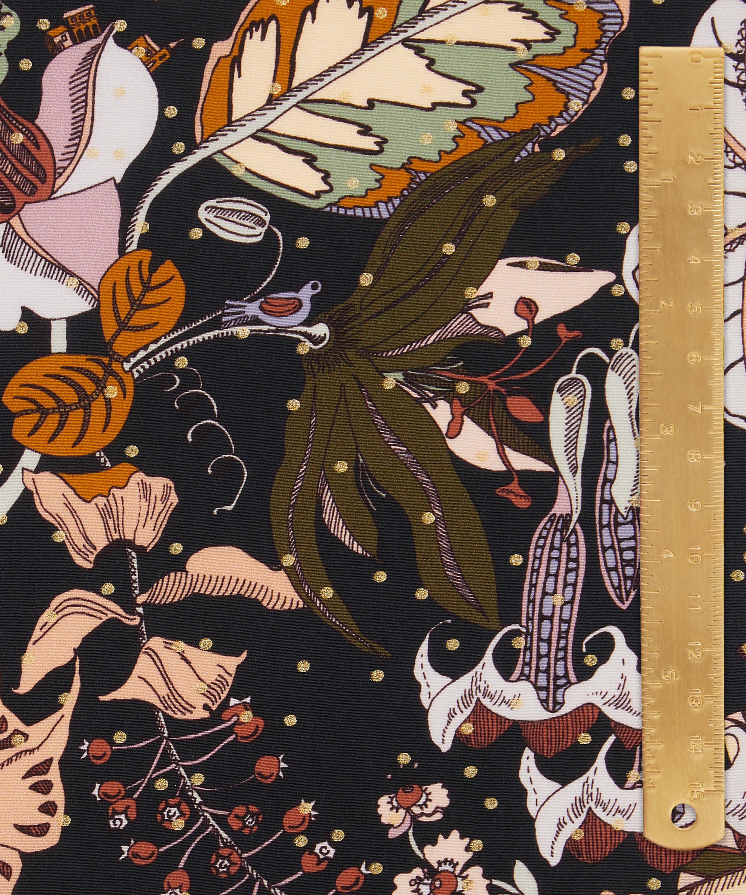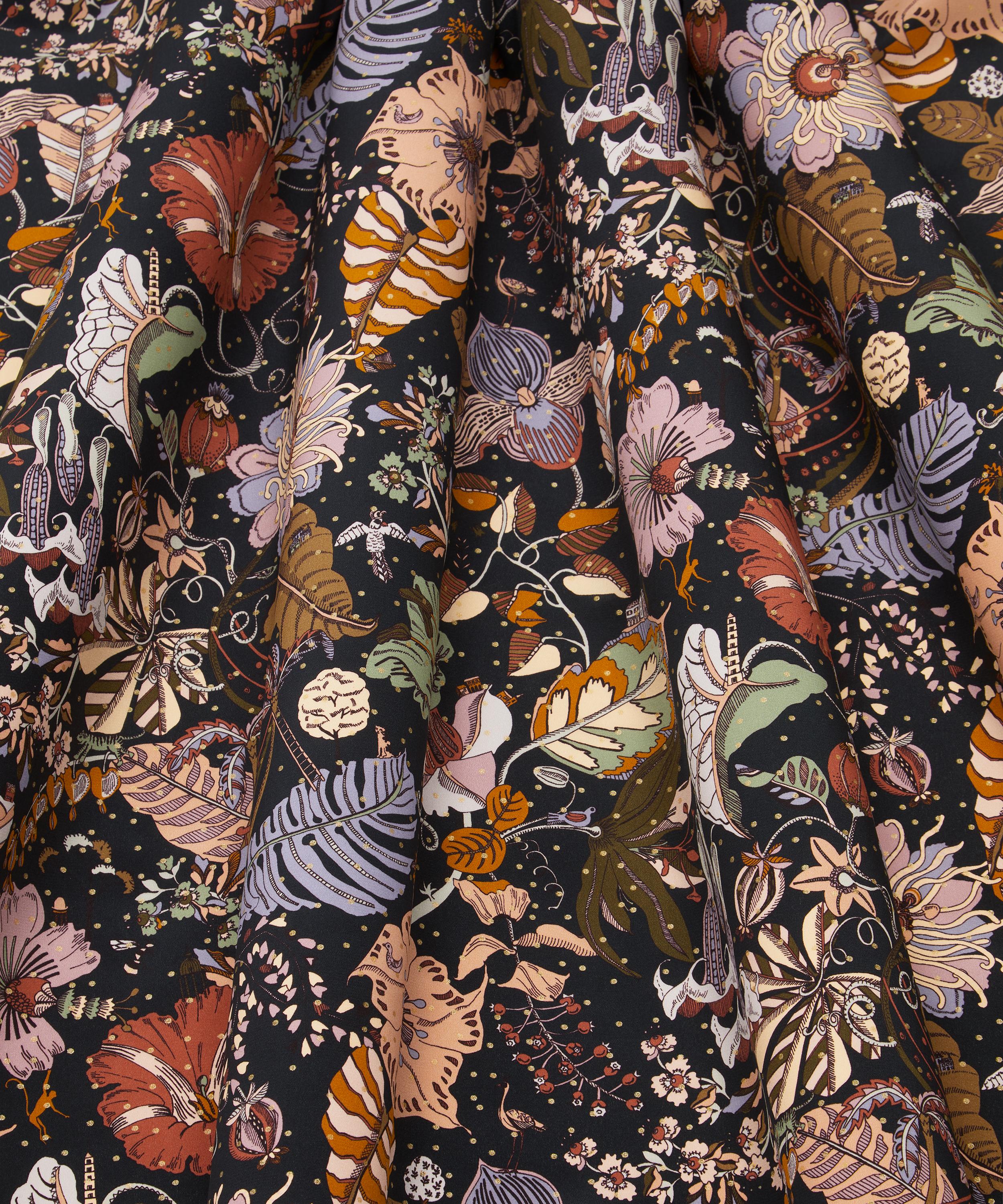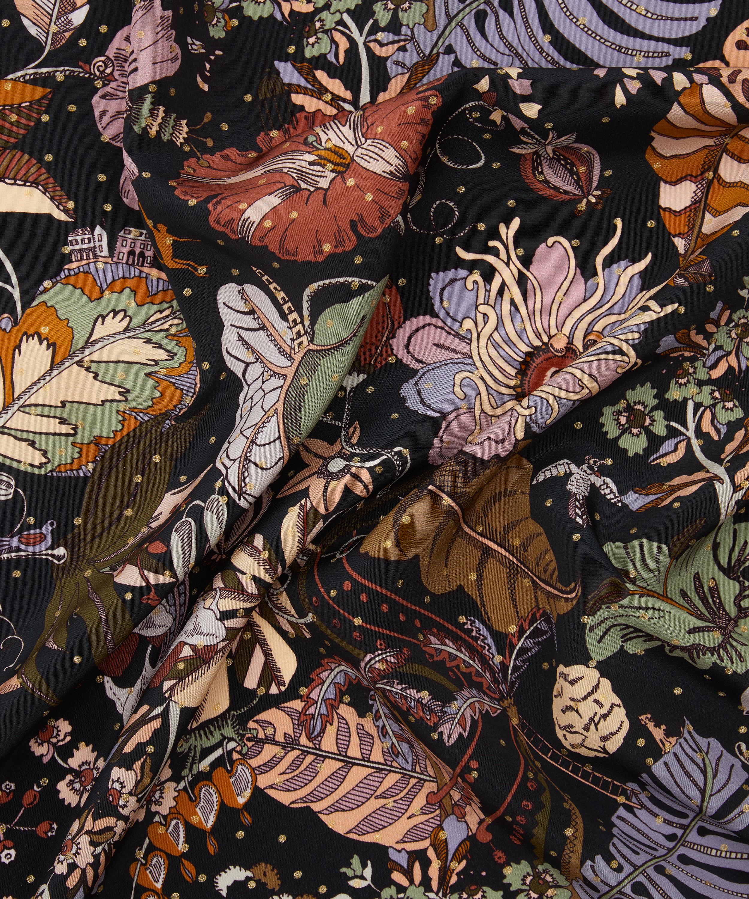 Designed and hand-drawn in fine liner in the Liberty studio, Fantasy Land offers a glimpse of a fantastical world of giant tropical poisonous plants inspired by Kew Gardens – with miniature animals, tiny glasshouses, and spiralling staircases hidden in the foliage. Now featuring beautiful shimmering details, Fantasy Land Metallic has been reimagined to add a contemporary metallic spot overlay.